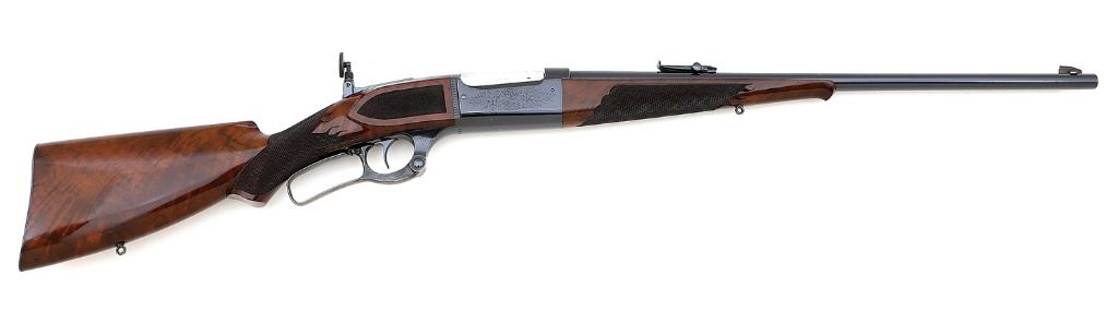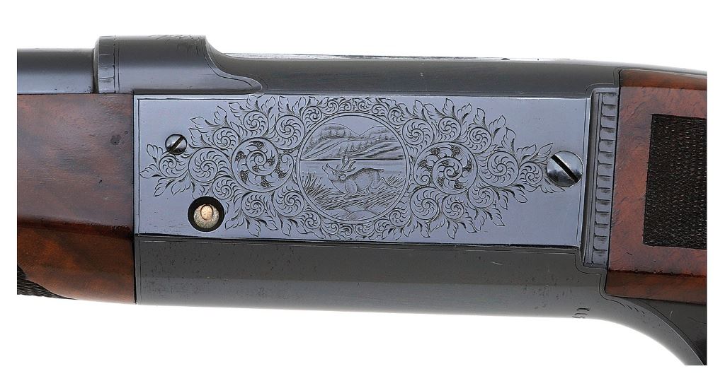 serial #54411, 303 Savage, 23'' round barrel with a bright excellent bore. This is a very attractive, high grade and high condition rifle with many special-order features. In addition to the engraving the rifle features a shorter than standard barrel, ''B'' style factory checkering and an ultra rare factory cheekpiece. The sides of the action show round panel scenes of a falling buck left with mountainous background and a running doe right with a wooded background both surrounded in incise and relief scroll. The top of the chamber shows a floral spray, similar to a sunburst pattern. The condition of the rifle is spectacular with the metal surfaces retaining 98% bright glossy original blue finish overall. The lever retains 95% original color case hardened finish which remains quite vivid in most areas. The stocks are checkered in the ''B'' style with fancy scalloped and flame borders along with a more finely checkered panel on the top of the wrist. The left side of the stock shows a lovely shadow line cheekpiece which has a lovely appearance accenting the classic perchbelly profile of the stock. The stocks are of highly figured American black walnut and rate excellent with 98% original finish remaining and showing just a few light handling marks here or there. The smooth steel shotgun buttplate retains 90% original bright glossy blue finish. The rifle is equipped with sling eyes which are factory original with the forward eye doubling as the forend screw. The rifle is sighted with a beaded blade Rocky Mountain front, Savage 21B Micrometer rear sight with hand screws along with a Lyman 2A tang mounted peepsight. The rifle is featured on pages 51 and 52 of David Royal's Savage Book, Volume 2. An extremely rare, high condition and beautiful Savage rifle formerly of the famous Wes Adams Collection. (1E11759-1) {C&R} (20,000/30,000)
