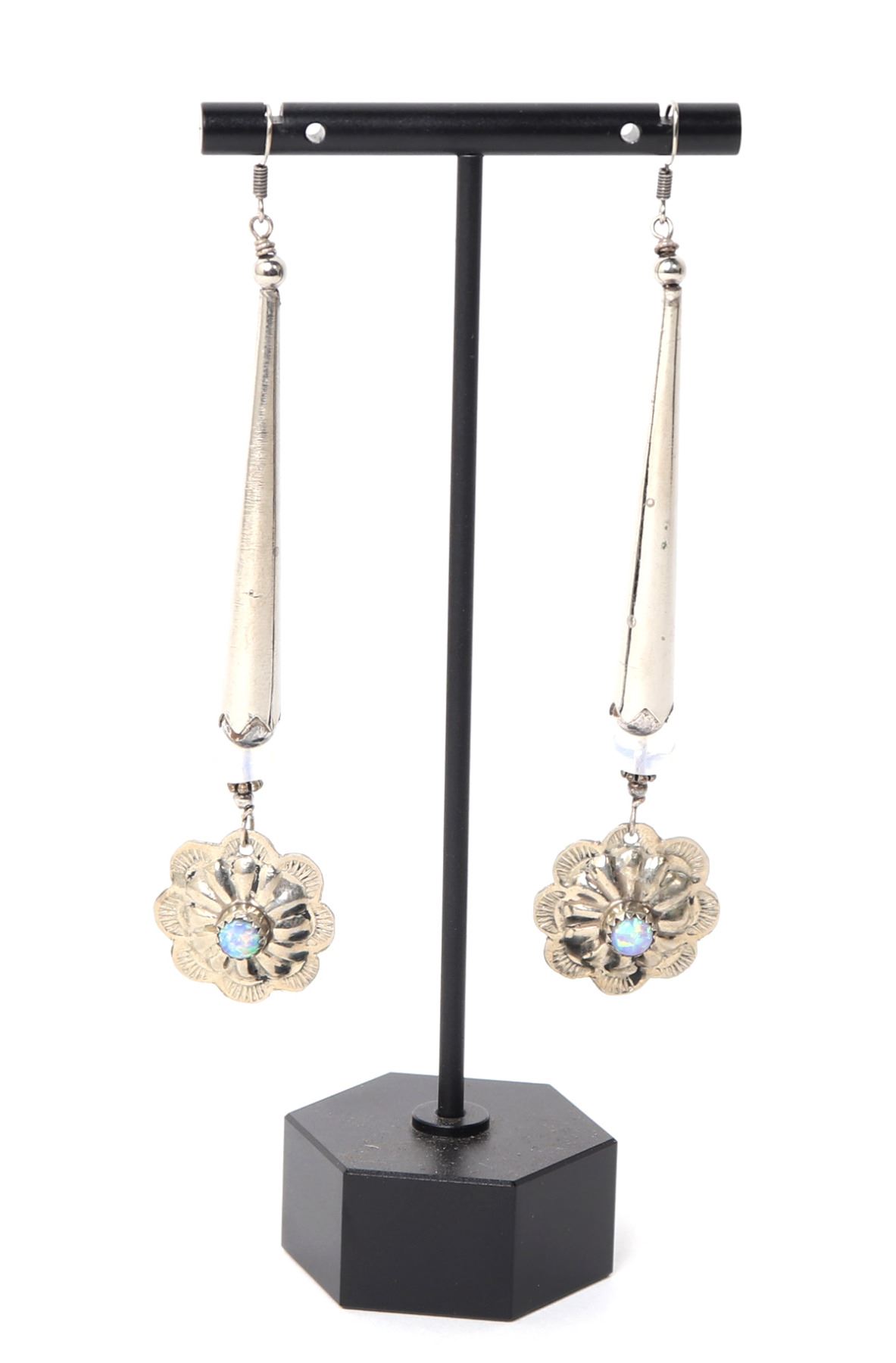 Handmade sterling silver drop earrings with fire opal centered flowers. Lightweight with exquisite details throughout. Size 3 1/2" H. Condition: Wonderful wearable condition.