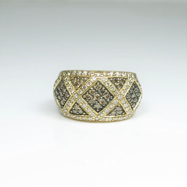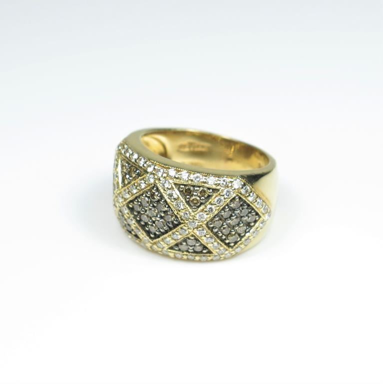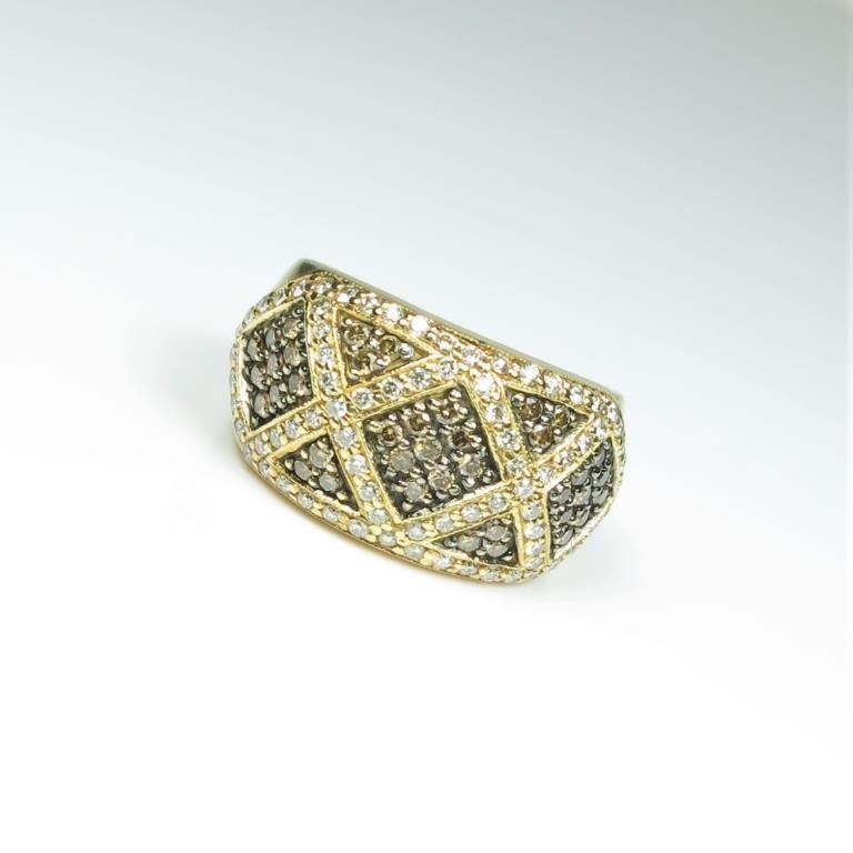 featuring a dramatic combination of White and Champagne Diamonds set in a geometric pattern pave set with approx. 200 Diamonds total. White Diamonds have G-H colors and VS clarity approx. total weight 3.00 carats set in 14 karat yellow gold. Retail $5,000-$6,000