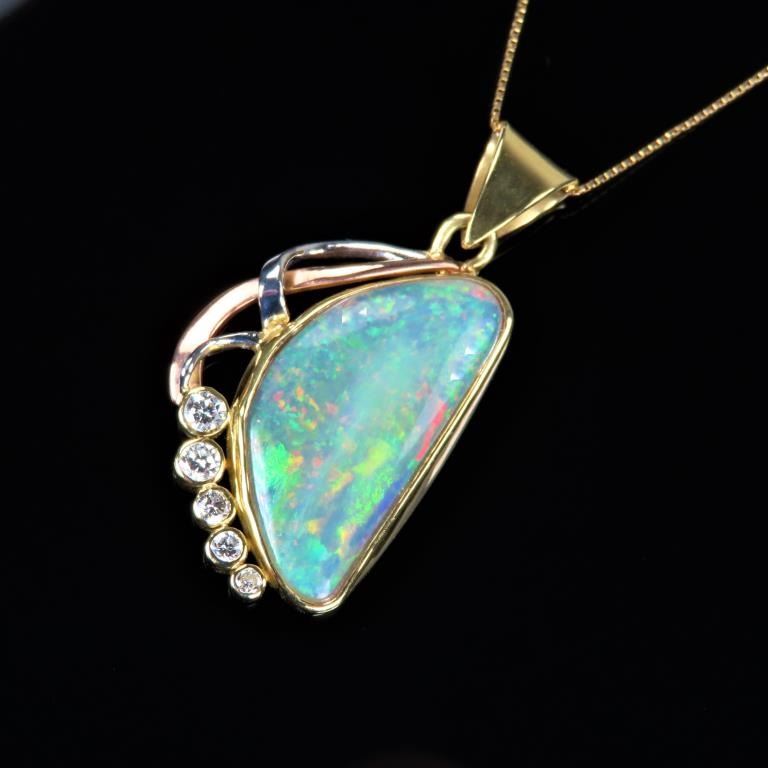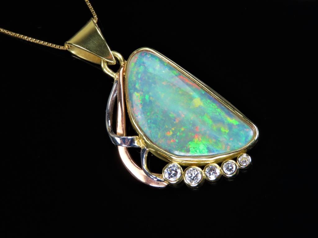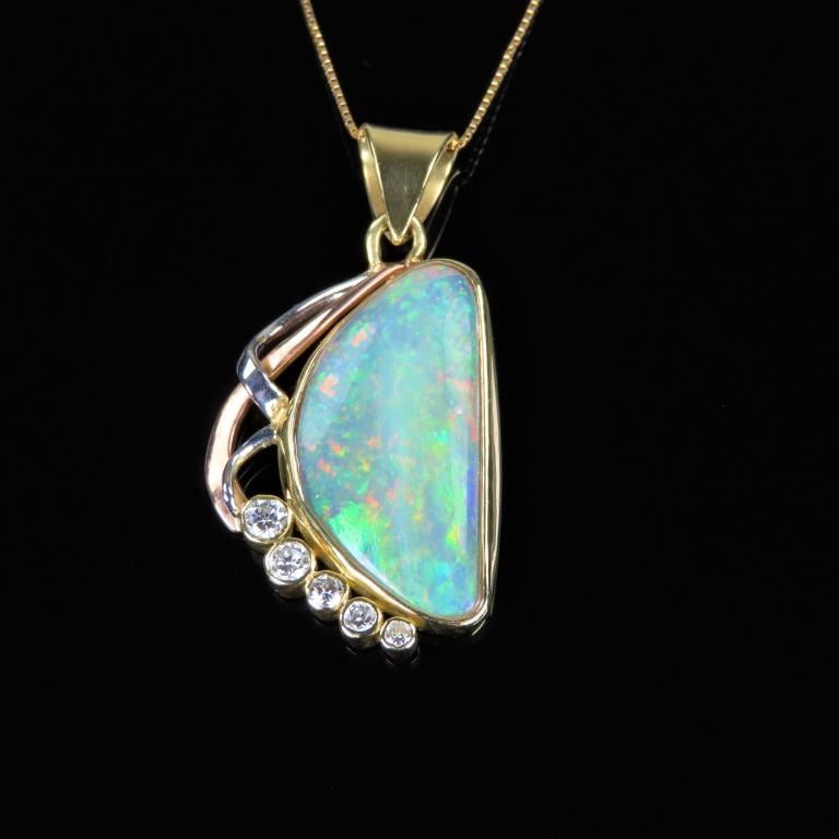 featuring a bezel set Natural Australian Opal weighing approx. 10.00- 12.00 carats with fine Red, green and Blue pintail colors and bezel set with five graduating round Diamonds weighing approx. 0.25 carats with G-H colors and VS clarity set in a custom made 18 karat white, yellow and Rose gold combination. Estimates Retail $6,000-$8,000