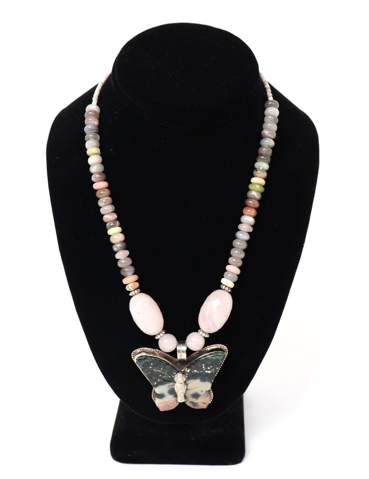 Wonderful natural raw Rhodonite butterfly perfectly shaped into a beautiful butterfly. Surrounded by dozens of precious gem stones throughout, with beautiful coral and shell beads at the clasp. Size 18" L, butterfly 2 1/4" W. Condition: Wonderful wearable condition throughout.