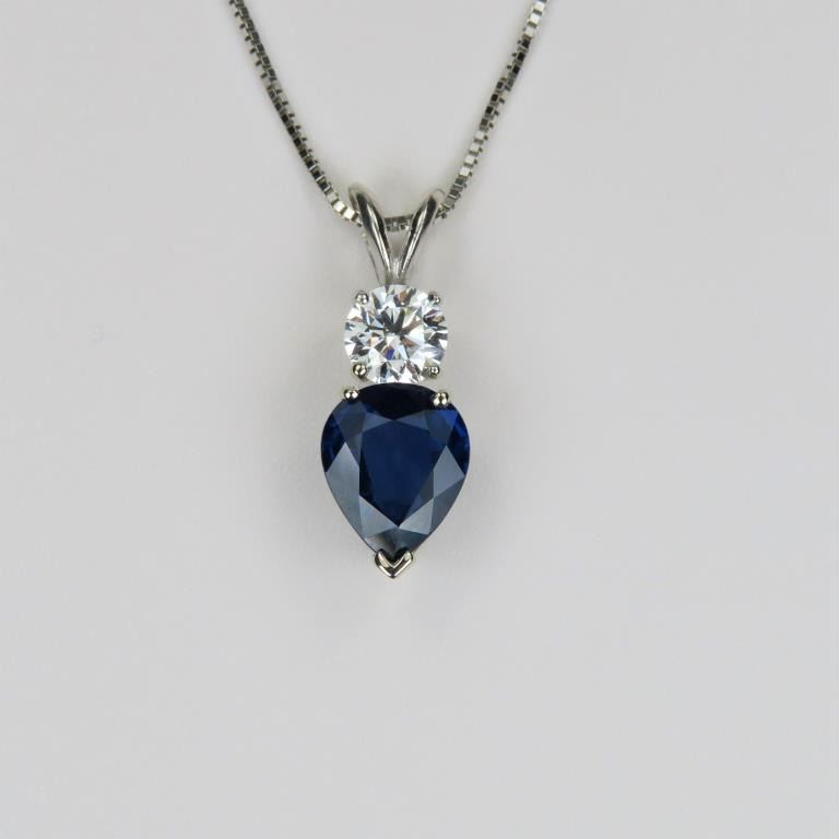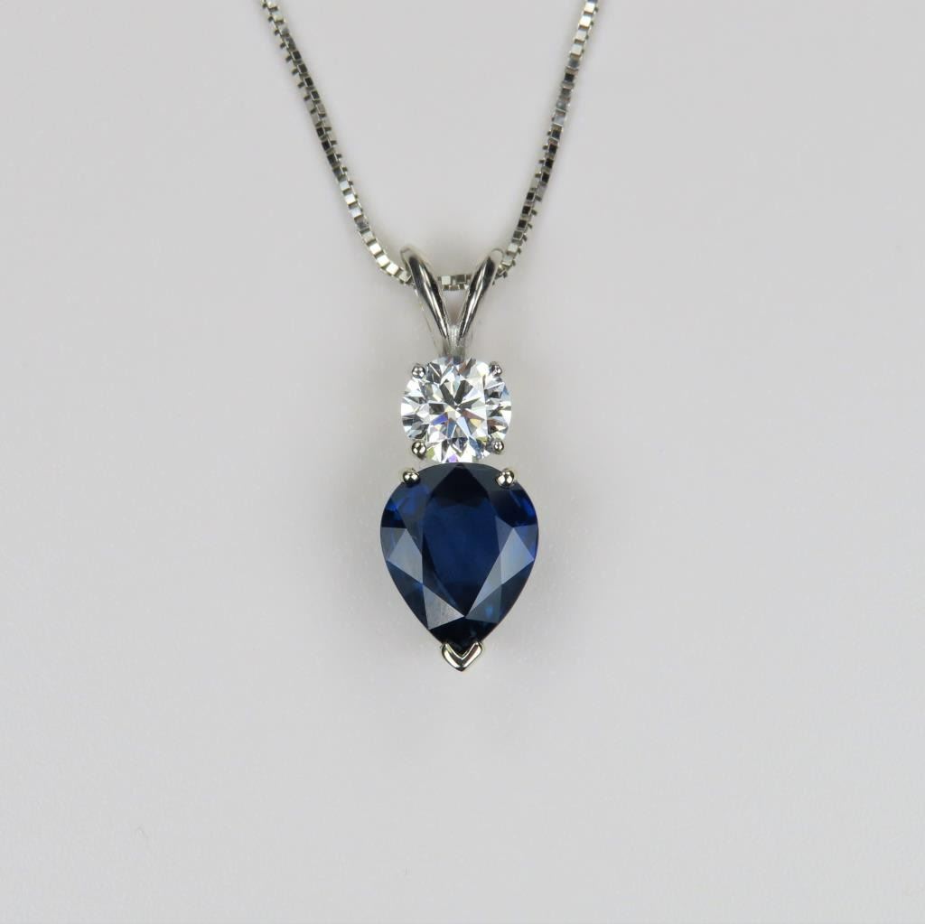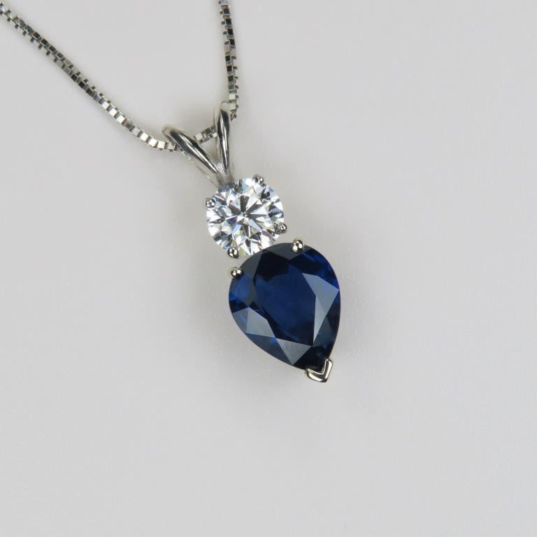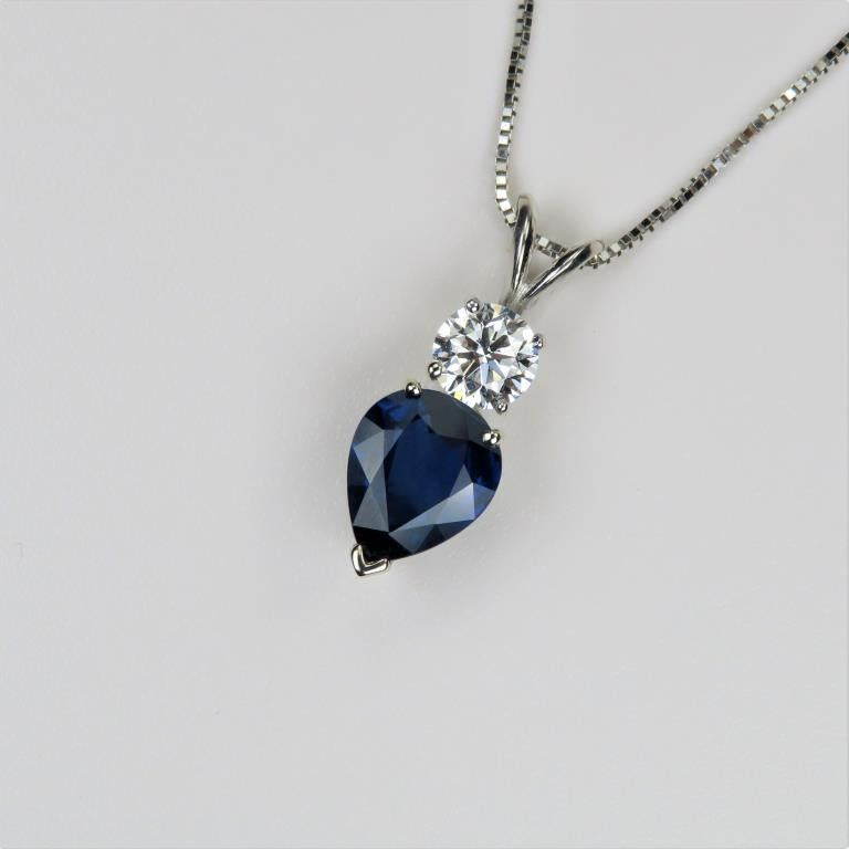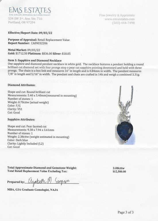 featuring a pear shaped Sapphire weighing 2.38 carats with rich, velvety Blue color accented with a round ‘IDEAL’ cut Diamond weighing 0.70 carats with F-G colors and VS clarity set in a 14 karat white gold custom setting. Full Appraised Value - $12,500.00