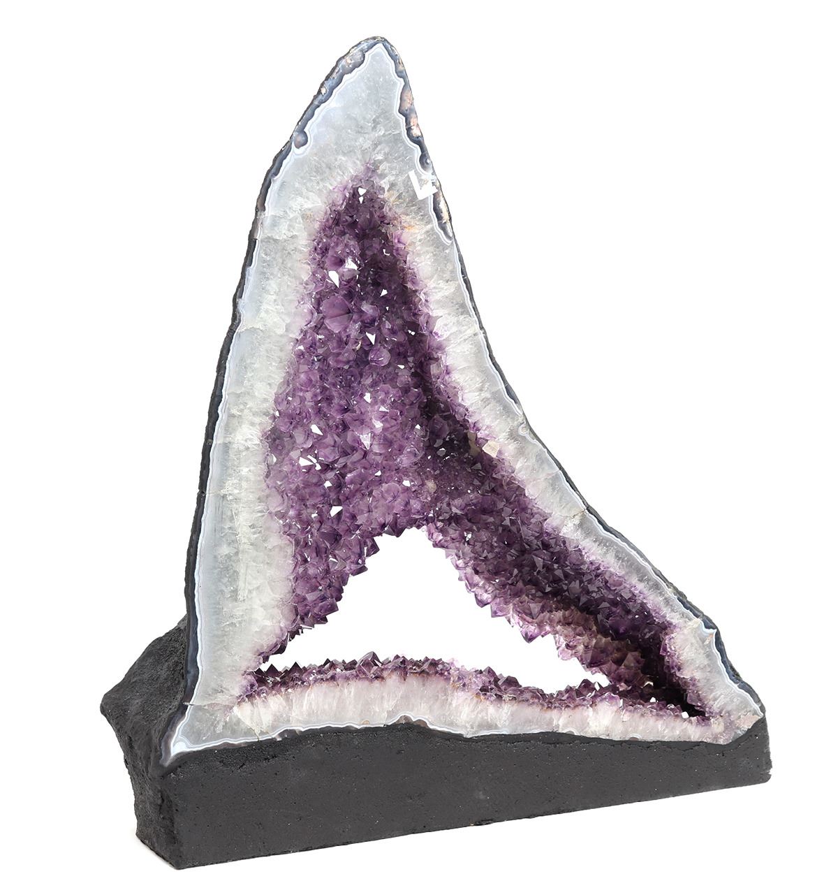 Measuring nearly two feet tall, this incredibly preserved amethyst mineral geode cluster is incredibly one of a kind. Dark purple terminating clusters throughout with a window through the middle, arching upwards with a lovely crystal white outline. Size 21 5/8" H x 19 5/8" W. Condition: Wonderful condition throughout.