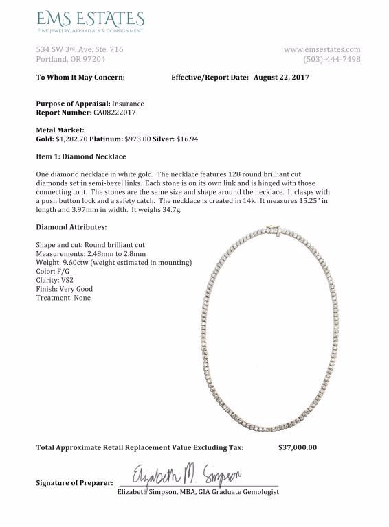 Stunning ladies Diamond Riviera necklace featuring 128 round diamonds weighing approx. 10.00 carats of F-G colors and VS clarity set in 14 karat white gold setting heavy setting. Please see Full Appraisal at$37,000.00 Estimates $15,000-$20,000