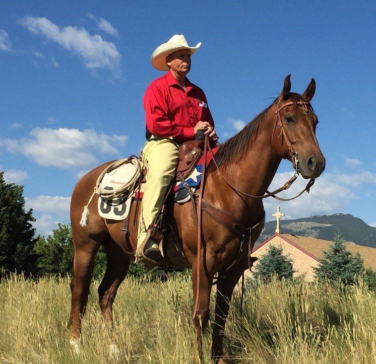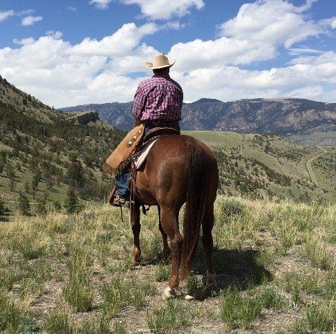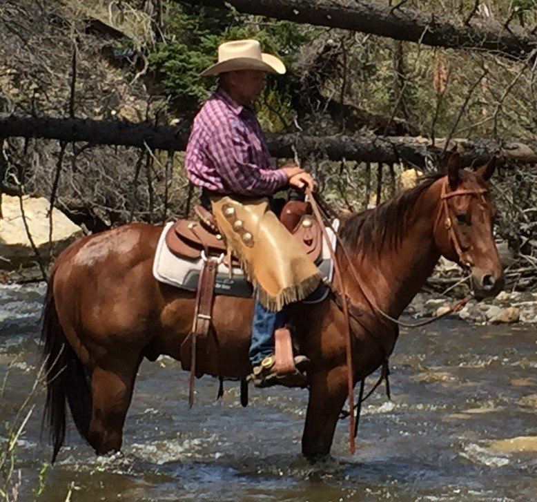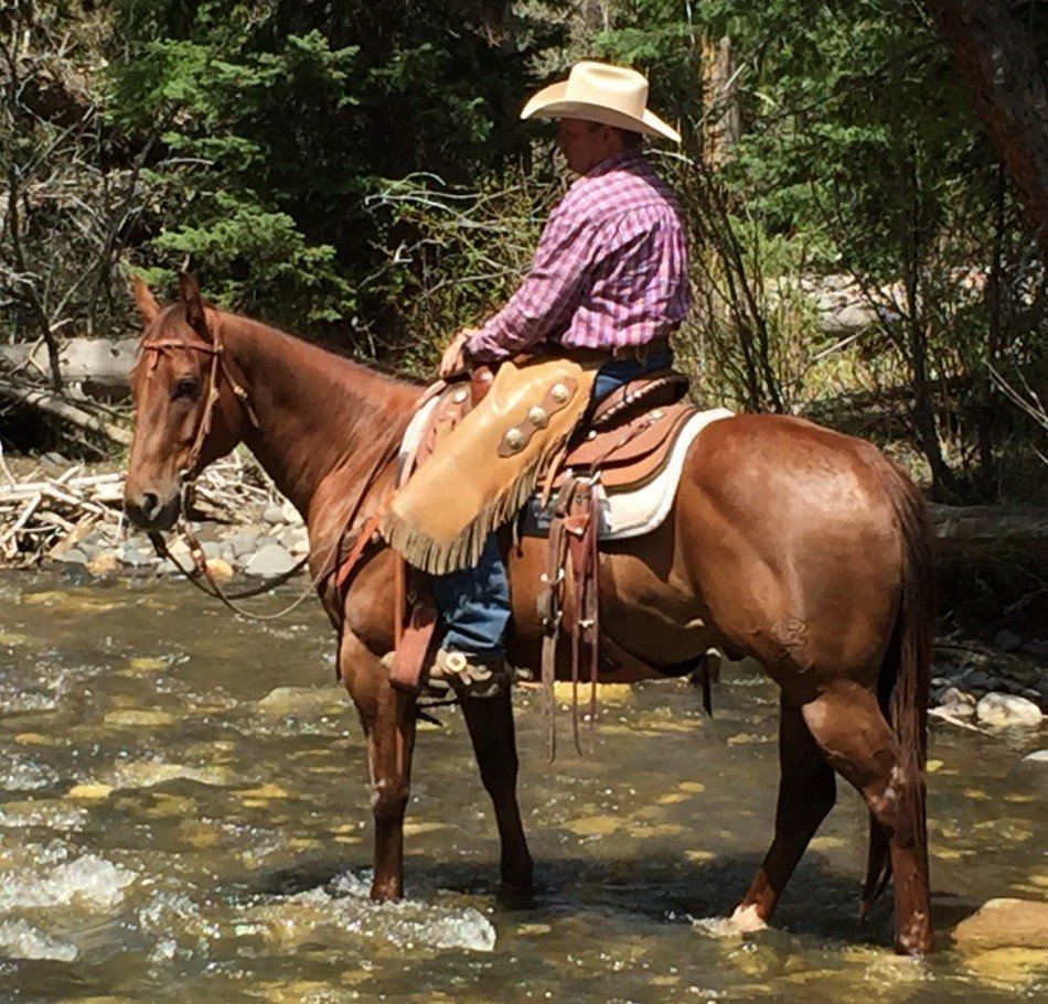 Romeo is a gentle, quiet, all-around wyoming ranch and trail gelding. He's been ridden many miles on narrow mountain trails, used to gather, sort and drive cattle. He is a horse that loves to go to work for you. Whether he is leading a big pack string in the mountains, roping and doctoring cattle, moving bulls with a flag or driving and handling colts in the round pen - there is simply nothing you cannot do on this horse. He will carry a flag and has been used as Bill's outrider horse in large parades, nothing phases this horse, he is as solid and trustworthy as one can be. He is extremely well broke, really walks out nice and travels well all day long. Bill has used romeo as his main horse to start colts and handle unruly horses using natural horsemanship techniques. He has a lot of heart and try to him especially when things get western. He will fit most levels of riders but we would not recommend him for young children or beginners. Romeo is easy to catch, load, shoe, clip, bathe and trailer not to mention just fun to be around. His pedigree reads like the Who's-Who of the cow horse world, ones like him are hard to find and take years to make.