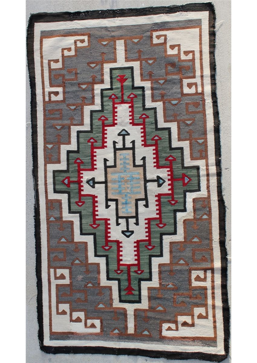 Navajo Regional Rug, with a terrific pattern with teal green and arrows 66" x 36".