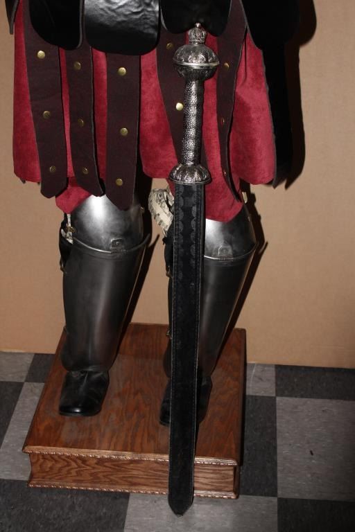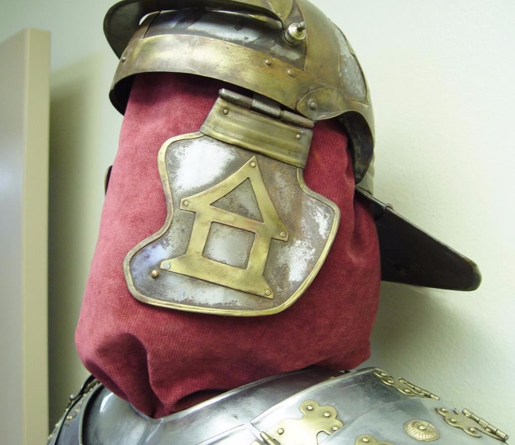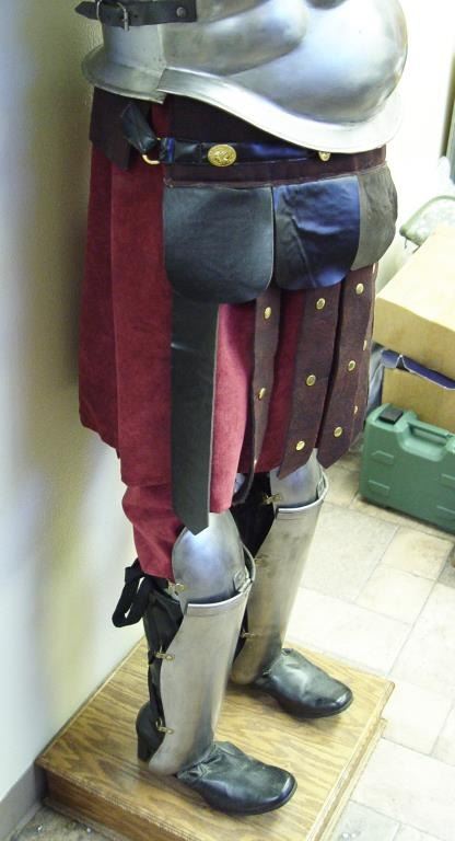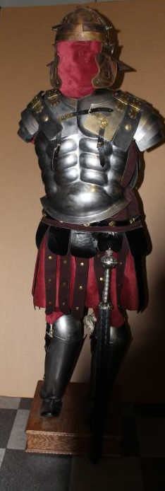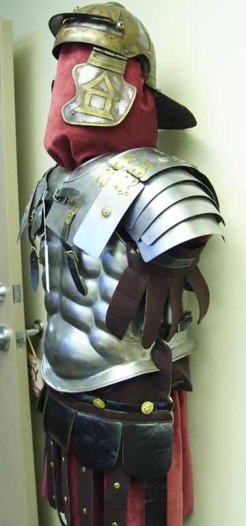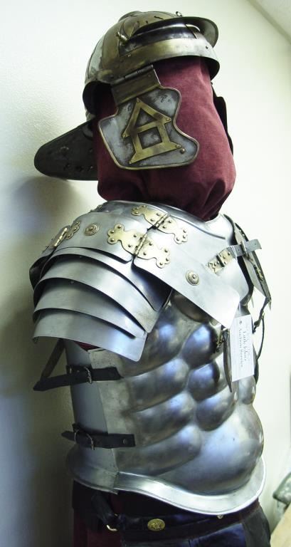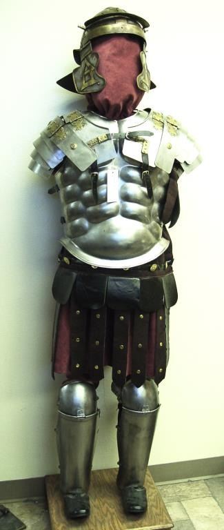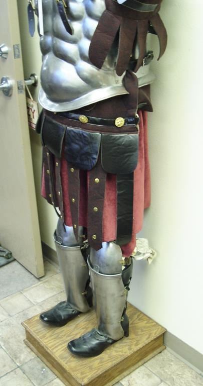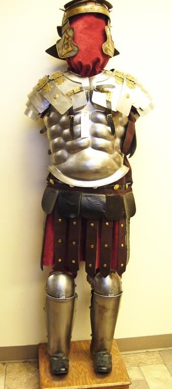 Suit of Greek Armor made for Movie Production, ca. 1950s-60s; very good helmet and well formed; brass on steel, would improve with period sandals. On display stand. Est.: $800-$1,600.