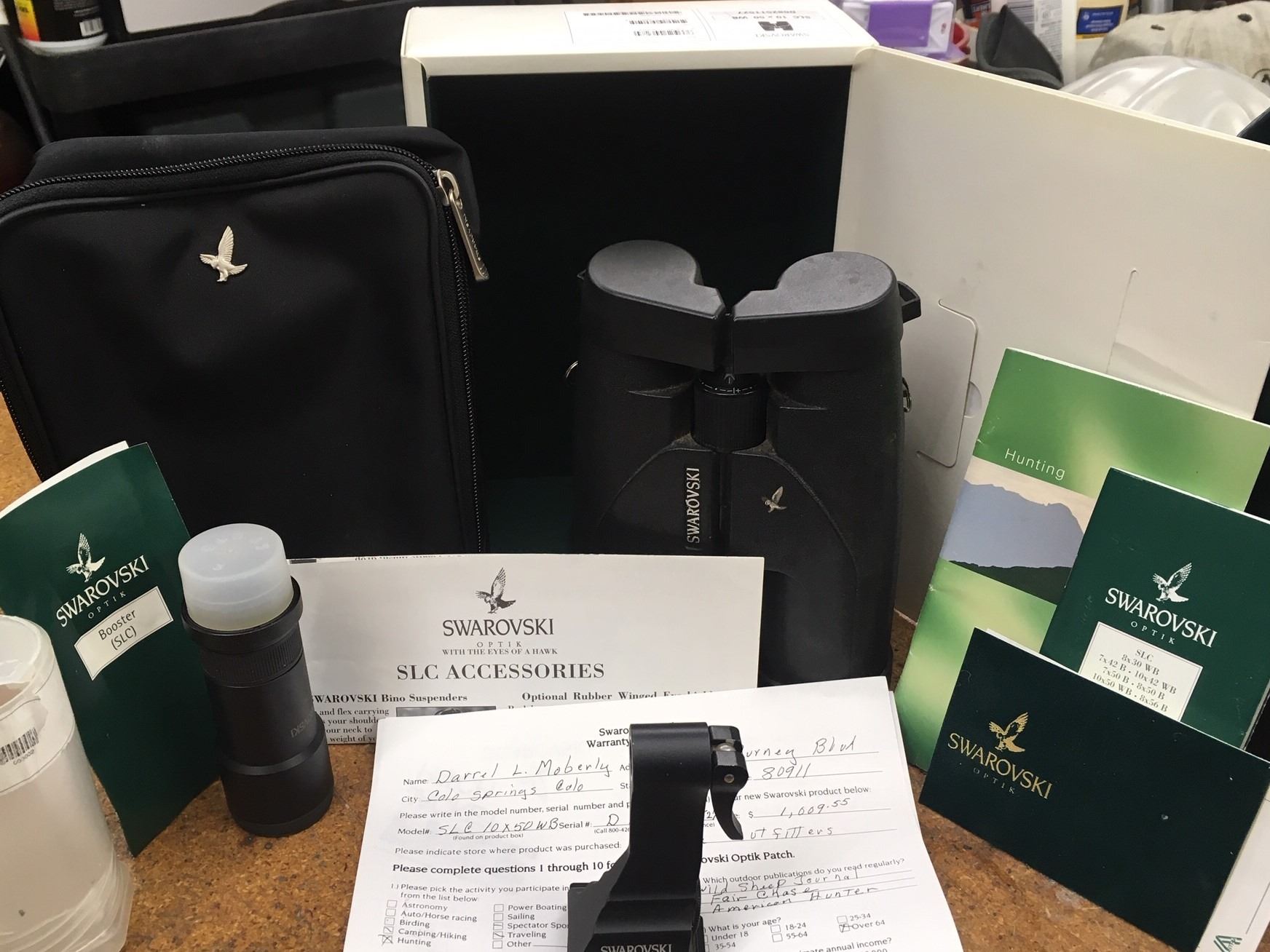 These Swarovski SLC 10 x 50 WB binoculars were donated from the estate of Darrel L. Moberly, long time RMBS member and wild sheep supporter who completed his Triple Slam in 2005. The binoculars were purchased in 1998 but are out of the box new. There is a Swarovski tripod adapter, 2X booster lens, harness, case and original paperwork, and original box are included as a full donation.