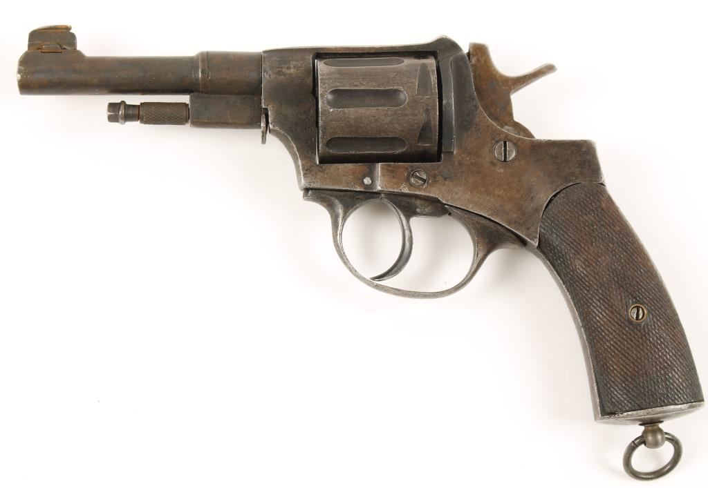 Blued double-action 7-shot revolver with a 3-7/8" barrel. Finish has faded to a mottled patina with scratches and dings. Bore is dark with rifling and chambers are dirty. Functions well. Checkered wooden grips are dark, worn and have shrunk below the frame line. Condition is fair. *Modern Firearm*