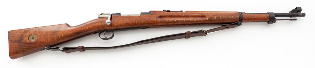 Swedish Model 38 Mauser Bolt Action Rifle, #654877, 6.5x55mm cal., 24'' barrel, blued finish, hardwood stock, blade front sight with attached sight hood and adjustable folding leaf rear sight. Marked on receiver ring ''HUSQVARNA VAPENFABRIKS AKTIEBOLAG 1942''. Matching numbers except on buttplate. Stock disc with barrel condition information attached. No range correction chart on stock. Commercial muzzle protector attached. Includes cleaning rod and Swedish leather military sling. Condition overall is very good with over 95% finish remaining on metal surfaces, with some light thinning at the muzzle. Stock has been sanded smooth and a satin type finish applied. Action is smooth, bore is excellent with sharp rifling. Import stamped on right side of barrel. Est.: $400-$600. (C&R)