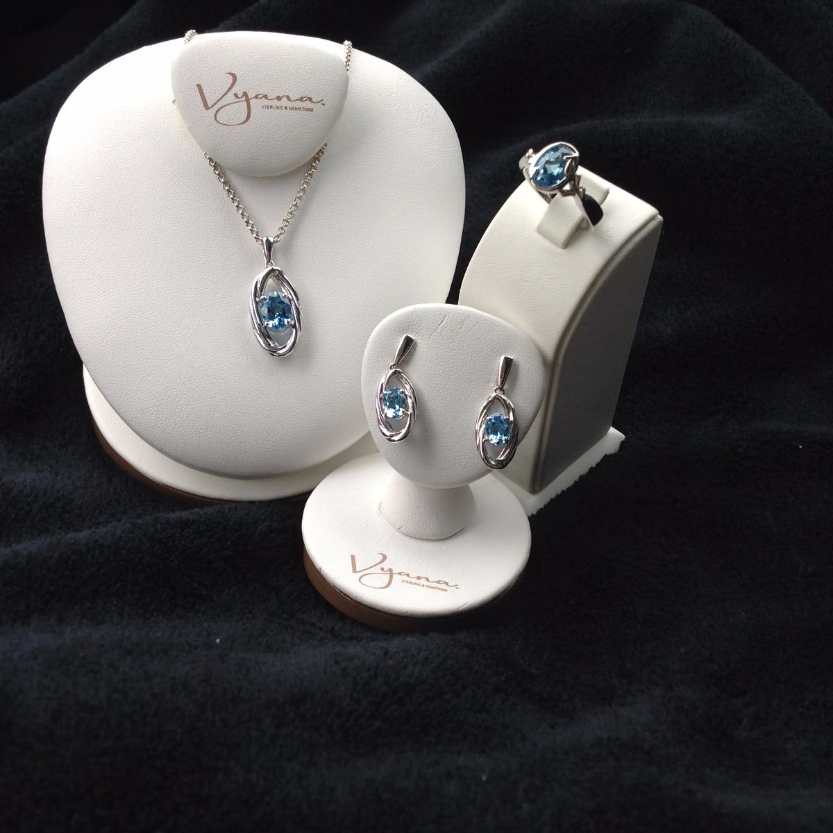 Lot 40: Swiss Blue Topaz Pendant with Matching Earrings and Ring – Homestead Jewelers has donated a beautiful approx. 10mm x 8mm oval Swiss Blue Topaz and Sterling Silver Pendant with matching earrings and ring with Sterling Silver chain by Vyanna.