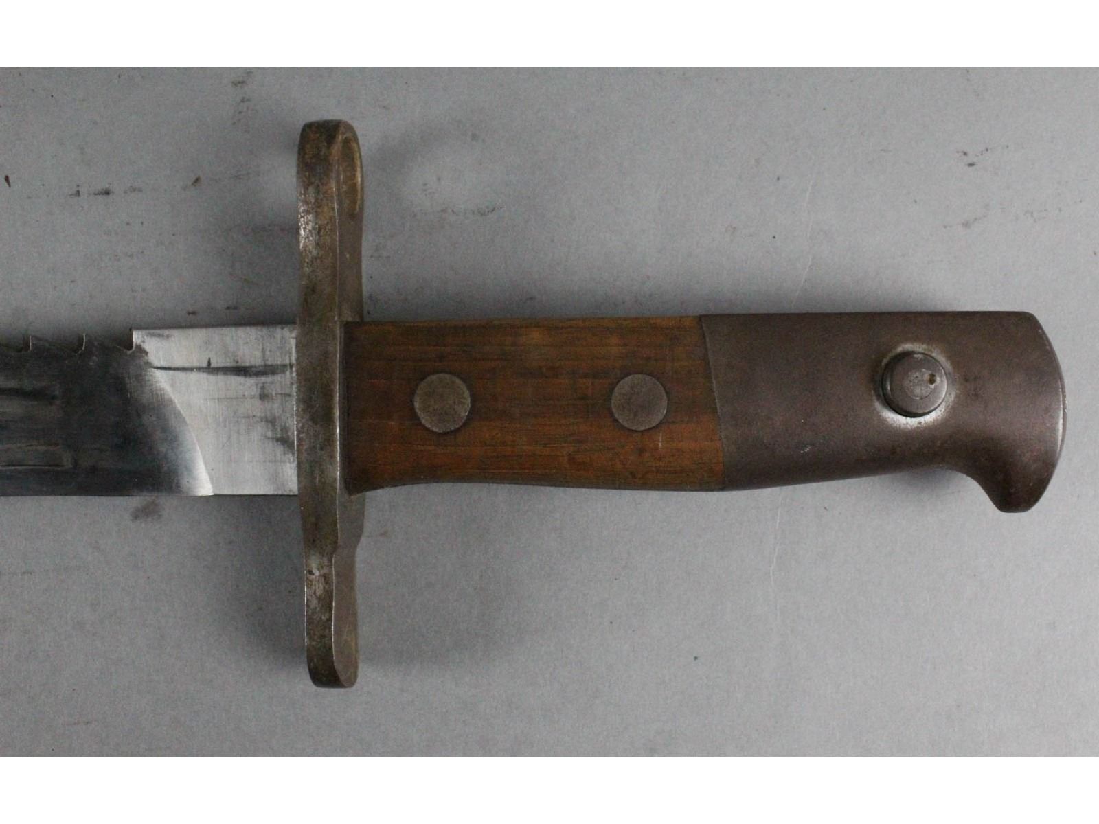 Blade measures 18.75", overall 25.25". Manufacture HS. Serial 38109. Very good wood grips. All other metal showing age patina. Scabbard will clean to bright. Has correct frog marked James Baeriswyl. Sellier, Sassel 82.