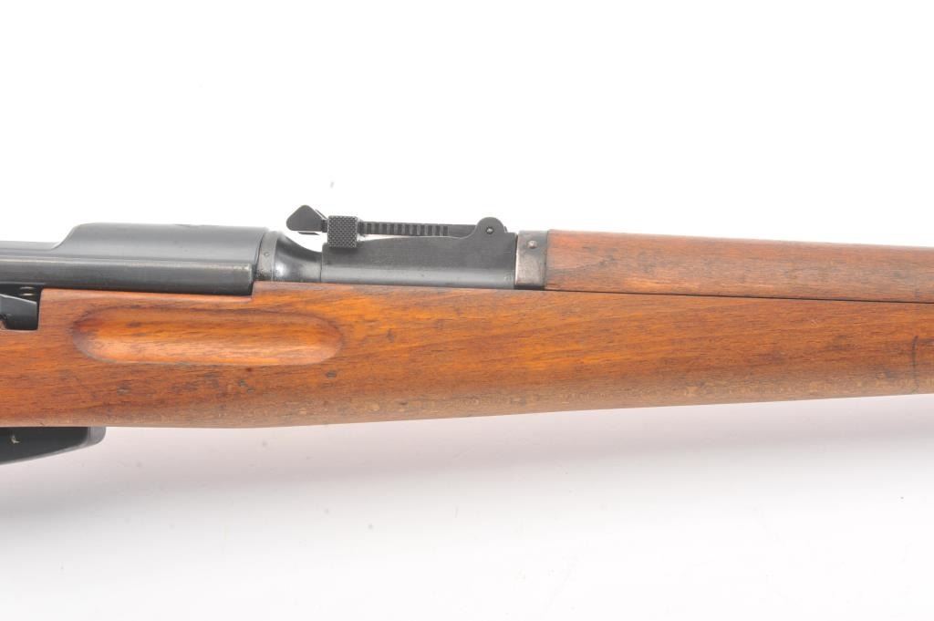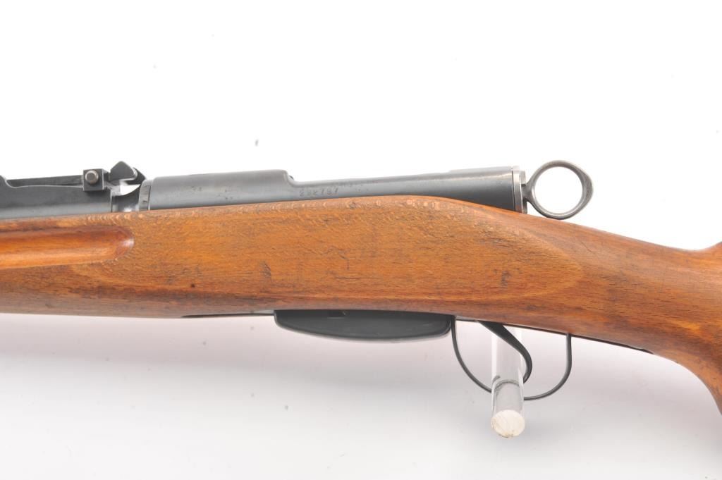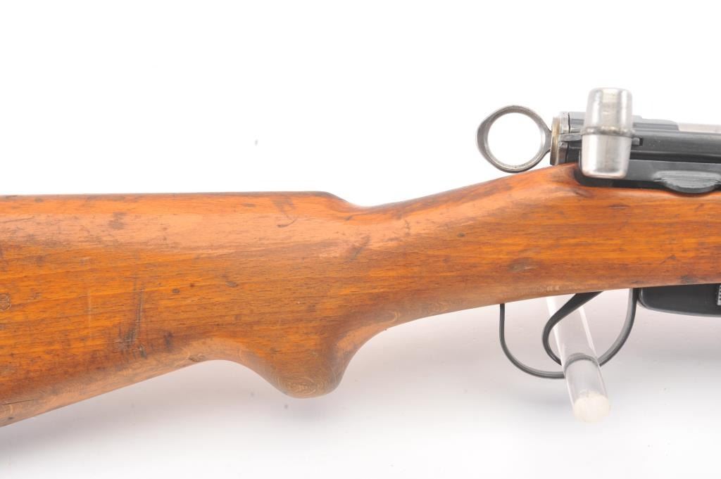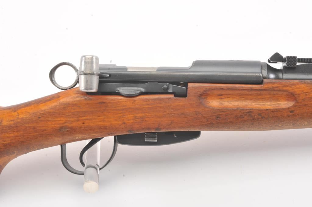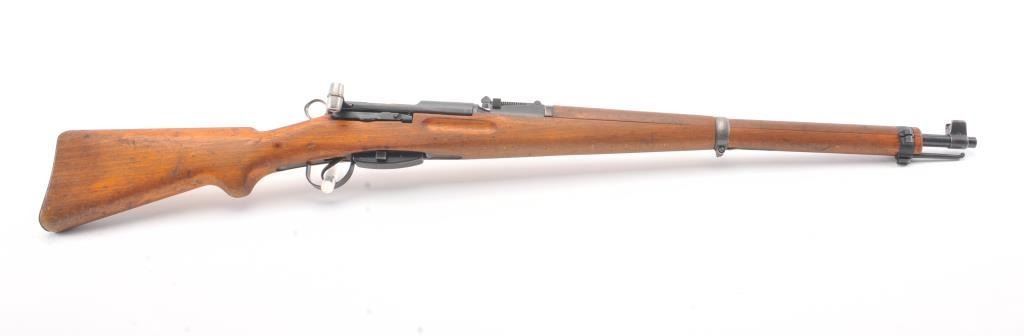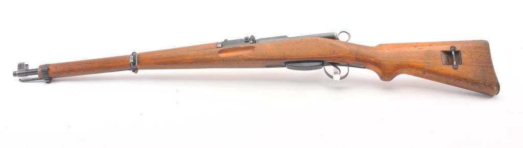 Swiss Schmidt-Rubin Model 1911 straight pull rifle, 7.5 x 55 caliber, Serial #992797. The rifle is in fine overall condition with a 30” barrel with a protected blade front and military tangent style rear sights. Therifle retains nearly all of the military finish with a Swiss Cross on top of the receiver, proofs and acceptance marks on the front ring. The smooth wood stock is in very good condition and the butt stock ends witha smooth steel butt plate. The bore is good, the action is crisp and the markings are sharp. The lot includes one correct magazine. Est.: $300-$600. (C+R).