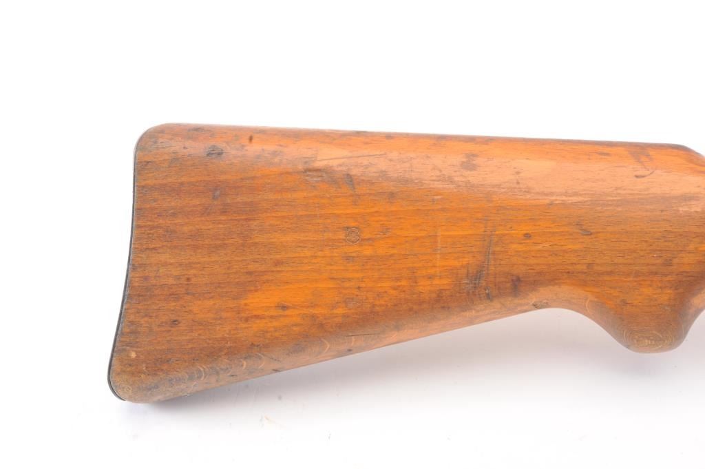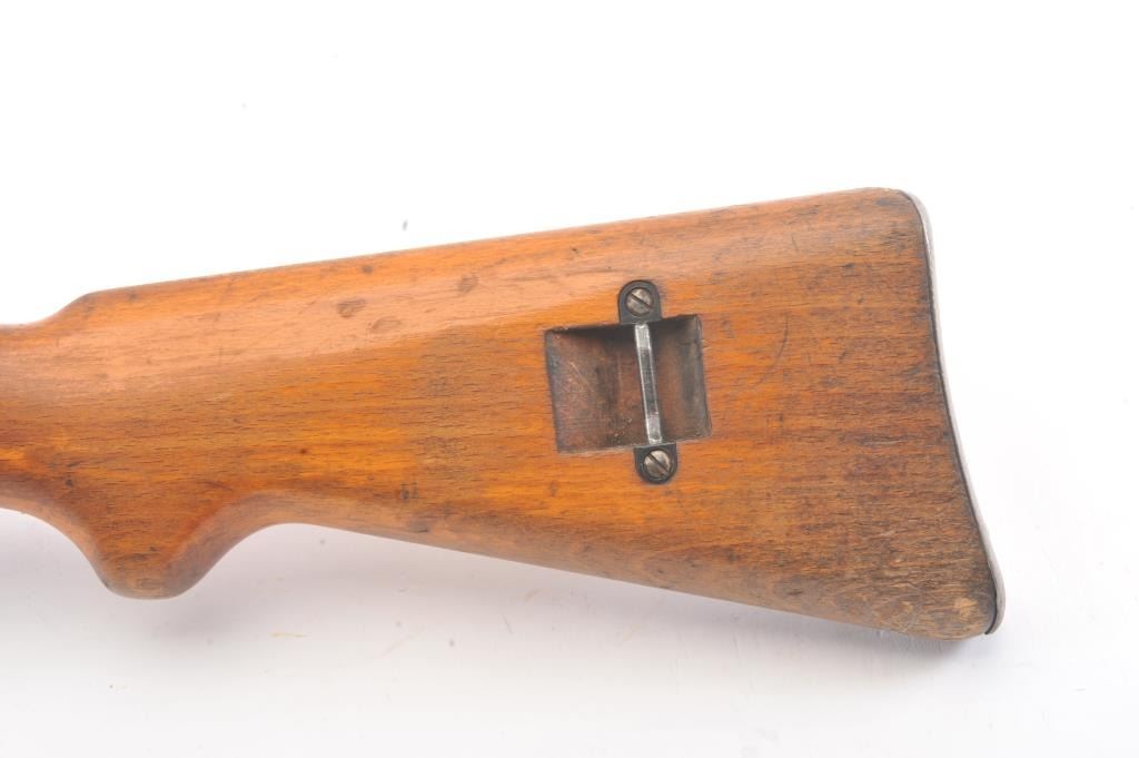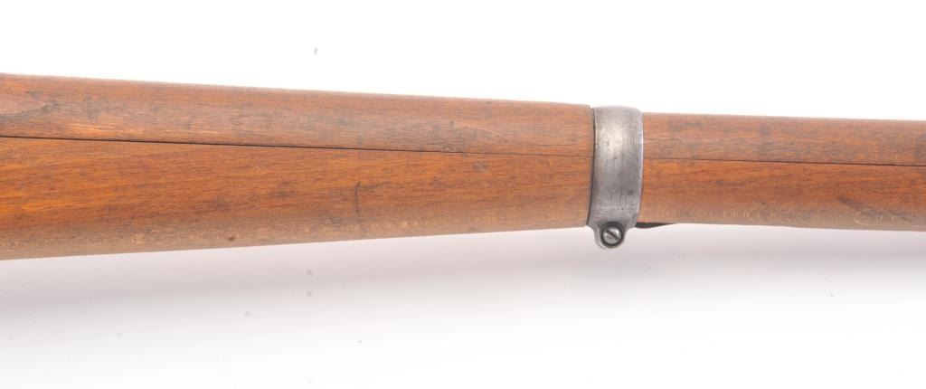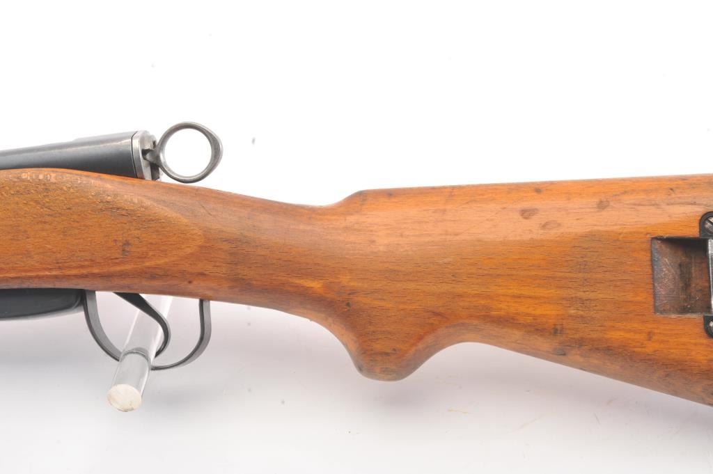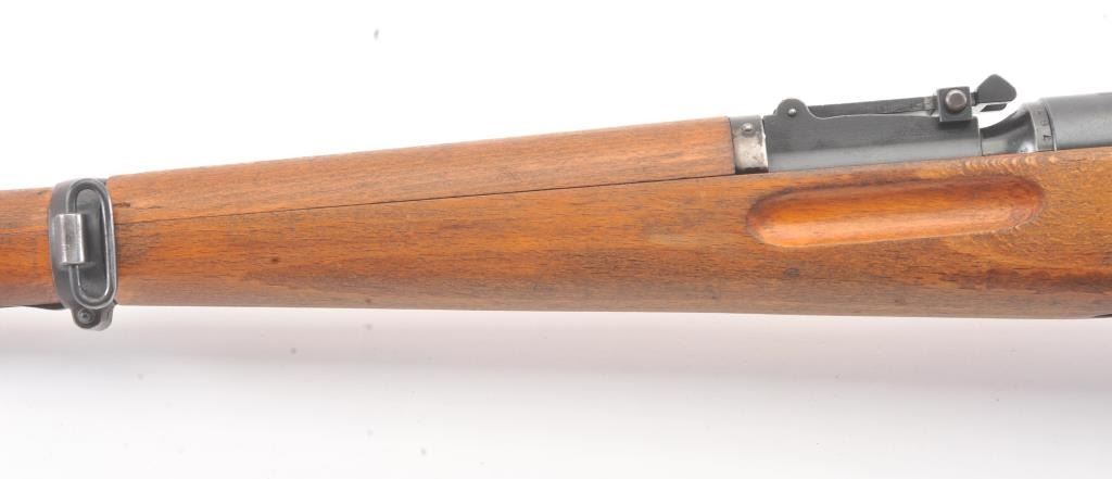 Swiss Schmidt-Rubin Model 1911 straight pull rifle, 7.5 x 55 caliber, Serial #992797. The rifle is in fine overall condition with a 30” barrel with a protected blade front and military tangent style rear sights. Therifle retains nearly all of the military finish with a Swiss Cross on top of the receiver, proofs and acceptance marks on the front ring. The smooth wood stock is in very good condition and the butt stock ends witha smooth steel butt plate. The bore is good, the action is crisp and the markings are sharp. The lot includes one correct magazine. Est.: $300-$600. (C+R).