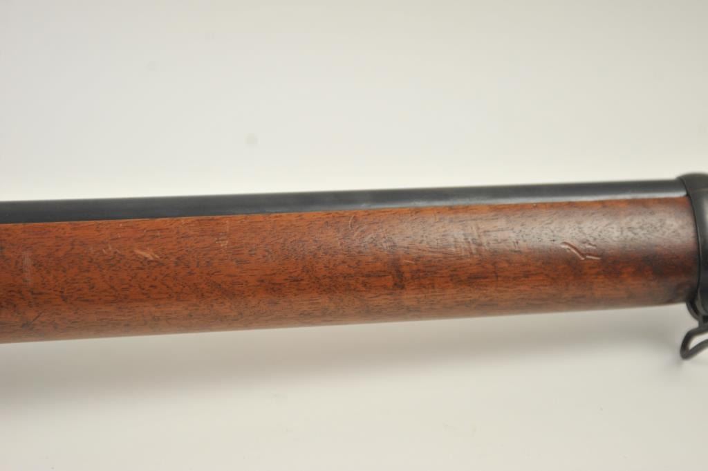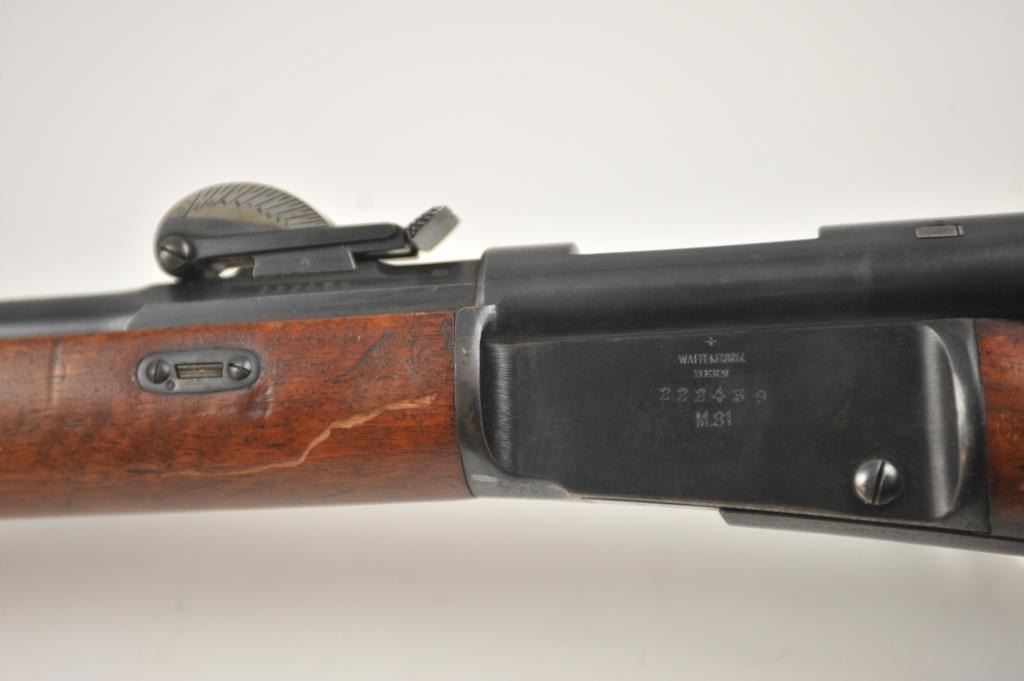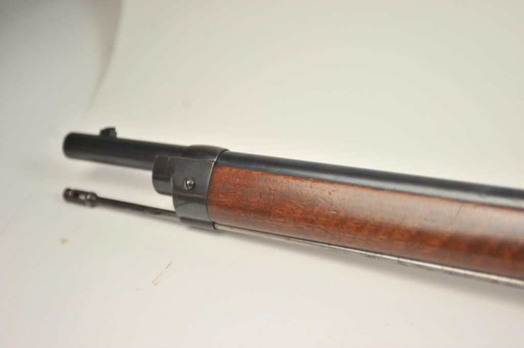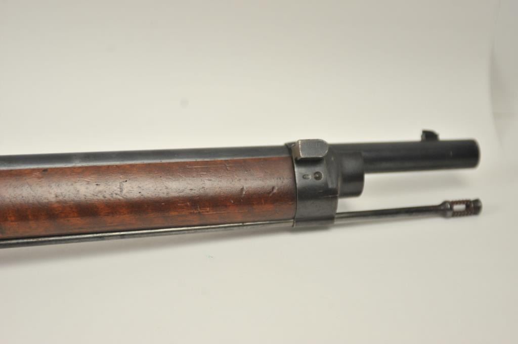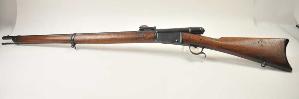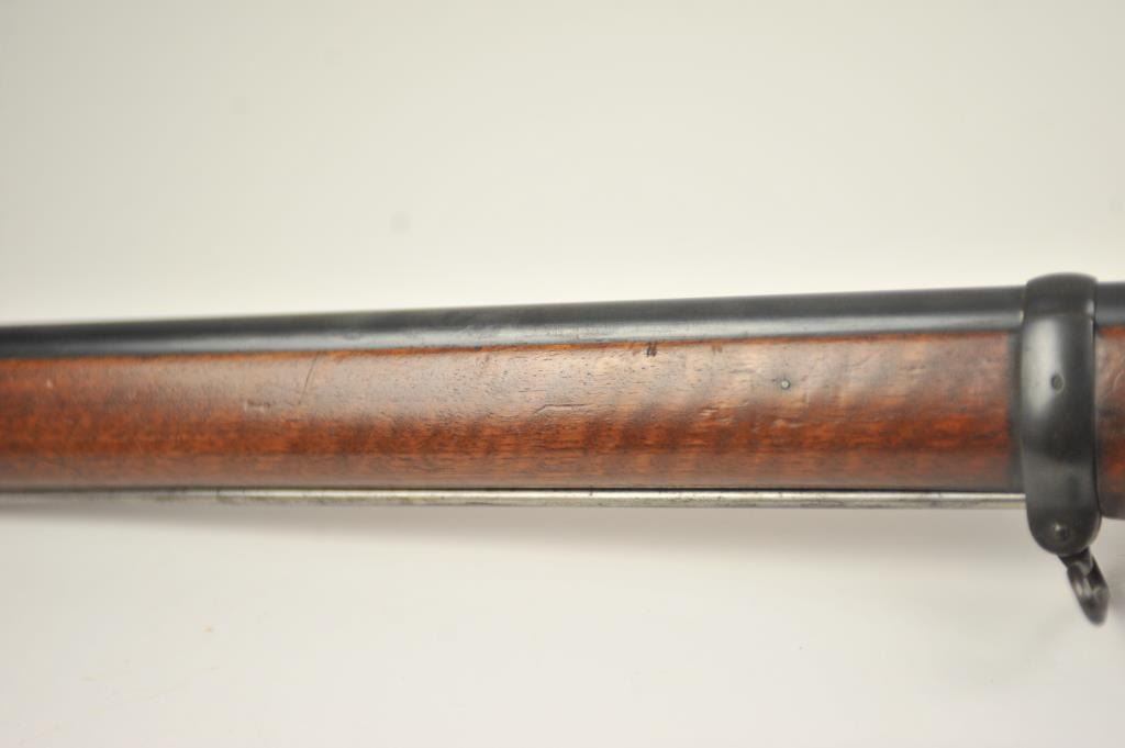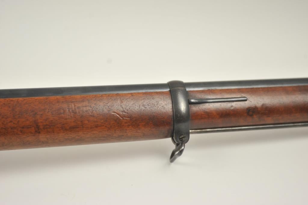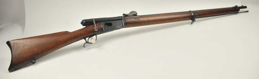 Swiss Vetterli Model 1881 bolt action rifle, .41 Rimfire caliber, Serial #222439. The rifle is fine overall condition with a 33” barrel with a blade front and volley style rear sights. The rifle retains approximately 90-95% of the original blue finish with the receiver marked, “WAFFENFABRIK BERN” and a Swiss cross with all matching visible serial numbers. The smooth wood stock is in very good condition with sling swivels, hookedtrigger guard and ramrod. The bore is good, the action works well and the markings are crisp. Est.: $300-$600. (Antique).