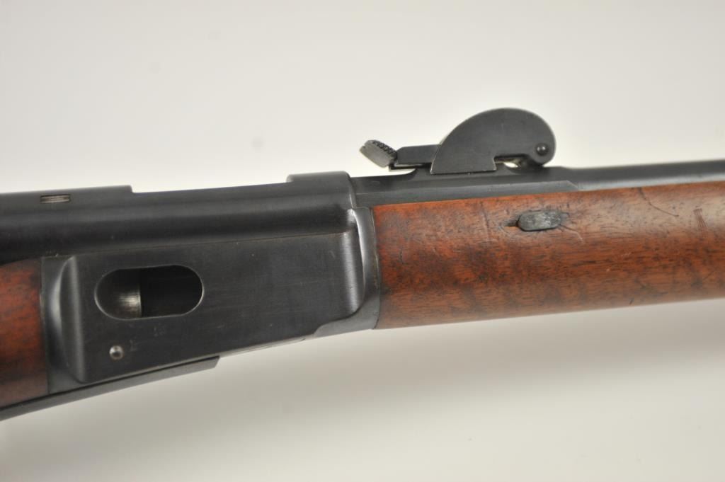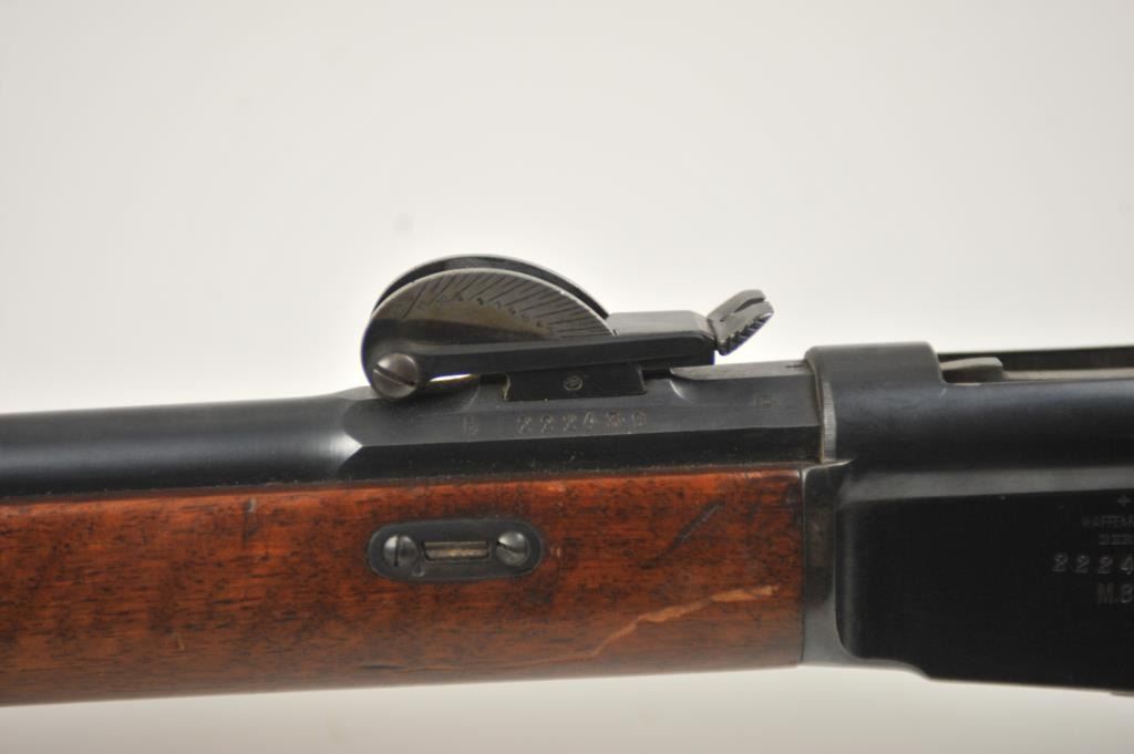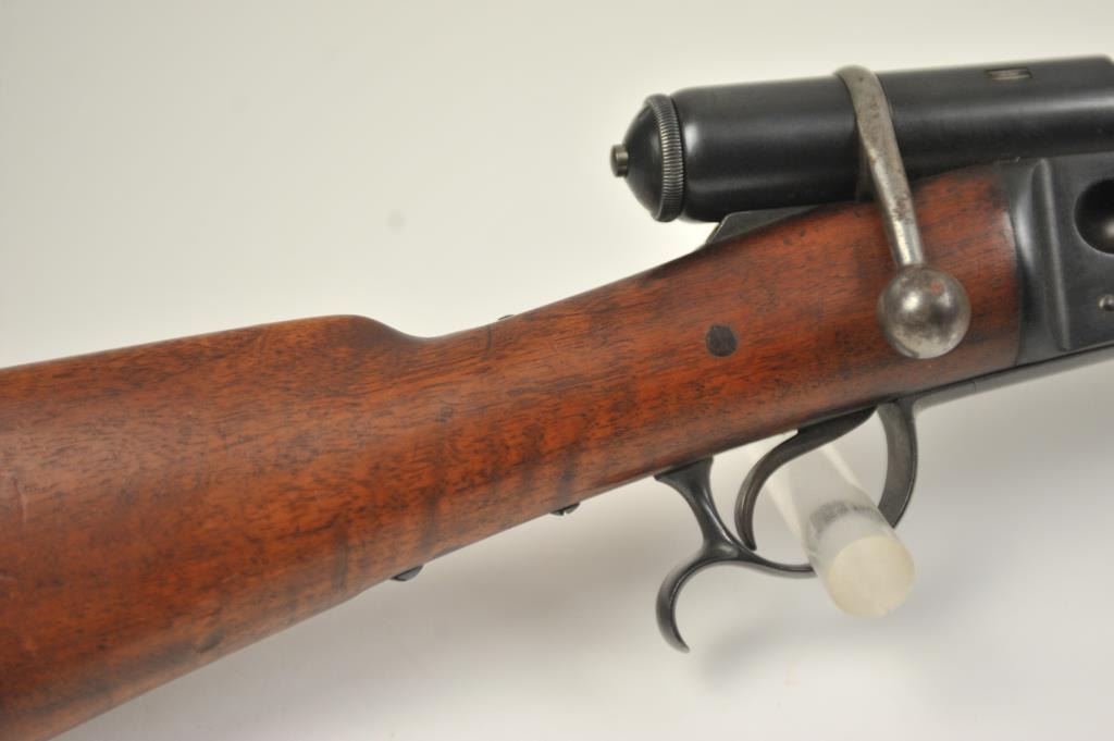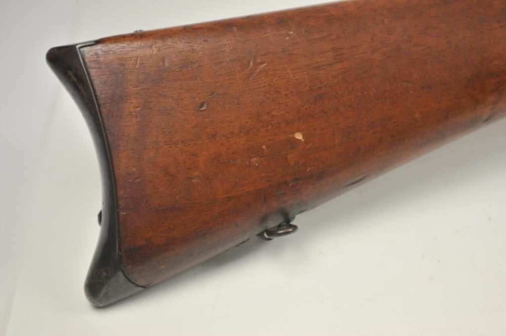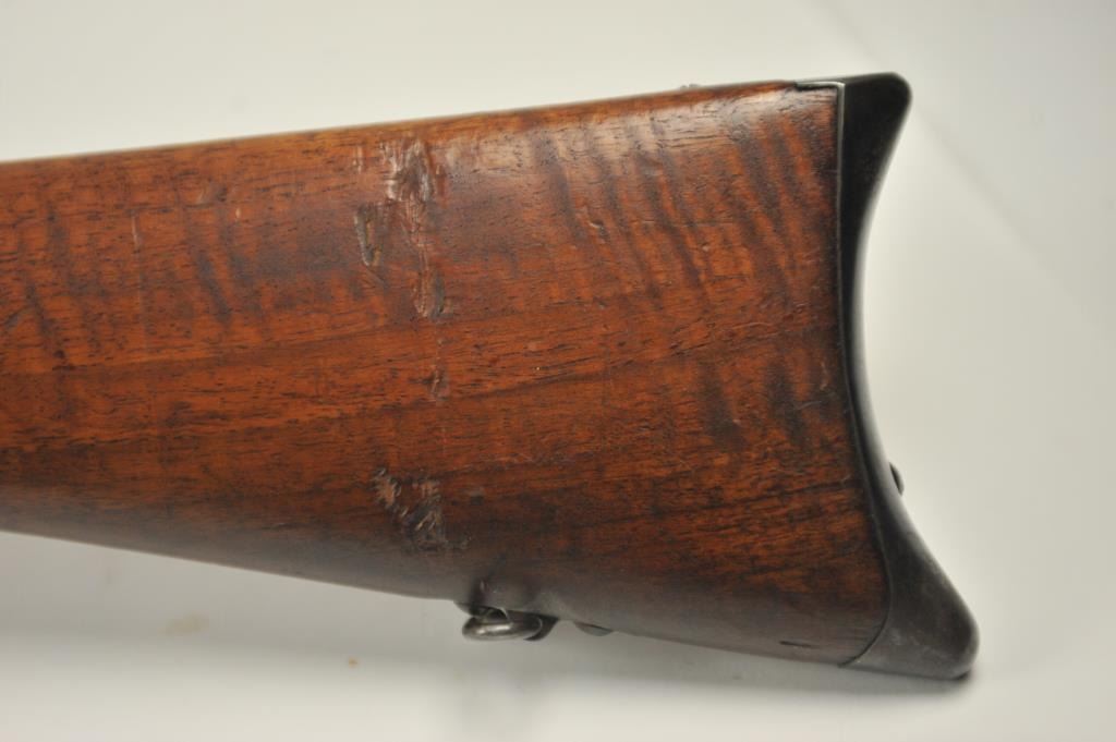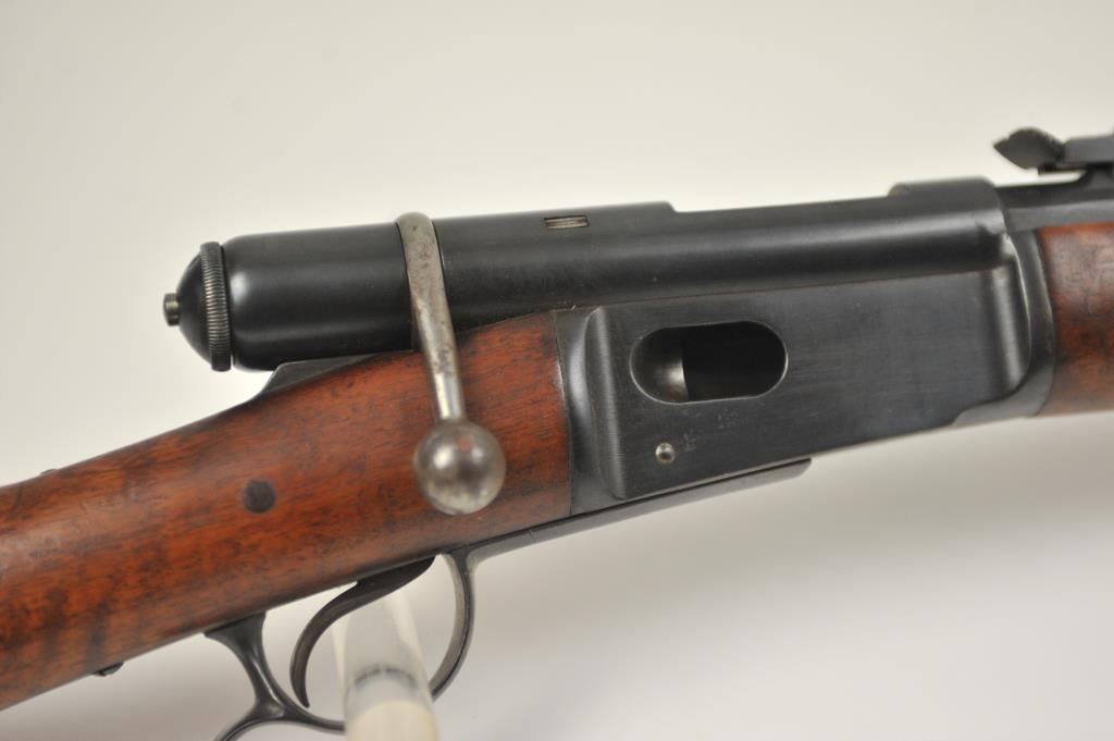 Swiss Vetterli Model 1881 bolt action rifle, .41 Rimfire caliber, Serial #222439. The rifle is fine overall condition with a 33” barrel with a blade front and volley style rear sights. The rifle retains approximately 90-95% of the original blue finish with the receiver marked, “WAFFENFABRIK BERN” and a Swiss cross with all matching visible serial numbers. The smooth wood stock is in very good condition with sling swivels, hookedtrigger guard and ramrod. The bore is good, the action works well and the markings are crisp. Est.: $300-$600. (Antique).