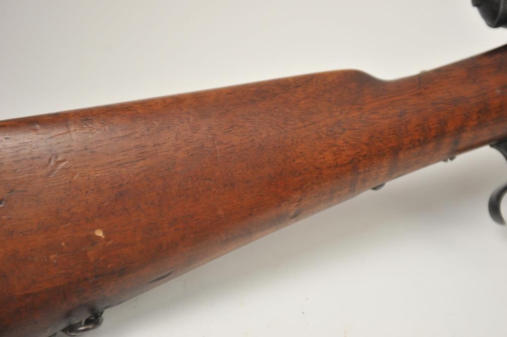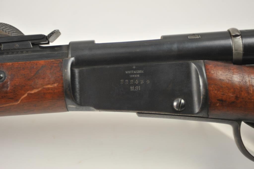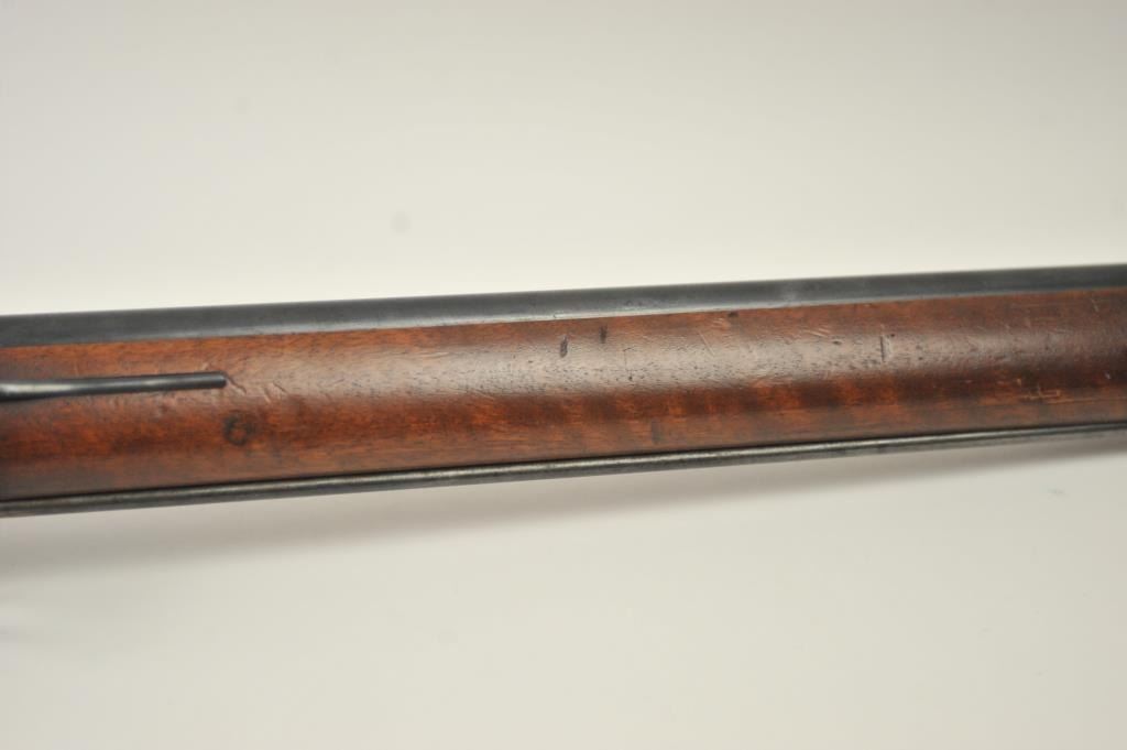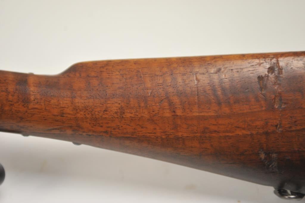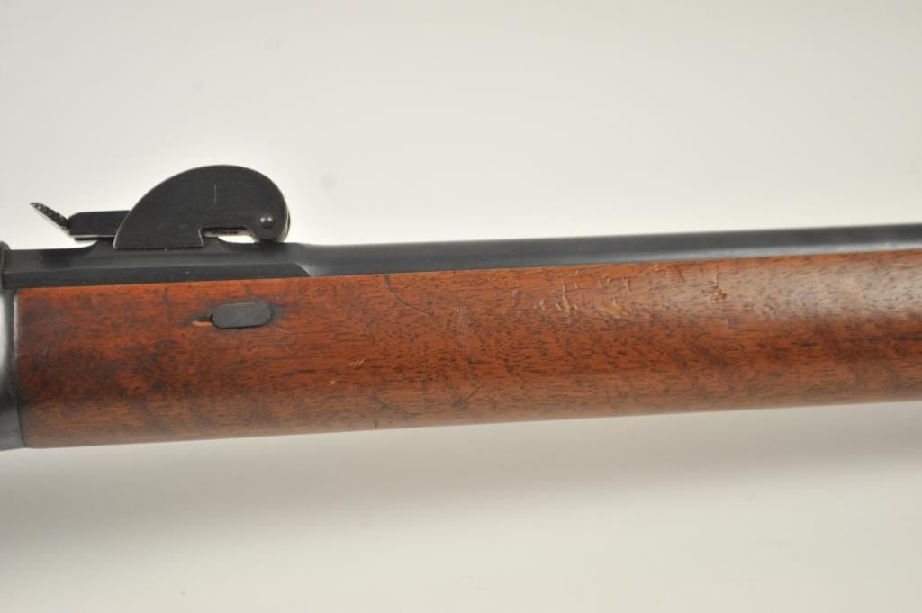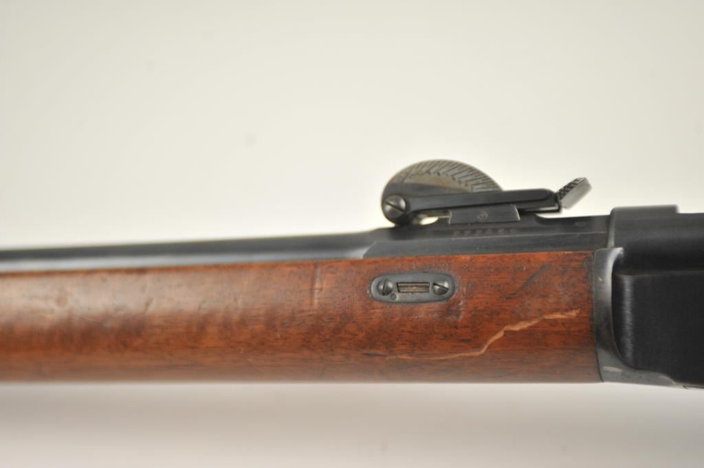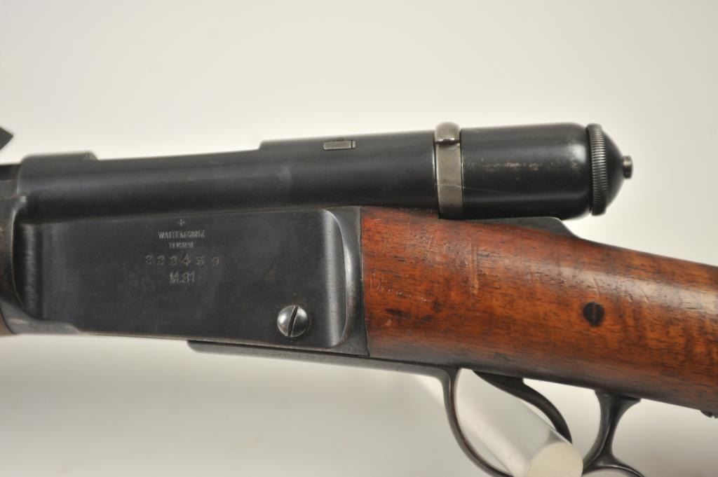 Swiss Vetterli Model 1881 bolt action rifle, .41 Rimfire caliber, Serial #222439. The rifle is fine overall condition with a 33” barrel with a blade front and volley style rear sights. The rifle retains approximately 90-95% of the original blue finish with the receiver marked, “WAFFENFABRIK BERN” and a Swiss cross with all matching visible serial numbers. The smooth wood stock is in very good condition with sling swivels, hookedtrigger guard and ramrod. The bore is good, the action works well and the markings are crisp. Est.: $300-$600. (Antique).
