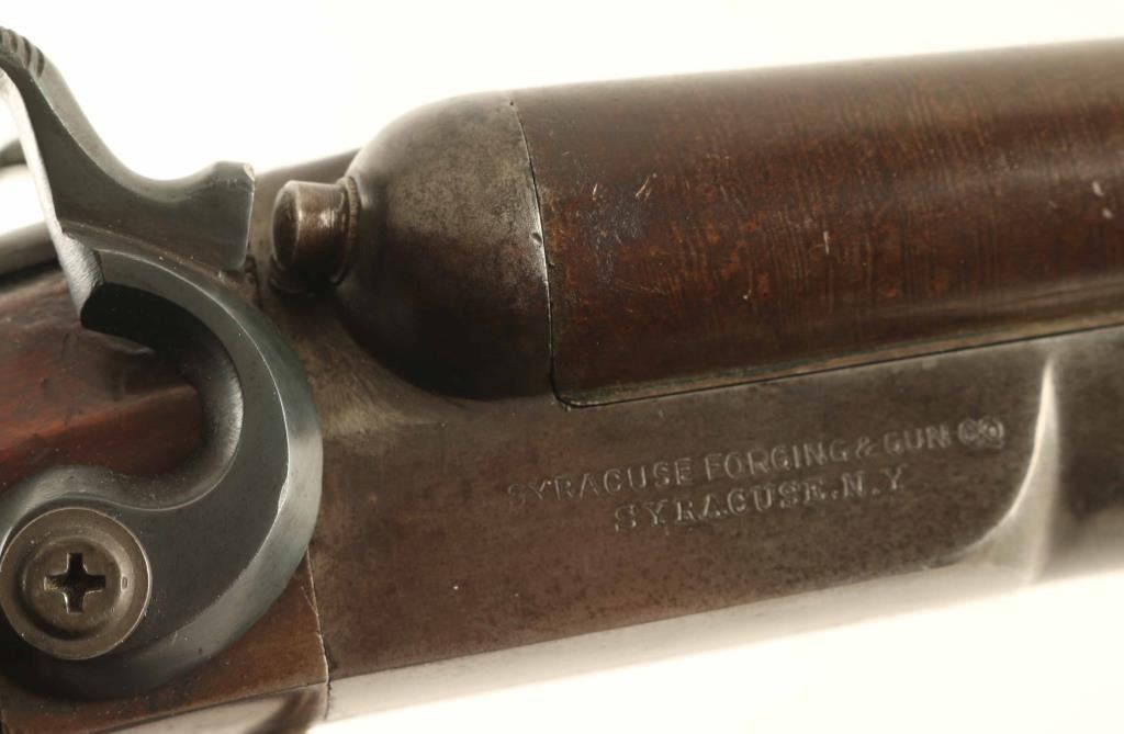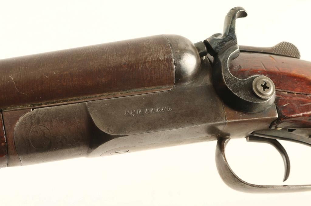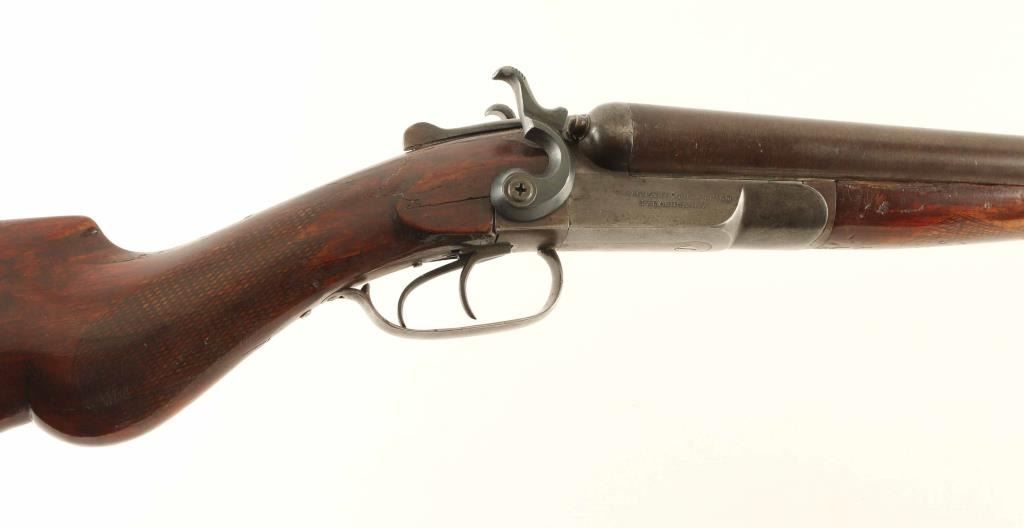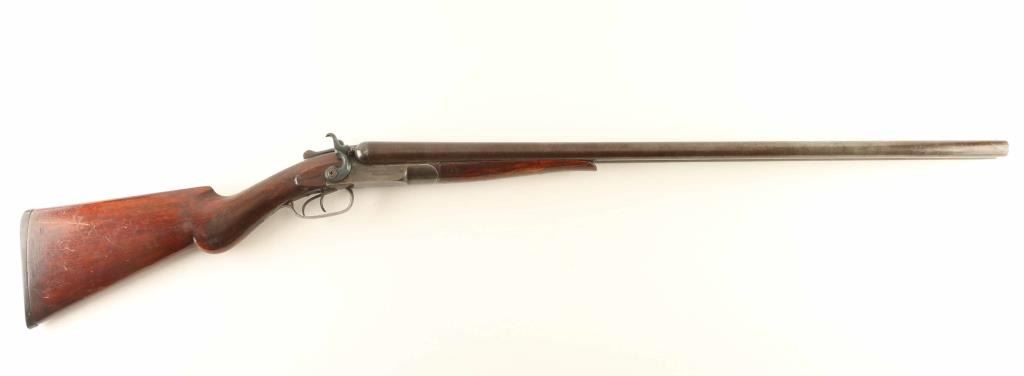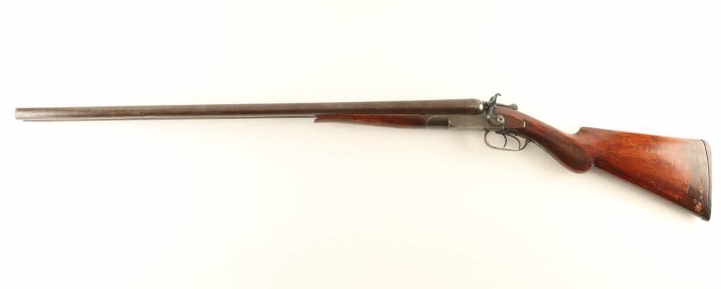 SN: 1551 Double barrel side-by-side shotgun features browned finish, checkered wood forend, checkered Prince of Wales gripped stock, Gutta Percha buttplate, 30" Damascus or Twist Steel barrels (FULL choke left, IM right), brass front bead, exposed hammers, double triggers, extractors, top lever opening. Bores are good or better condition. Barrels retain 90% coverage of plum brown finish with damascus or twist pattern visible. Action has majority coverage of dull gray color, with patina on bopttom and bare metal showing at tang. Hammers appear reblued with dark black color. Wood is in fair functional condition, with small amount of wood missing from edge of forend, cracks visible at wrist, scrapes and scratches. Buttplate is good condition. Condition is NRA Good *** C&R Firearm ***