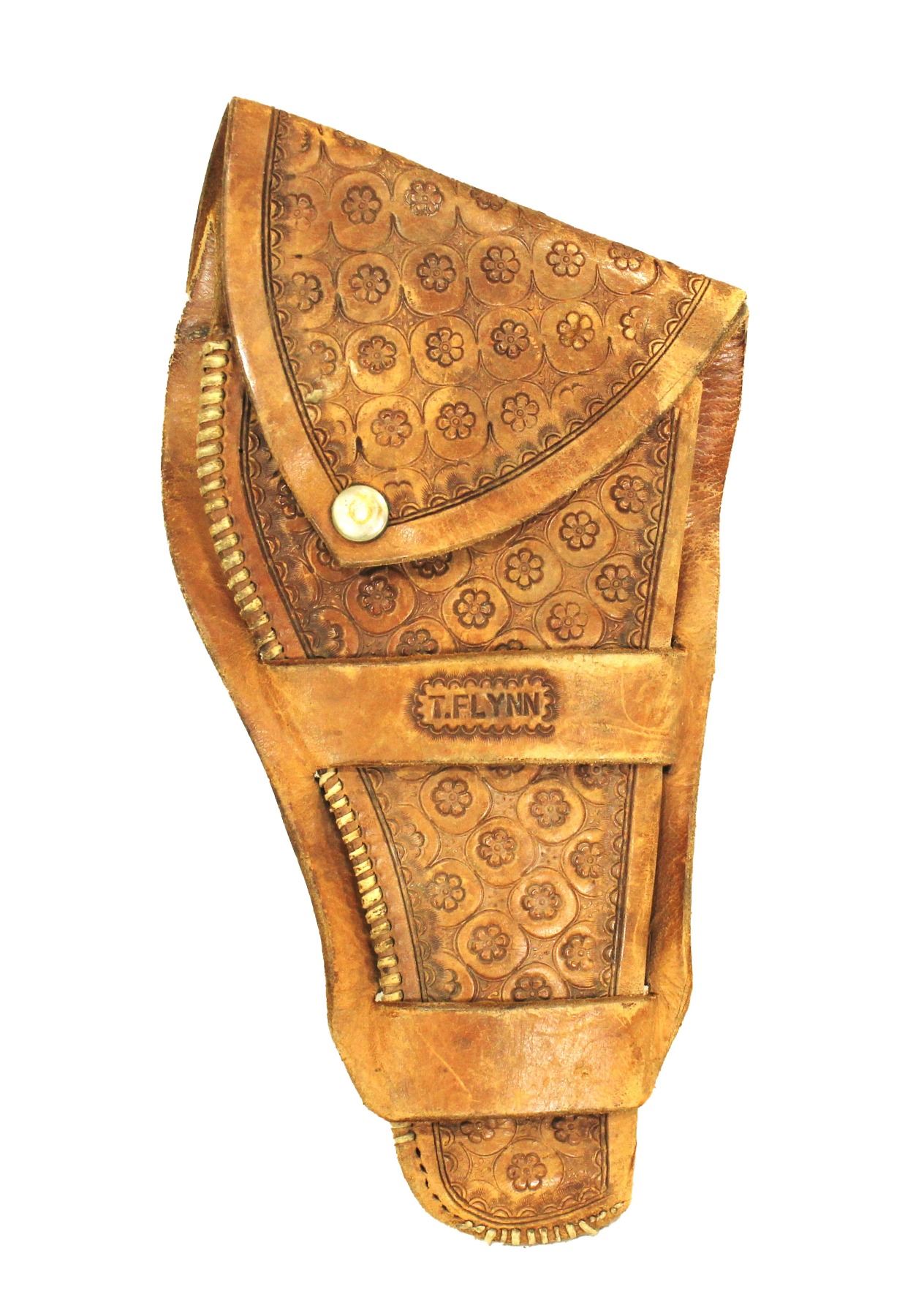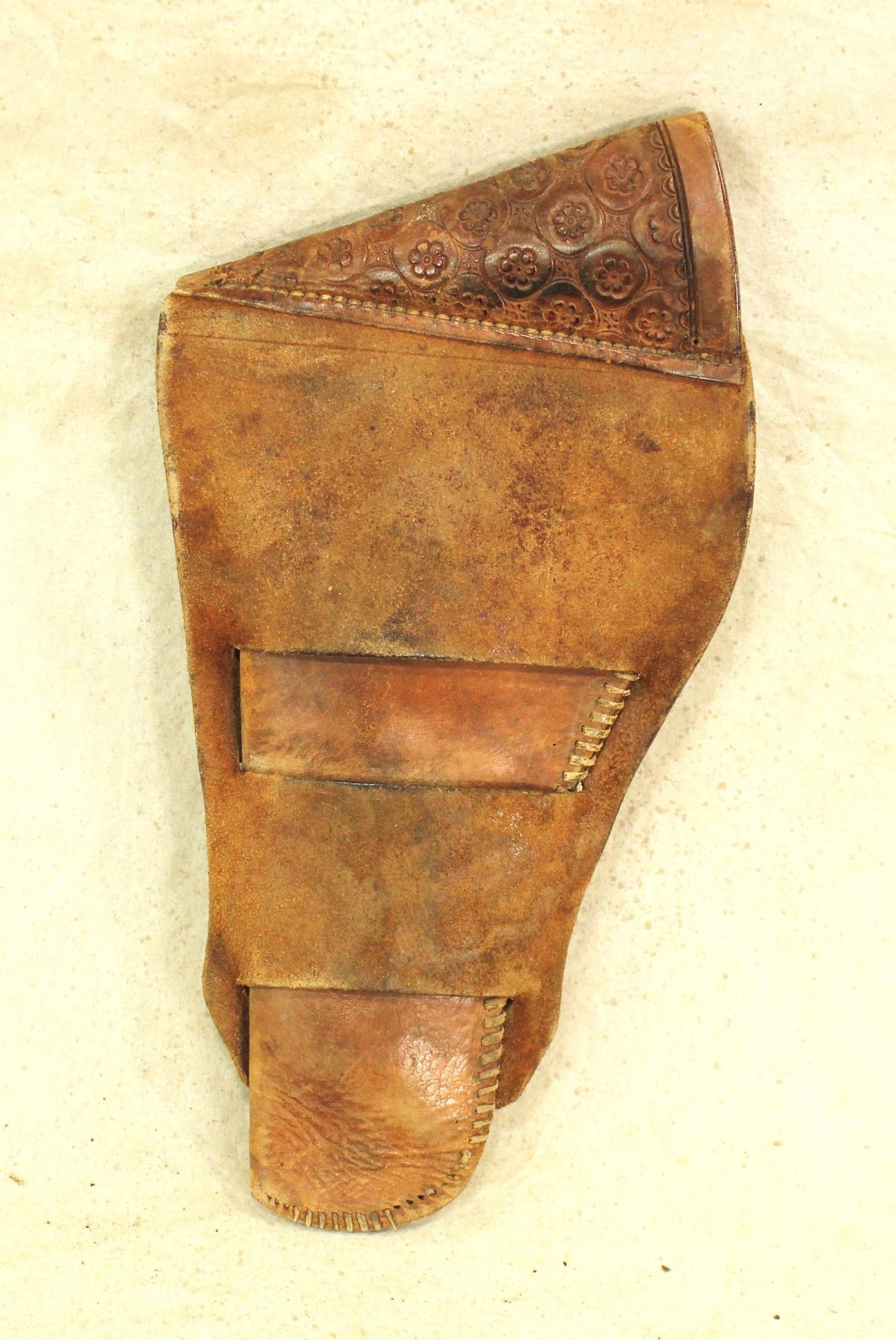 A holster from an extremely scarce Colorado maker, made for a 5 1/2" Colt single action revolver, showing great fully tooled pattern and excellent condition.