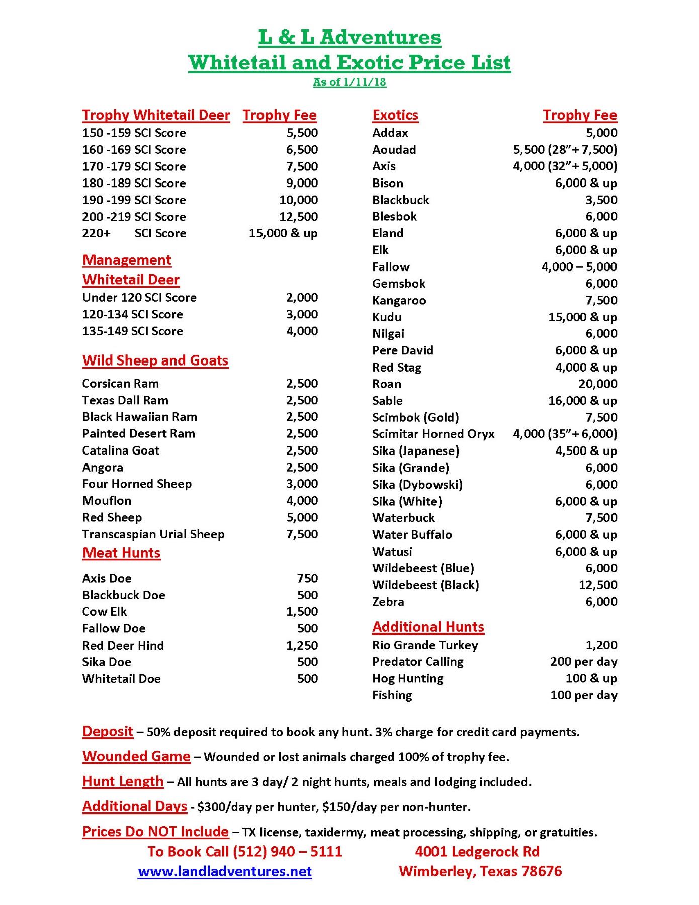 Select from a Variety of over 30+ Trophy Exotics that can be hunted Year-Round. Hunters may Hunt Additional Animals at a 10% discount from our current price list.
