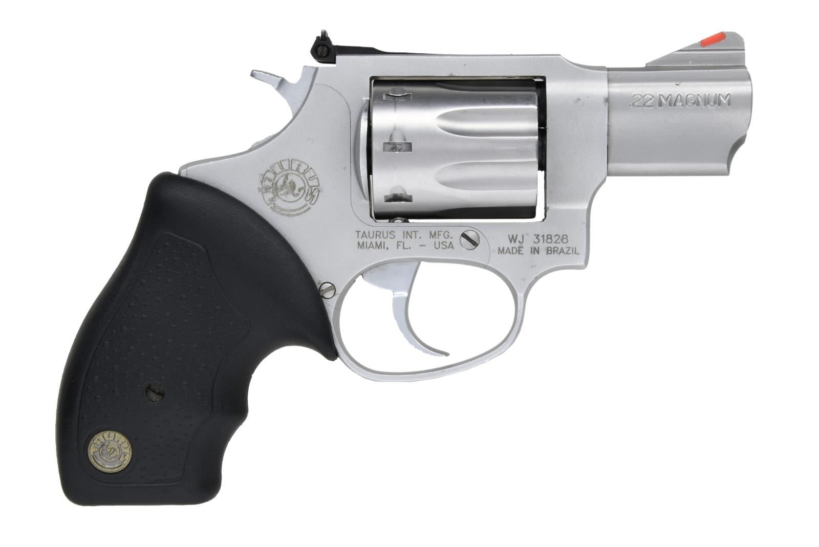 Cal. 22 Mag. S# WJ 31828. Bbl. 2". Matte stainless ultra light hammer forged frame w/ 8 shot fluted cyl. Red insert front sight & white outline rear sight. Rubber grip w/ Taurus medallions. CONDITION: very good metal finish w/ handling marks & cyl. turn line. Near excellent grips. Near excellent bore. (23-1351/MD). MODERN. $300-400.