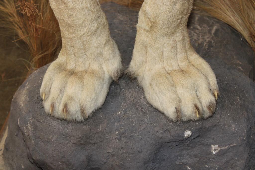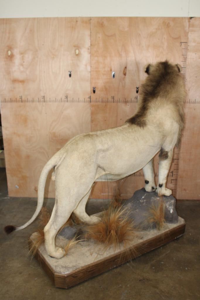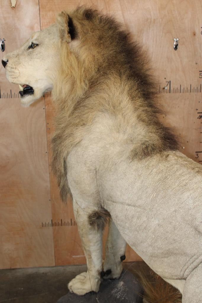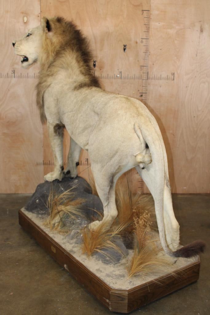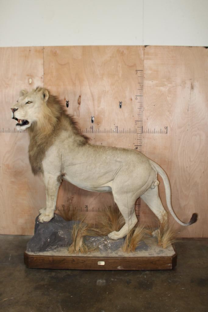 *TEXAS RESIDENTS ONLY*! Big Very Nice and Clean Life-sized AFRICAN LION. He has All his Claws, a great face, and Big Mane. The Total Mount measures 79" Long x 30" Wide x 76" Tall and is Very Good Condition. TAXIDERMY