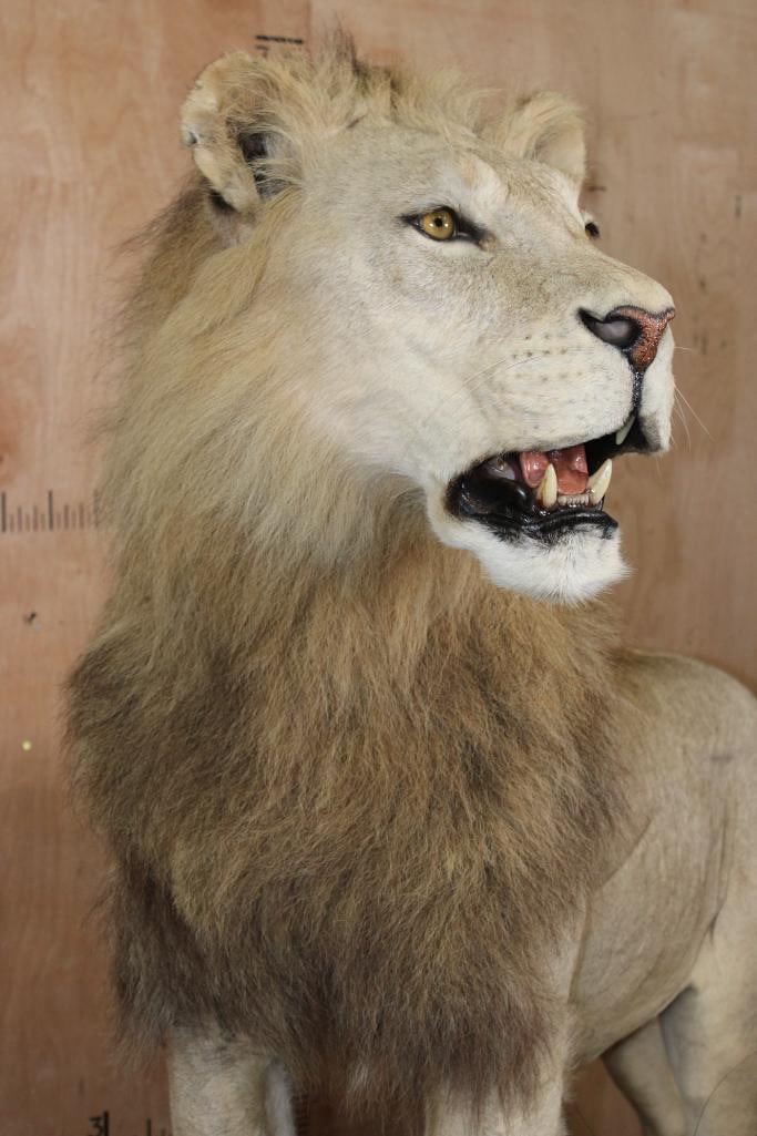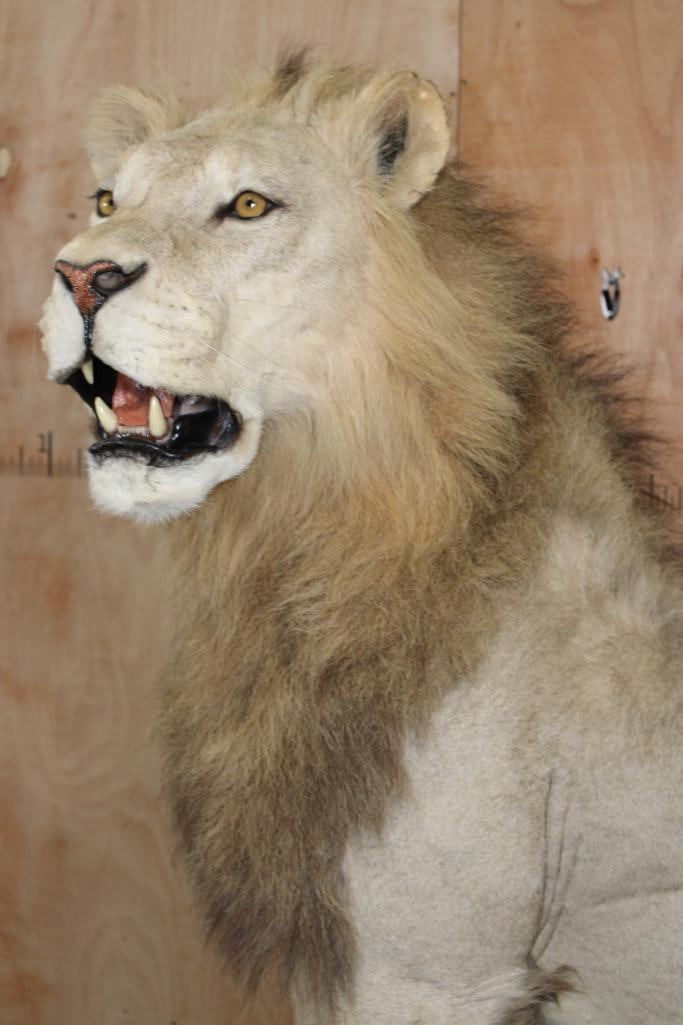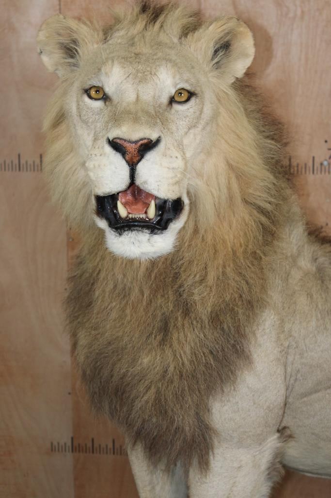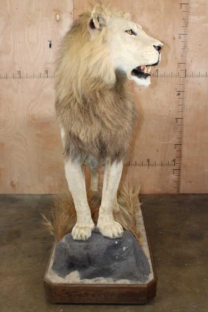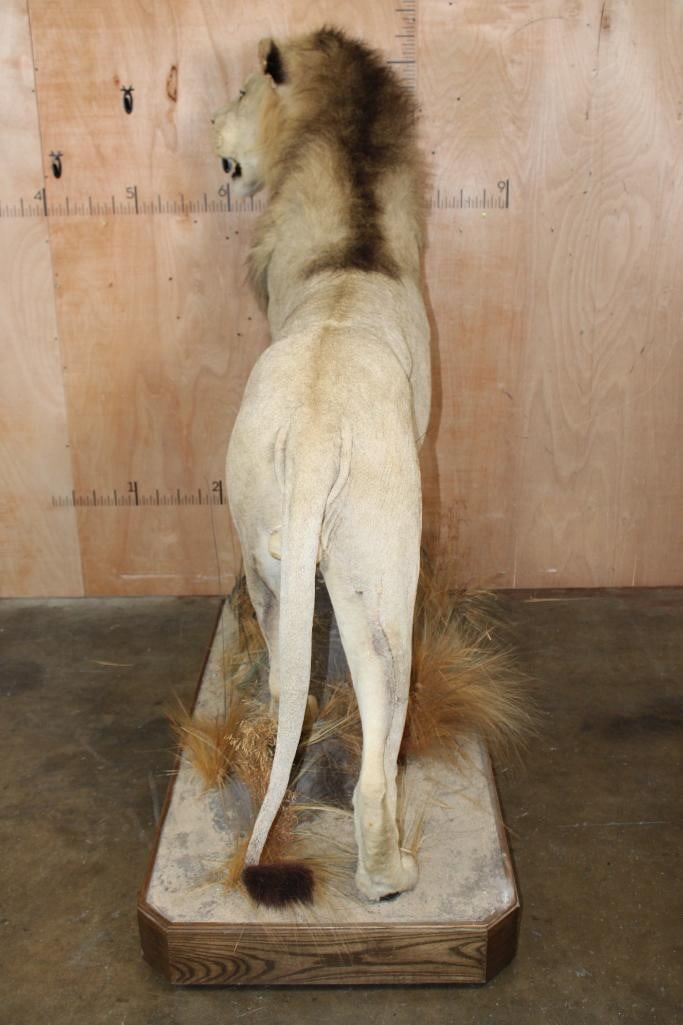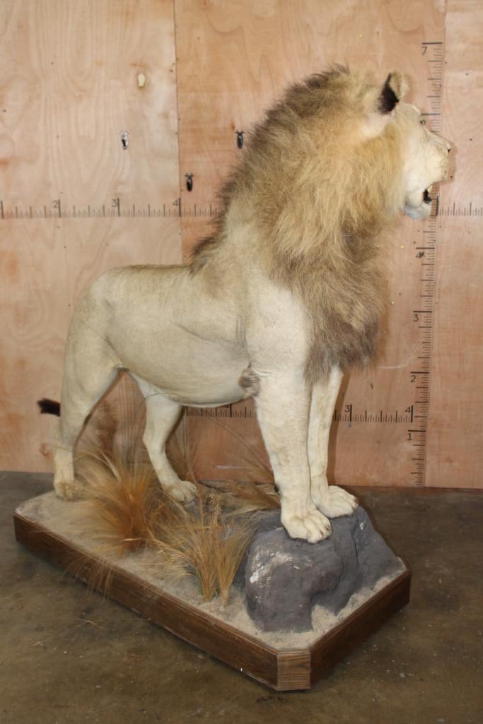*TEXAS RESIDENTS ONLY*! Big Very Nice and Clean Life-sized AFRICAN LION. He has All his Claws, a great face, and Big Mane. The Total Mount measures 79" Long x 30" Wide x 76" Tall and is Very Good Condition. TAXIDERMY