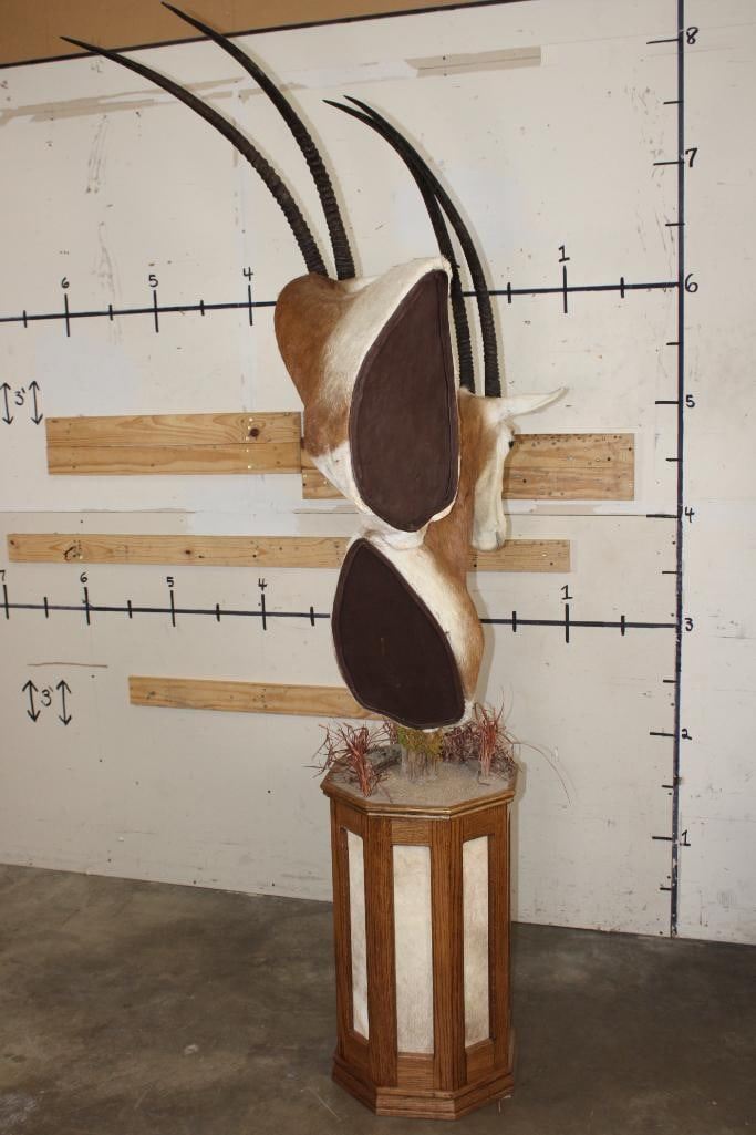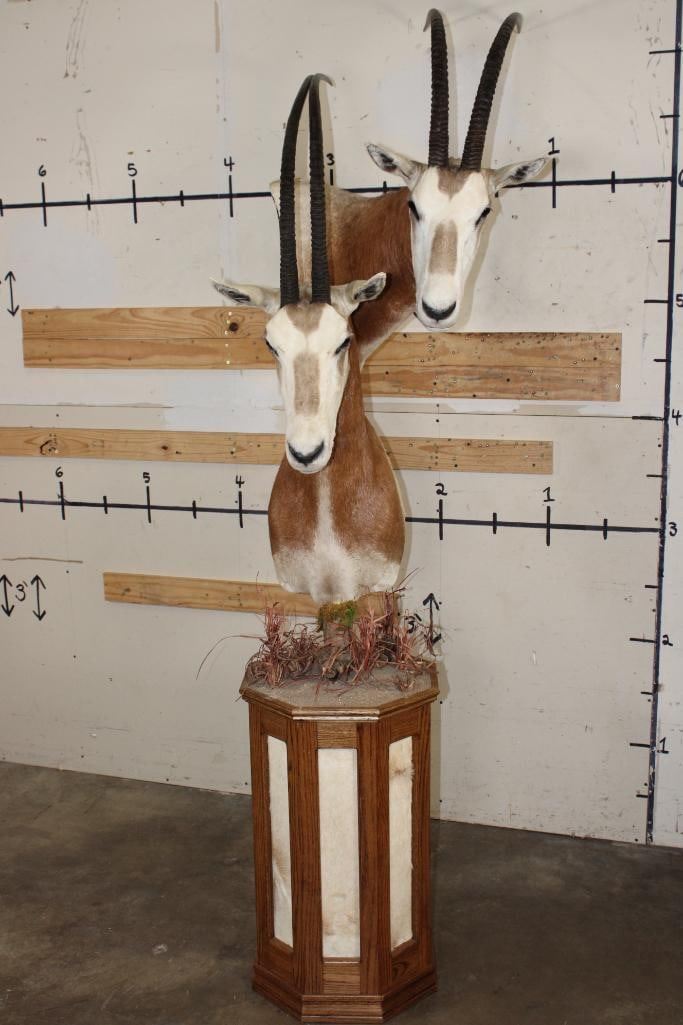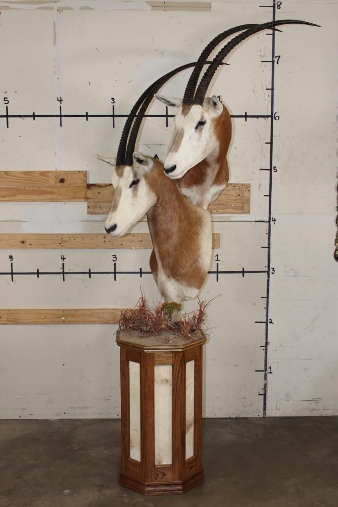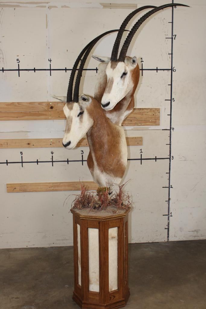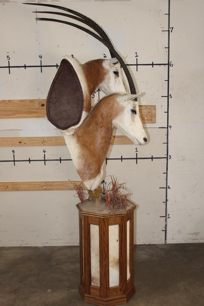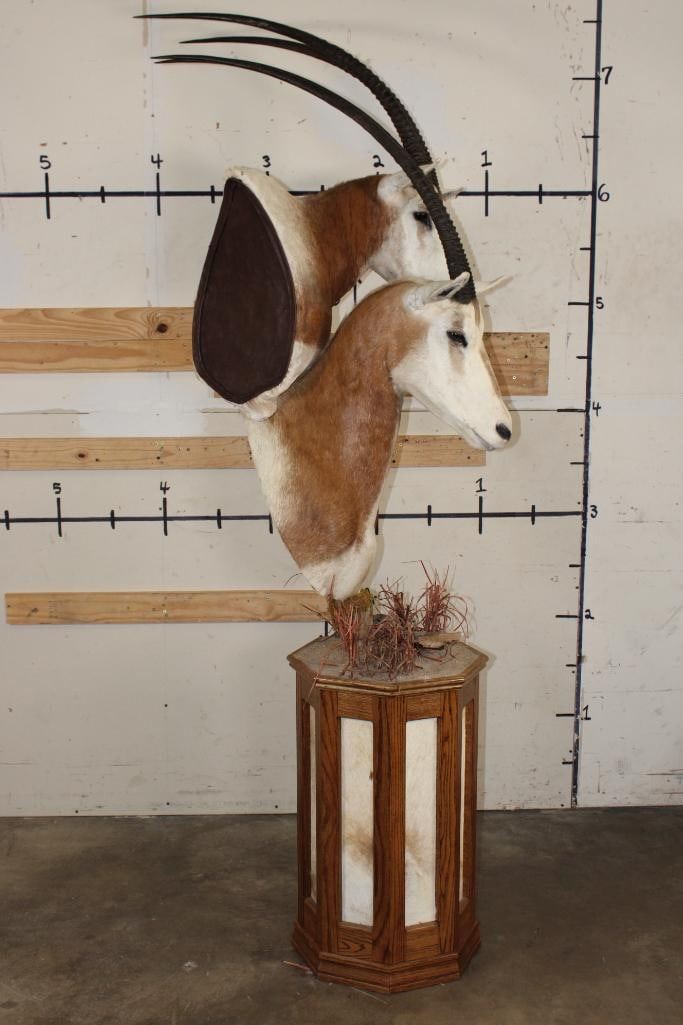 *TEXAS RESIDENTS ONLY*!!! Very Nice, Clean, and Newer Double (2) SCIMITAR HORNED ORYX Pedestal Mount. The Lower Oryx's Left Horn measures 39.75" Long and the Right Horn measures 40" Long, it has a left ear repair but is in otherwise Very Good Condition. The Upper Oryx's Left Horn measures 37.5" Long and the Right Horn measures 37.75" Long. The 2 Oryx have been mounted on an octagon shaped Base with 8 panels of Oryx Hide. The Wood and Hide Base measures approximately 29" Tall and the Oryx are Removable. TAXIDERMY