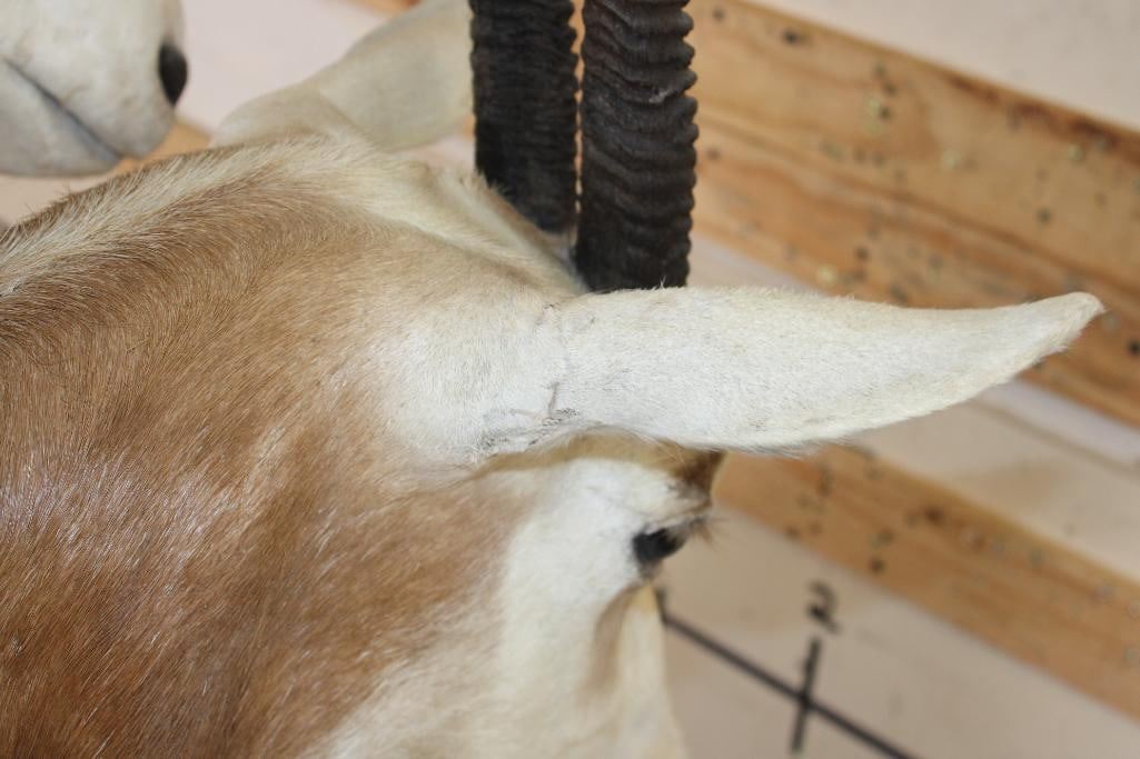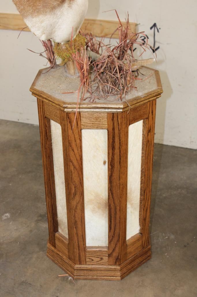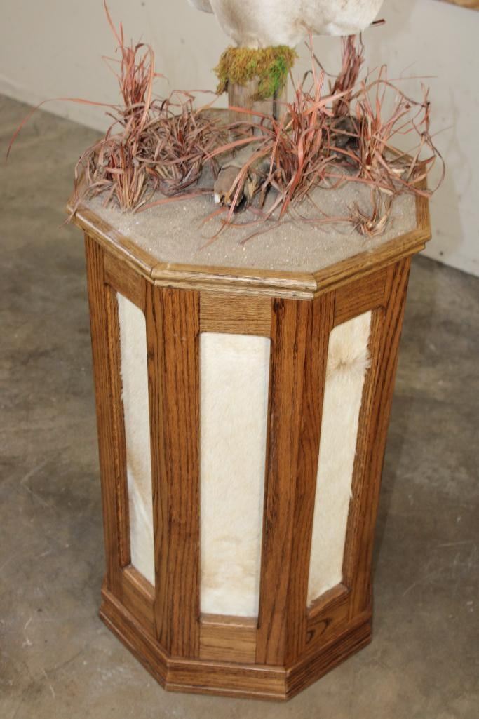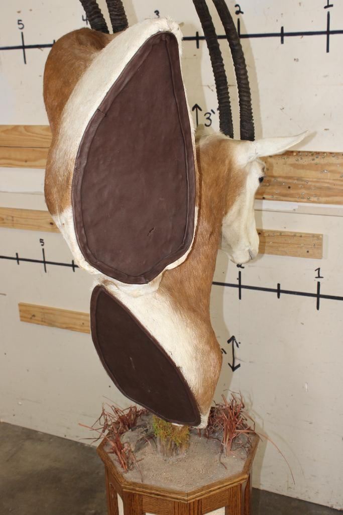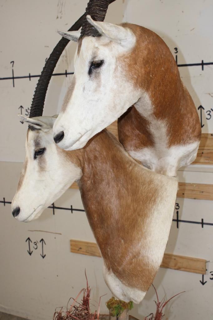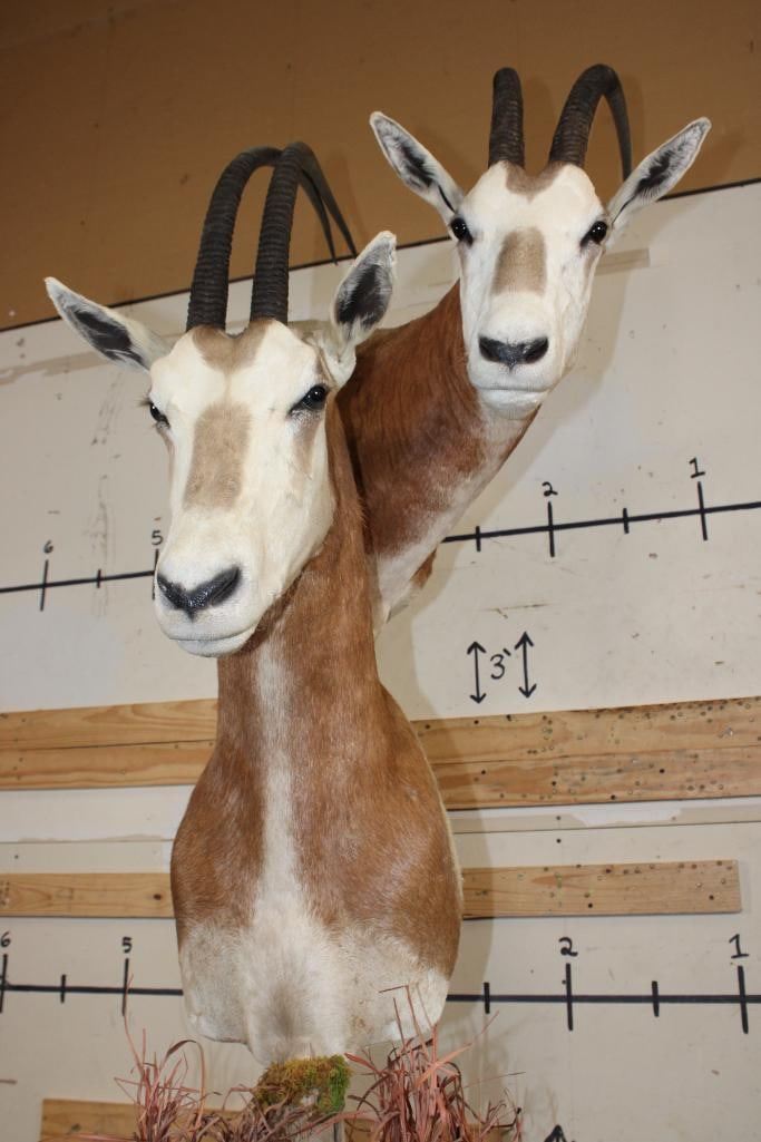 *TEXAS RESIDENTS ONLY*!!! Very Nice, Clean, and Newer Double (2) SCIMITAR HORNED ORYX Pedestal Mount. The Lower Oryx's Left Horn measures 39.75" Long and the Right Horn measures 40" Long, it has a left ear repair but is in otherwise Very Good Condition. The Upper Oryx's Left Horn measures 37.5" Long and the Right Horn measures 37.75" Long. The 2 Oryx have been mounted on an octagon shaped Base with 8 panels of Oryx Hide. The Wood and Hide Base measures approximately 29" Tall and the Oryx are Removable. TAXIDERMY