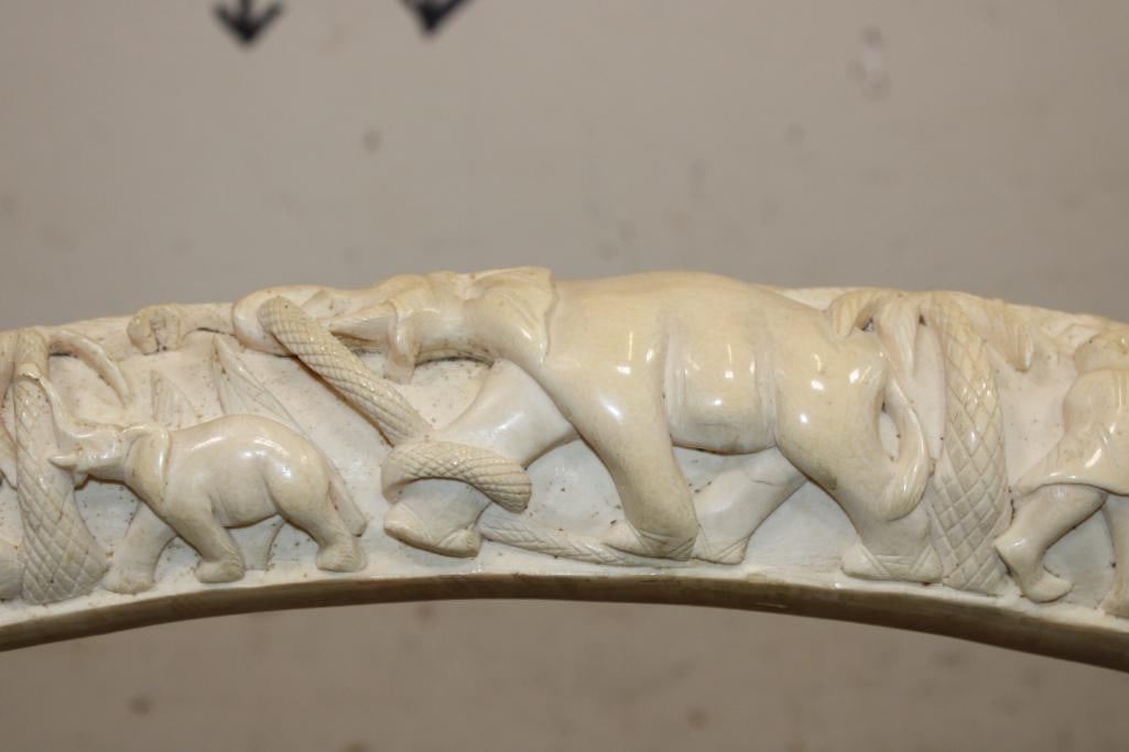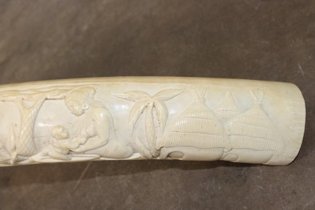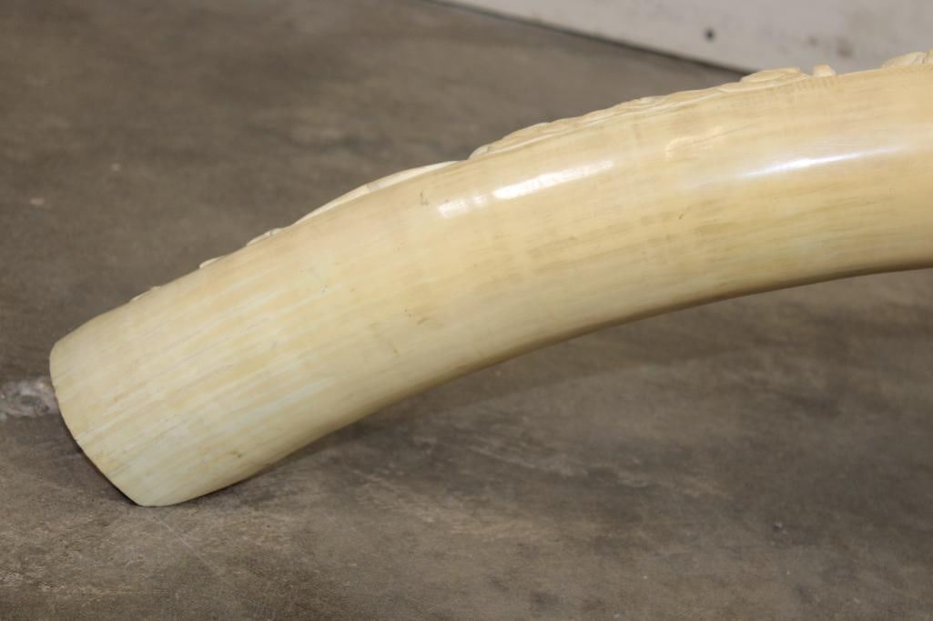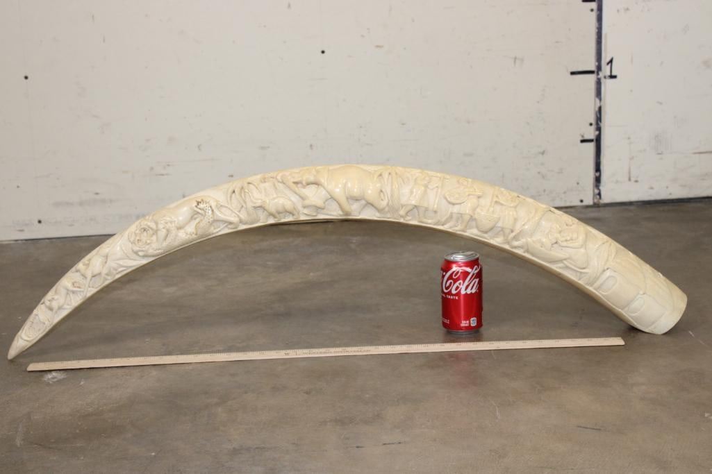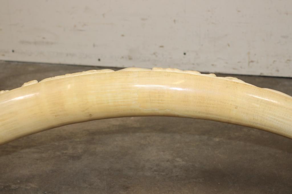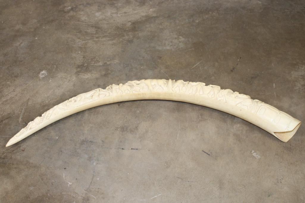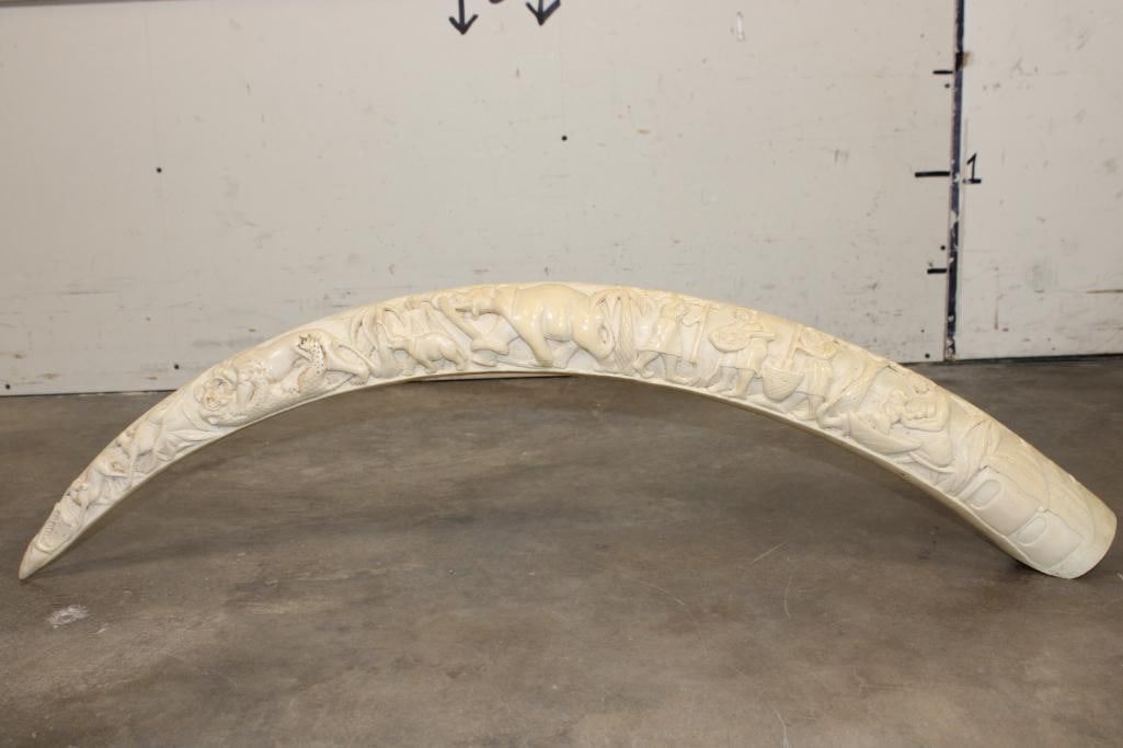 *TEXAS RESIDENTS ONLY*!!! Polished Hand-carved or Scrimshawed AFRICAN ELEPHANT IVORY Tusk. The carvings are of African animals set in a village scene. The Elephant Ivory Tusk measures 48.75" Long (around the curve) and 11.25" around the Tusk Base. The Total Weight is 14 lbs 14 oz. TAXIDERMY