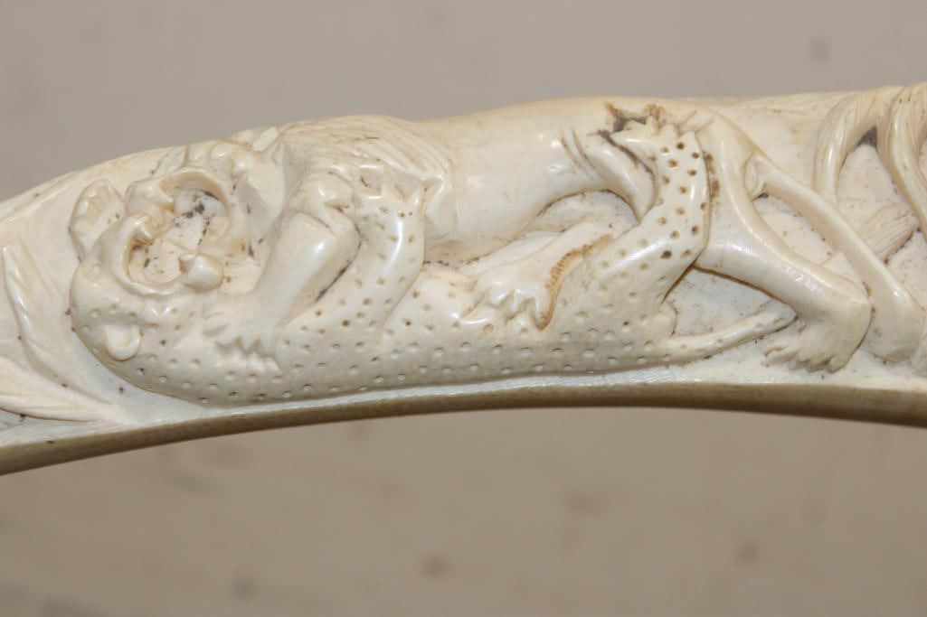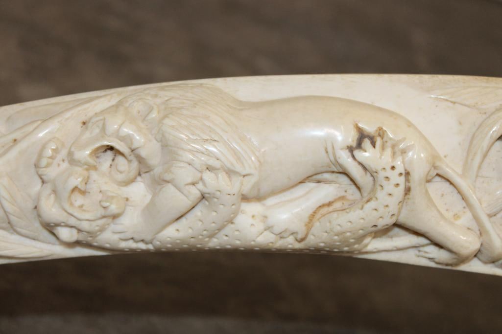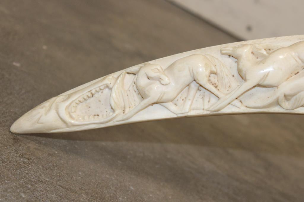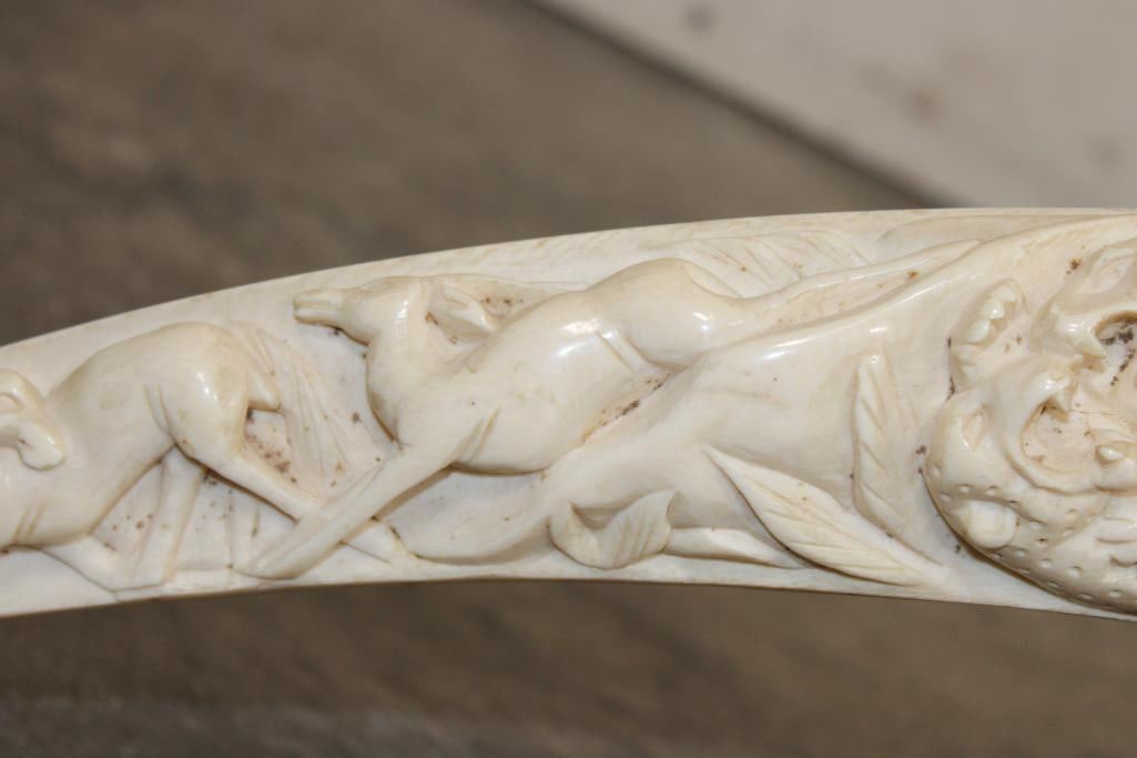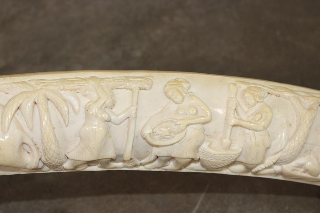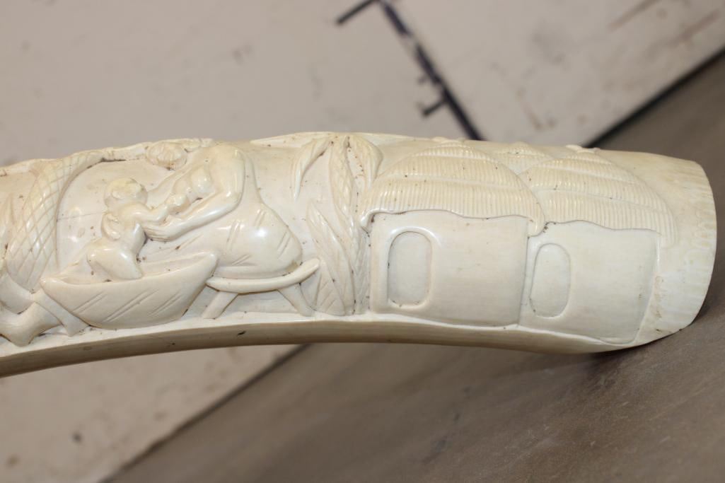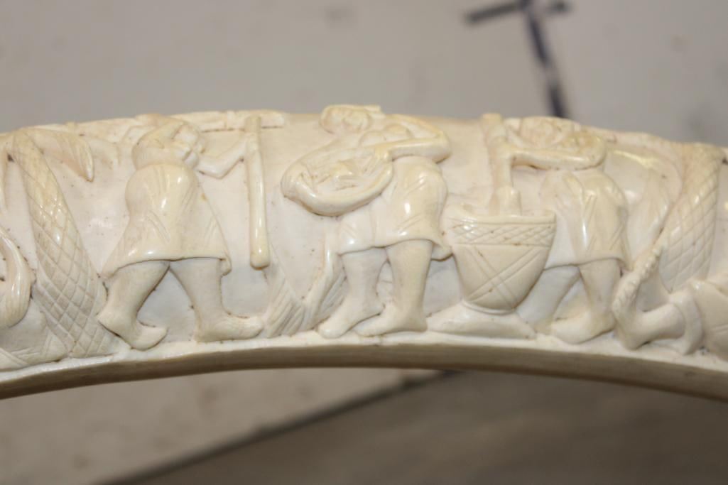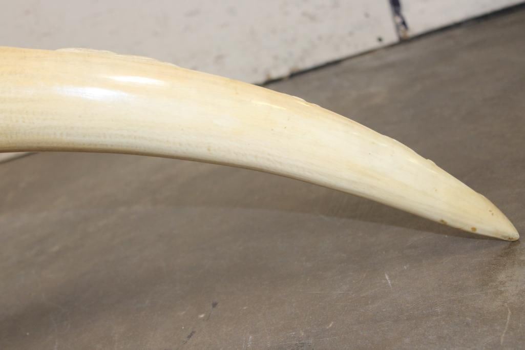 *TEXAS RESIDENTS ONLY*!!! Polished Hand-carved or Scrimshawed AFRICAN ELEPHANT IVORY Tusk. The carvings are of African animals set in a village scene. The Elephant Ivory Tusk measures 48.75" Long (around the curve) and 11.25" around the Tusk Base. The Total Weight is 14 lbs 14 oz. TAXIDERMY