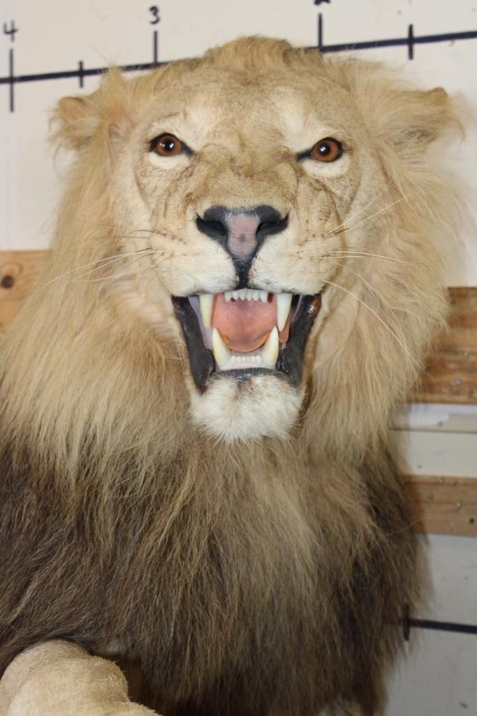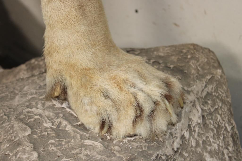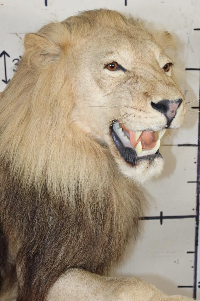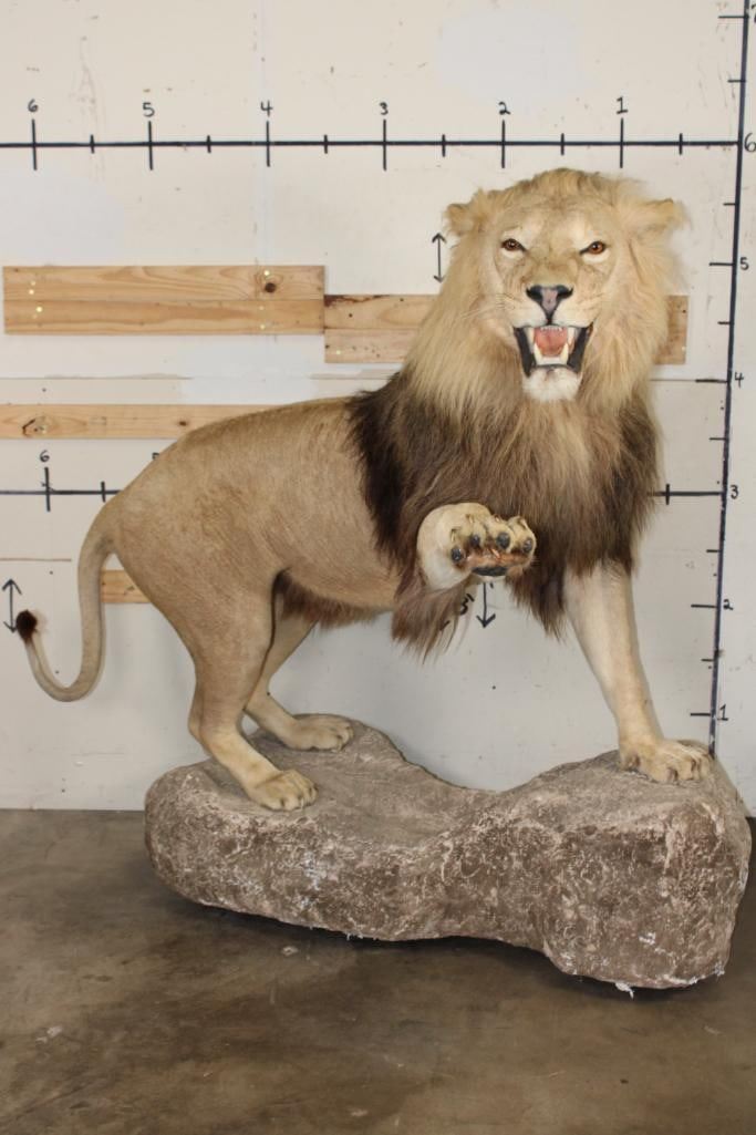 *TEXAS RESIDENTS ONLY!!!* Very Nice and Big Life-sized AFRICAN LION. It has a great face, all its claws, and an XXL Thick Mane. He is mounted in a cool pose on a reproduction rock Base with Wheels. Total measurements are 67" Long x 46" Wide x 68" Tall. This mount is in Very Good Condition. TAXIDERMY