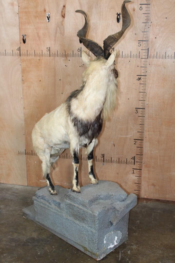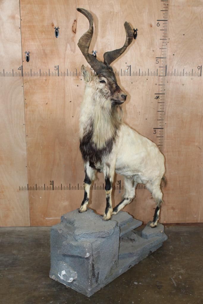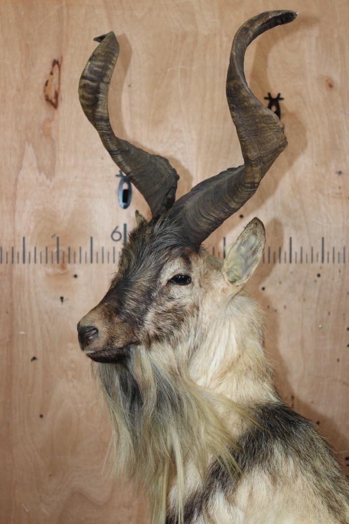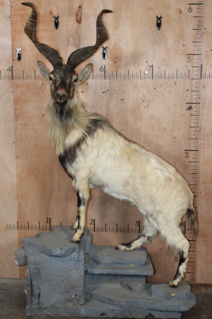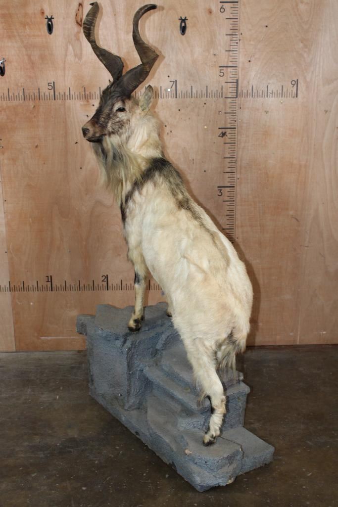 *TEXAS RESIDENTS ONLY* *Extremely Rare* Life-sized FLARE-HORNED MARKHOR. The Left Horn measures 24 7/8" Long and the Right Horn measures 24.75" Long. It is mounted on a Lightweight Rocky Base. The Total Mount measures 42" Long x 17" Wide x 71" Tall. It is in Good Condition. TAXIDERMY