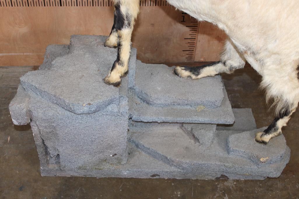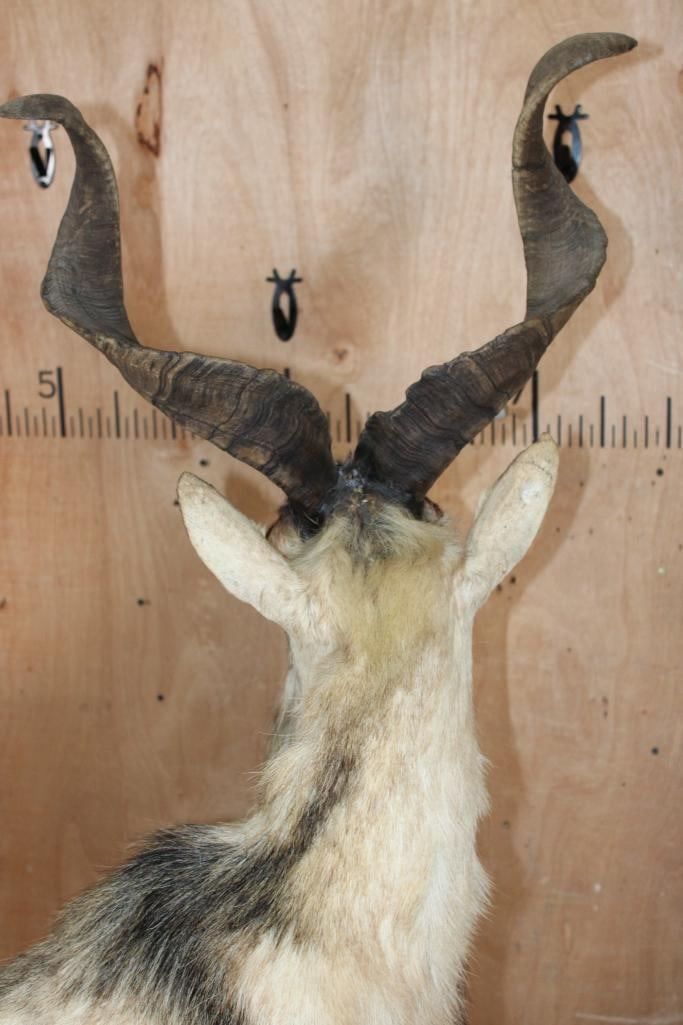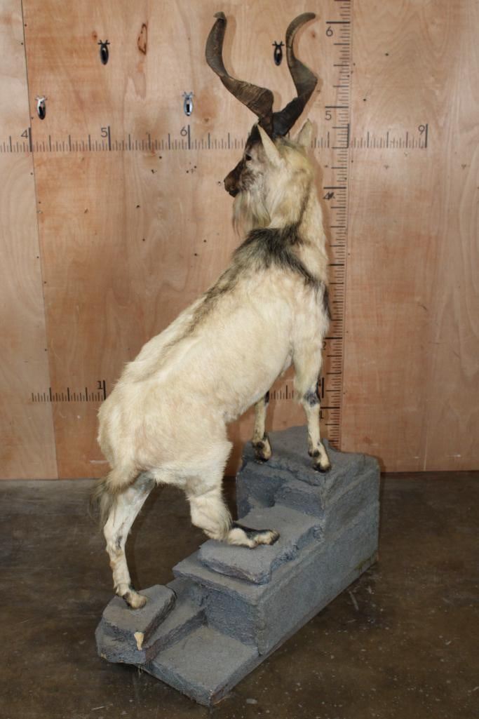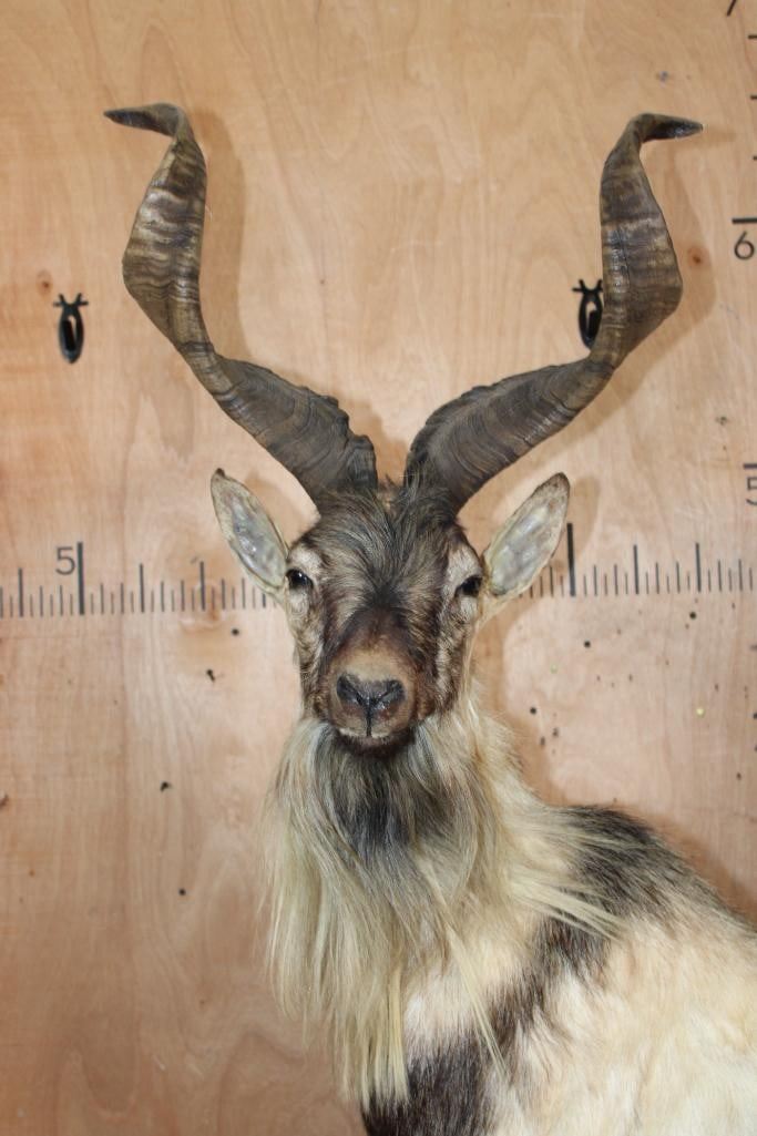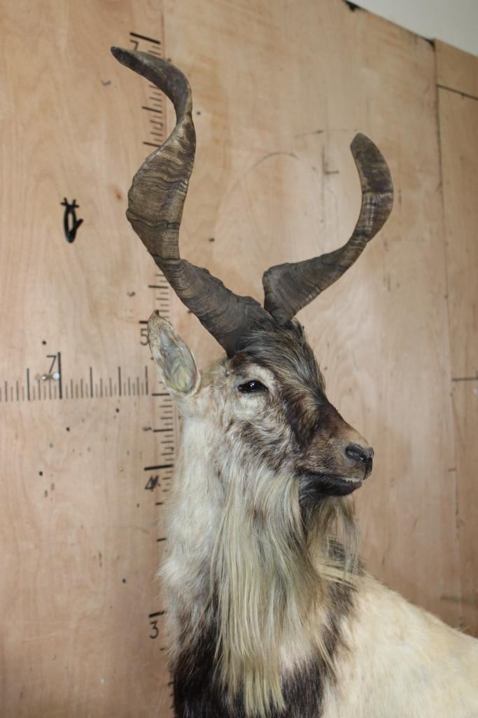 *TEXAS RESIDENTS ONLY* *Extremely Rare* Life-sized FLARE-HORNED MARKHOR. The Left Horn measures 24 7/8" Long and the Right Horn measures 24.75" Long. It is mounted on a Lightweight Rocky Base. The Total Mount measures 42" Long x 17" Wide x 71" Tall. It is in Good Condition. TAXIDERMY