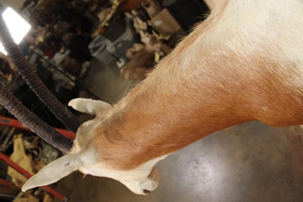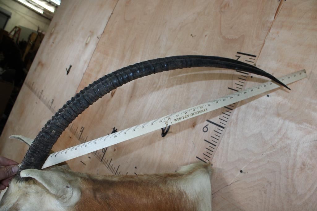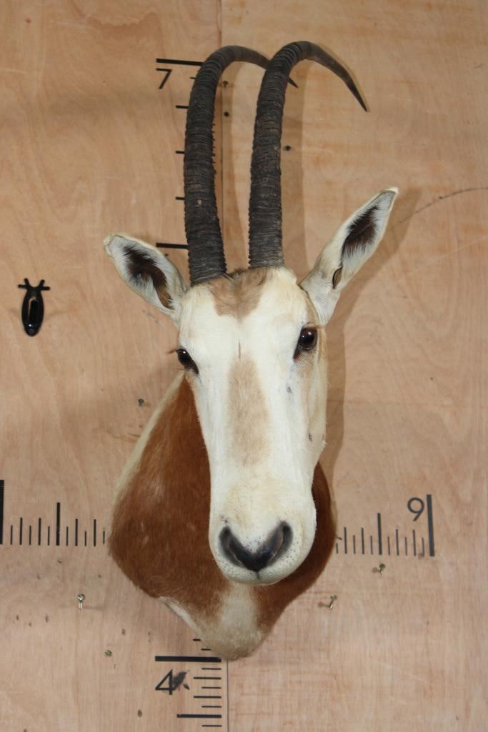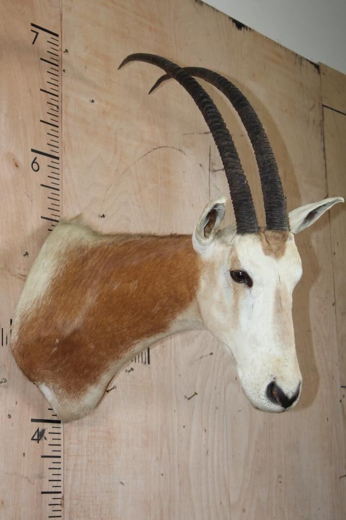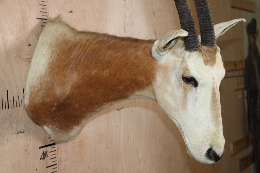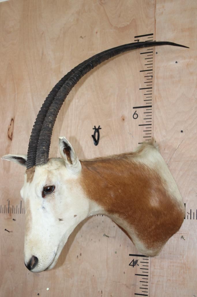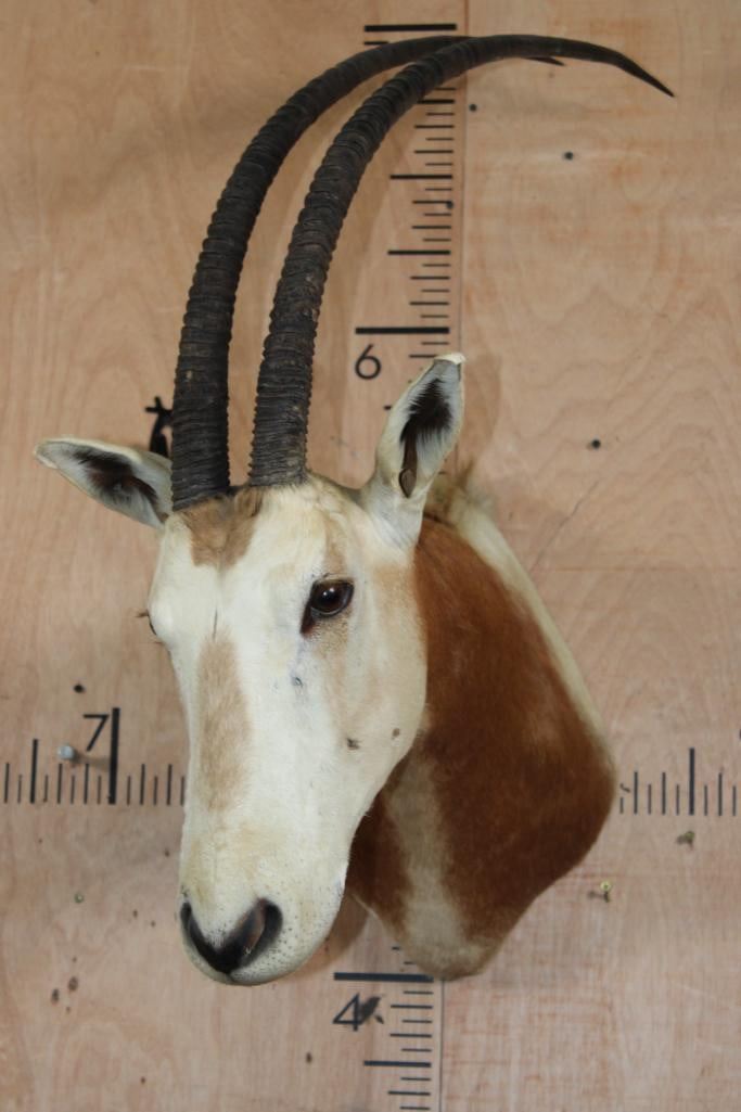 *TEXAS RESIDENTS ONLY*! SCIMITAR HORNED ORYX Shoulder Mount. The Left Horn measures 35.75" Long and the Right Horn measures 34 7/8" Long. It has a few minor blemishes, otherwise it is in Good Condition. TAXIDERMY?