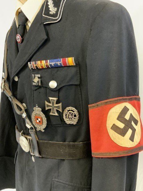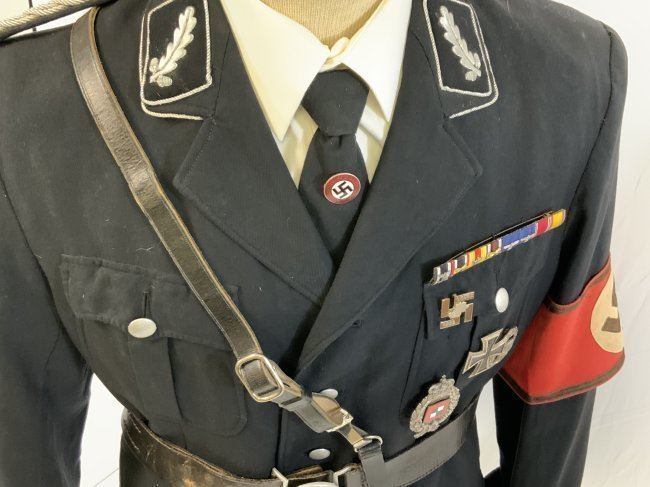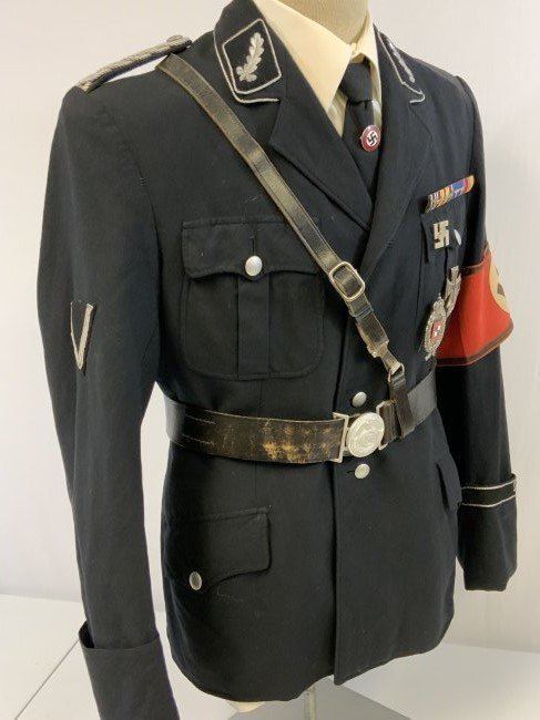 ALLGEMEINE SS - A SERVICE UNIFORM FOR AN SS-Standartenfuhrer OF SS ADMINISTRATION . RUSSIAN MOVIE STUDIO FIND . SUMMER WEIGHT TUNIC . NICE OVERALL CONDITION WITH NORMAL WEAR . MEDIUM TO LARGE SIZE . SS - HAUPTAMT CUFF TITLE. MANY AWARD LOOPS. BERCHTESGADEN TAILOR LABEL INSIDE.LOOKS LIKE CAPTURED TUNIC AND USED POSTWAR BY RUSSIAN MOVIE STUDIOUS. GREAT DISPLAY PIECE. THIS AUCTION IS FOR TUNIC ONLY . AWARDS , BELT AND SHIRT WITH TIE ARE NOT INCLUDED AND FOR A DISPLAY PURPOSES ONLY .