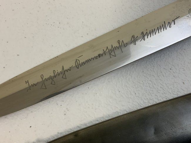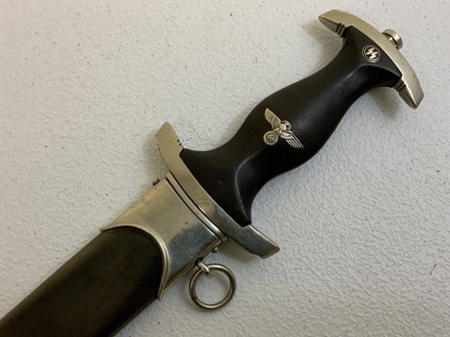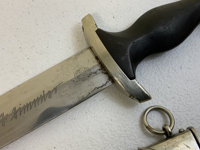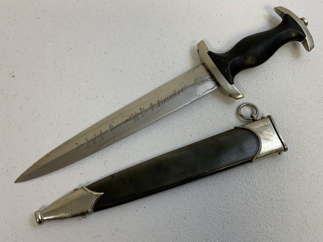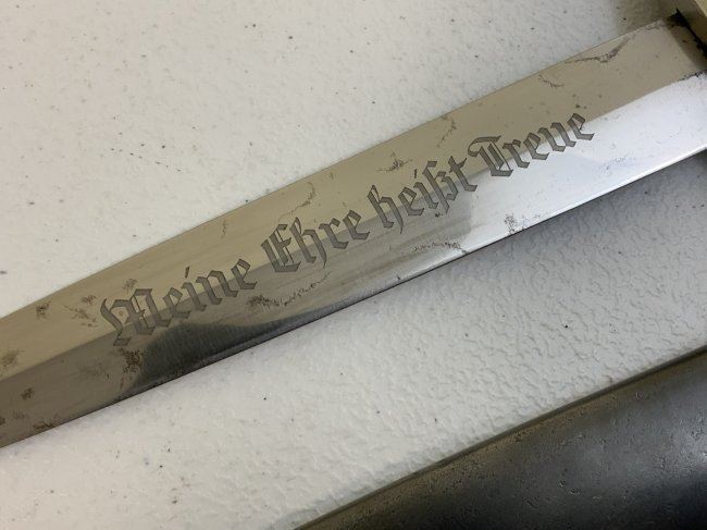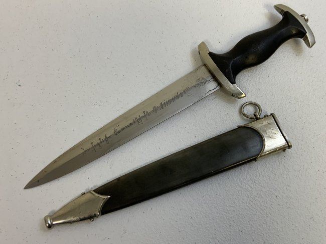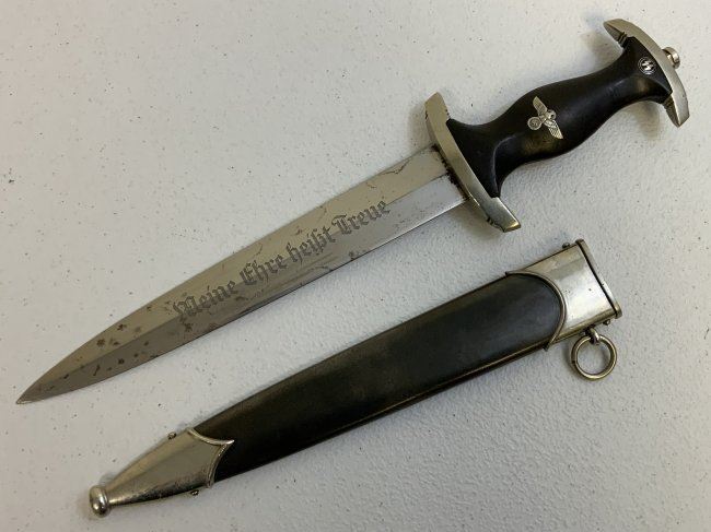 THIRD REICH GERMANY M33 SS DAGGER EICKHORN HIMMLER INSCRIBED . GREAT LOOKING EARLY QUALITY DAGGER . APPEARS TO BE A PARTS DAGGER . IN OUR OPINION THIS ONE MADE FROM ORIGINAL FITTINGS AND SCABBARD AND POST WAR REPLACEMENT BLADE . EICKHORN MARKED BLADE ALTHOUGH IS SHOWING A CORRECT AGE AND WEAR IS LIKELY A VERY HIGH QUALITY POST WAR REMAKE WITH FULL HIMMLER INSCRIPTION ETCHED ON THE BACK AND NICE DEEPLY ETCHED MOTTO ON THE FRONT. IN ANY CASE IT IS STILL A VERY NICE AND HIGHLY DESIRABLE DAGGER AND WILL FILL A SPOT IN ANY DAGGER COLLECTION .
