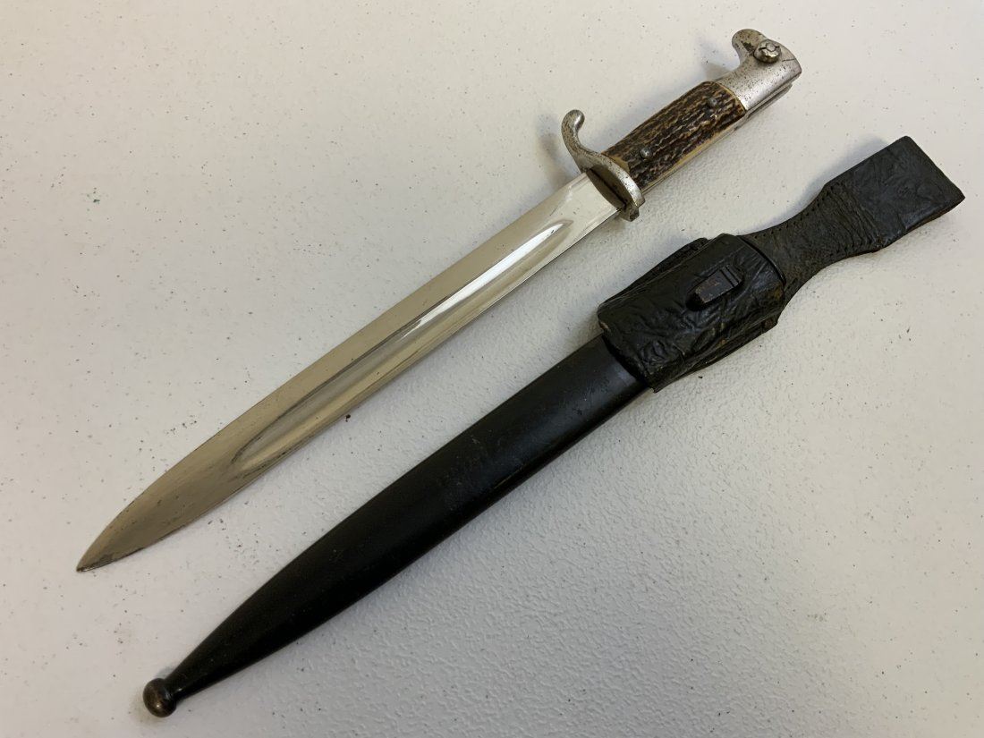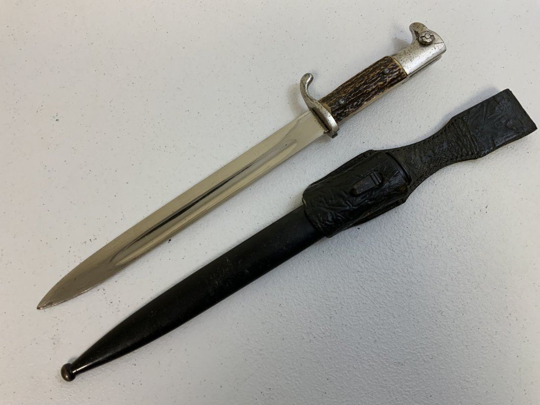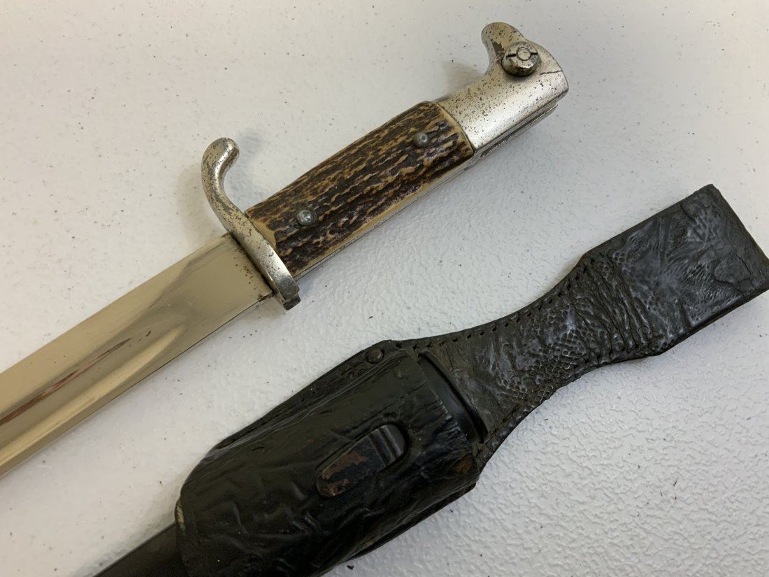 THIRD REICH GERMANY STAG GRIPS PARADE DRESS BAYONET WITH LEATHER FROG. WELL USED BUT STILL IN GOOD CONDITION OVERALL. UNMARKED BLADE . NICE THICK REAL STAG GRIPS .