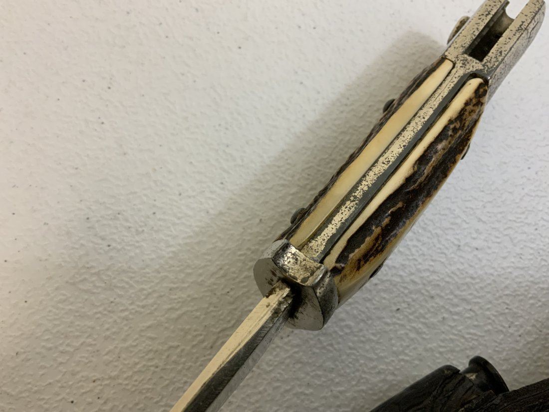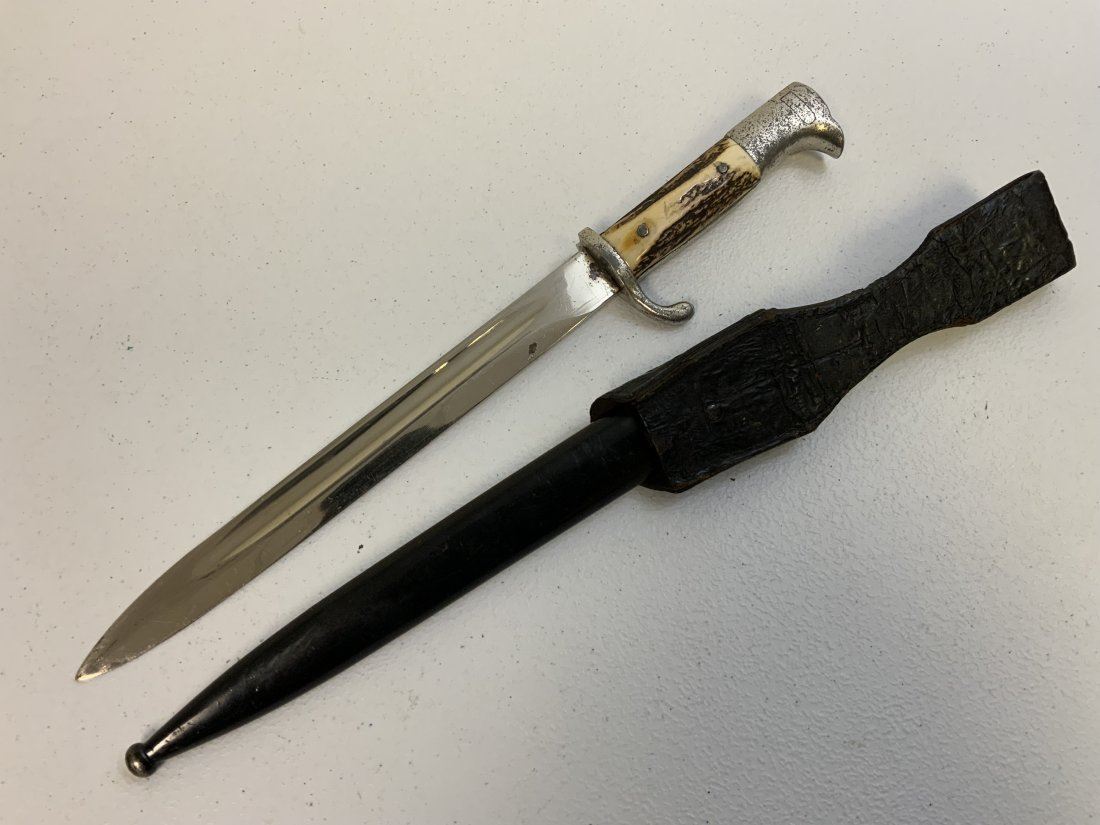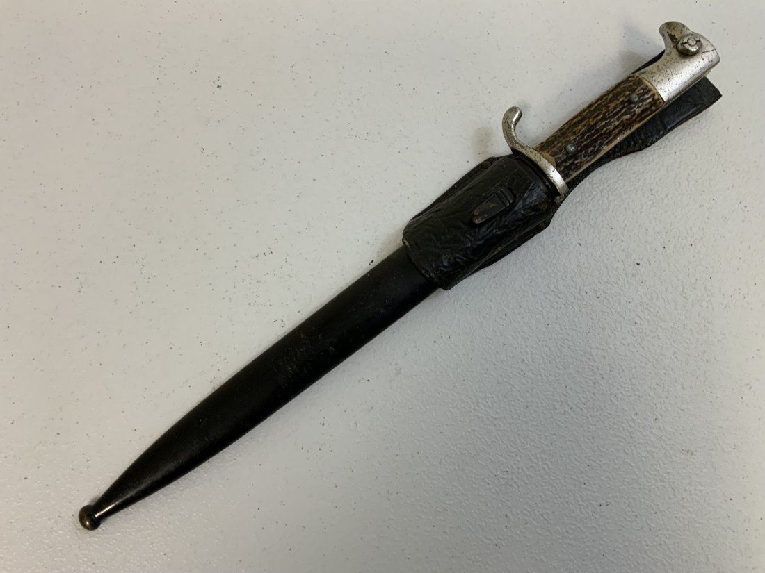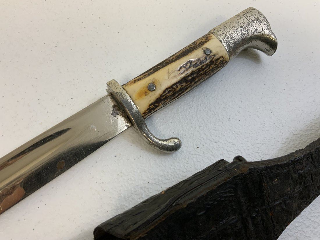 THIRD REICH GERMANY STAG GRIPS PARADE DRESS BAYONET WITH LEATHER FROG. WELL USED BUT STILL IN GOOD CONDITION OVERALL. UNMARKED BLADE . NICE THICK REAL STAG GRIPS .