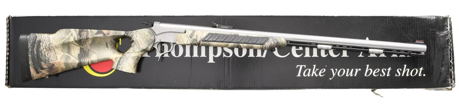 MUZZLELOADING RIFLE WITH FACTORY BOX. Cal. 50. S# PS37617. Bbl. 28 1/4". Left side of barrel is stamped "ENCORE" followed by the caliber designation and Thompson / Center Arms manufacturer information, with "PRO HUNTER" across the top, just ahead of the rear sight base. Left side of frame engraved "ENCORE" followed by a stylized "TC" logo, with "PRO HUNTER" on the right. Metal components exhibit a stainless steel finish, with the furniture being comprised of a Realtree Hardwoods camoflauge polymer thumbhole buttstock and forend. Fiber optic front sight with adjustable U-notch rear sight. UNATTACHED ACCESSORIES: matching factory cardboard box. CONDITION: metal components exhibit some scattered handling marks, with areas of discoloration present on the receiver. Mirror bore, exhibiting well defined rifling throughout. Polymer furniture shows a few mild superficial marks, but is otherwise very good. Box shows some wear, but remains sturdy and serviceable. (23-2371/MLW). MODERN. $500-750.