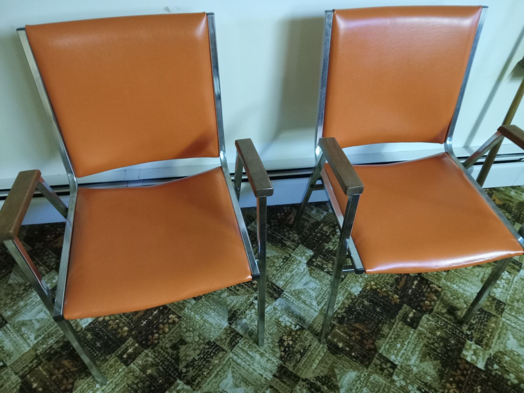 THREE CHAIRS, LITTLE HANGING SHELF WITH CONTENTS
