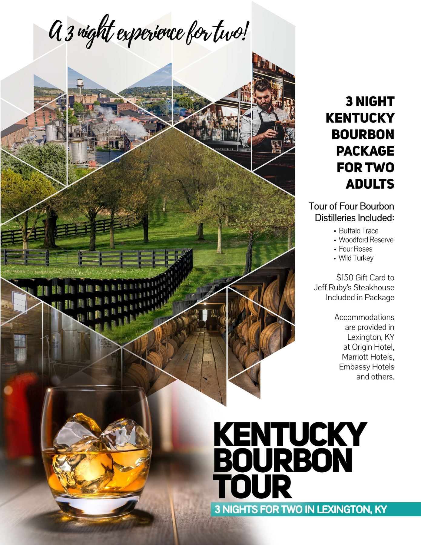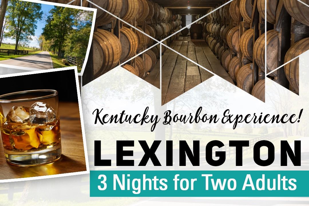 Tour of four Kentucky Bourbon distilleries and accommodations in Lexington, Kentucky for 2 adults. Includes $150 gift card to Jeff Ruby's Steakhouse.