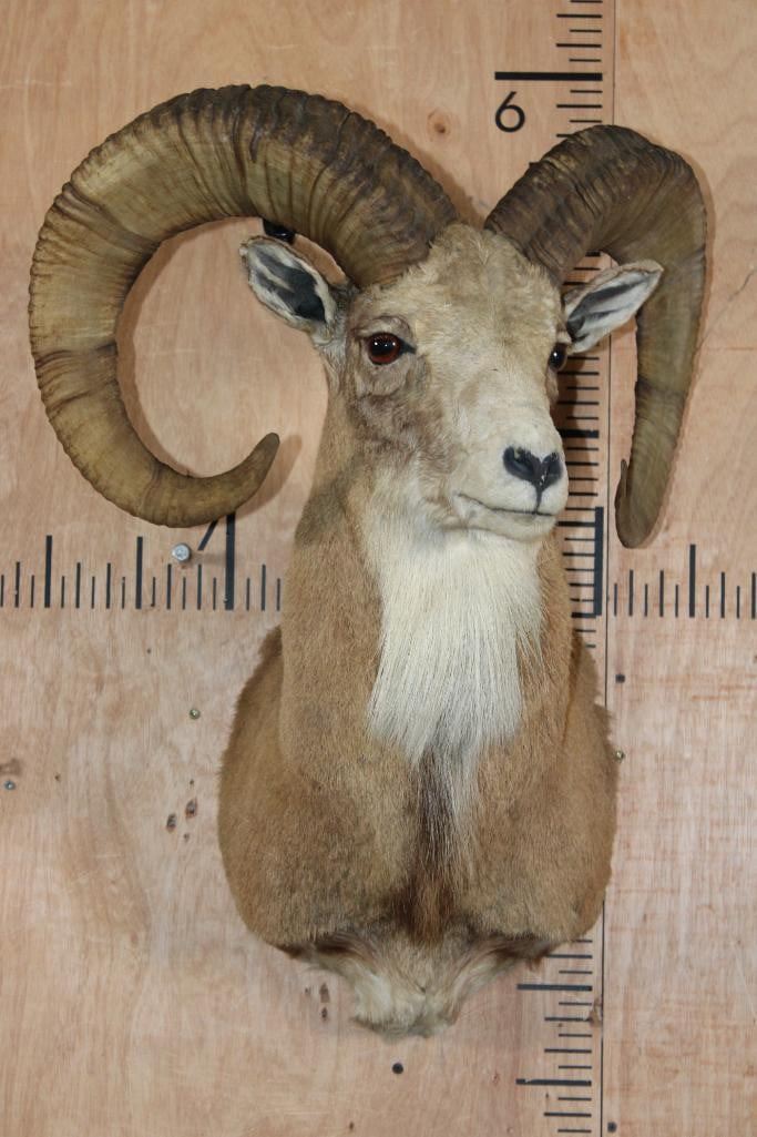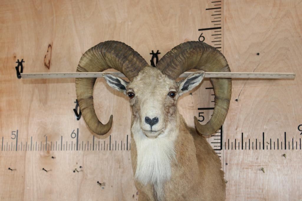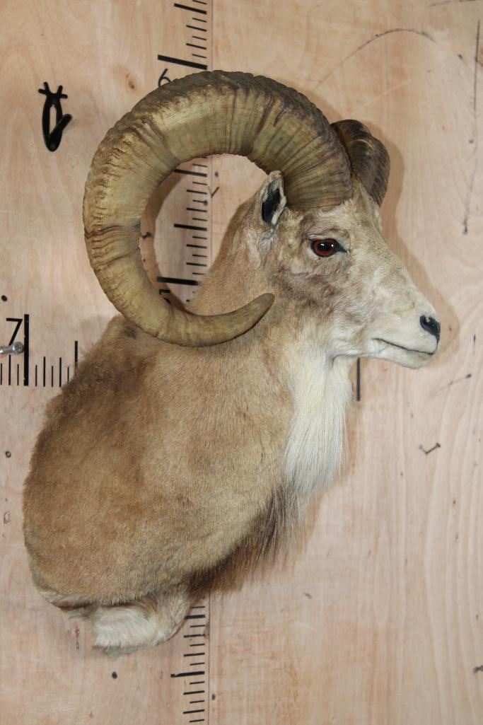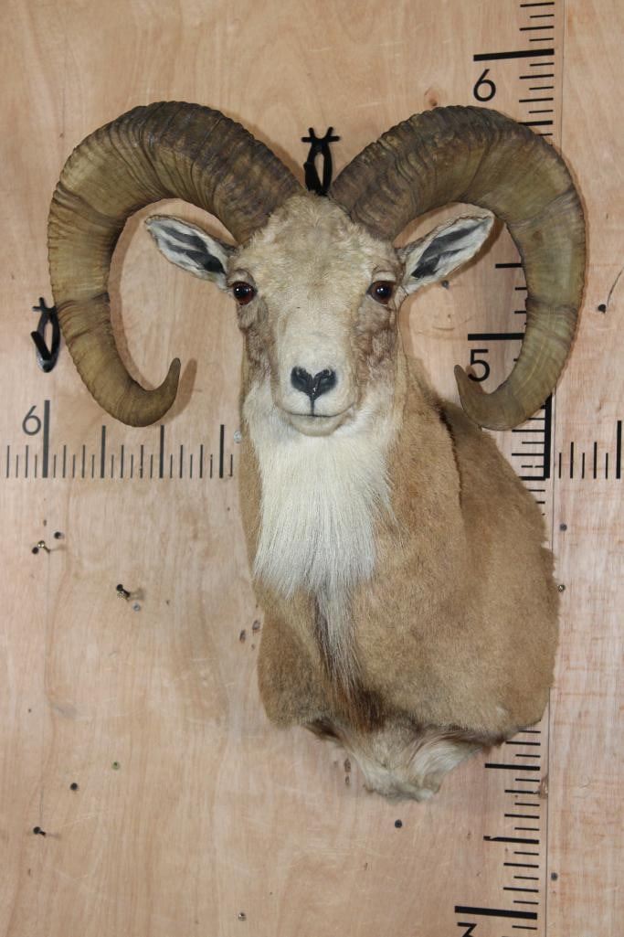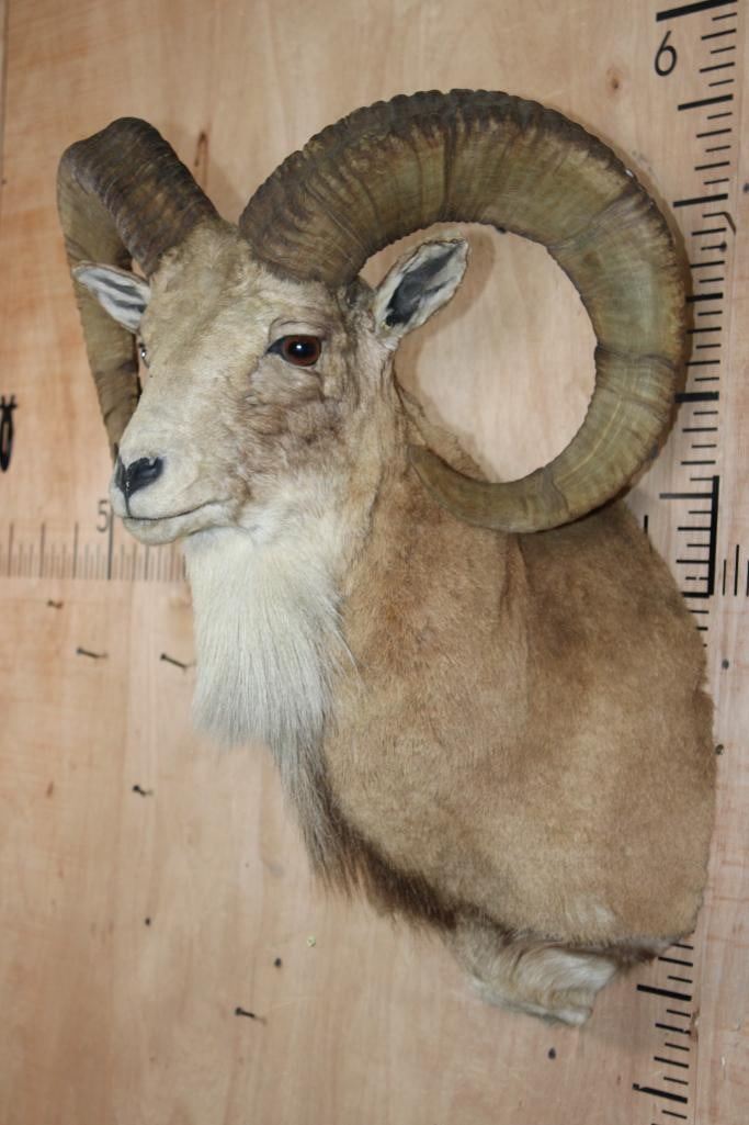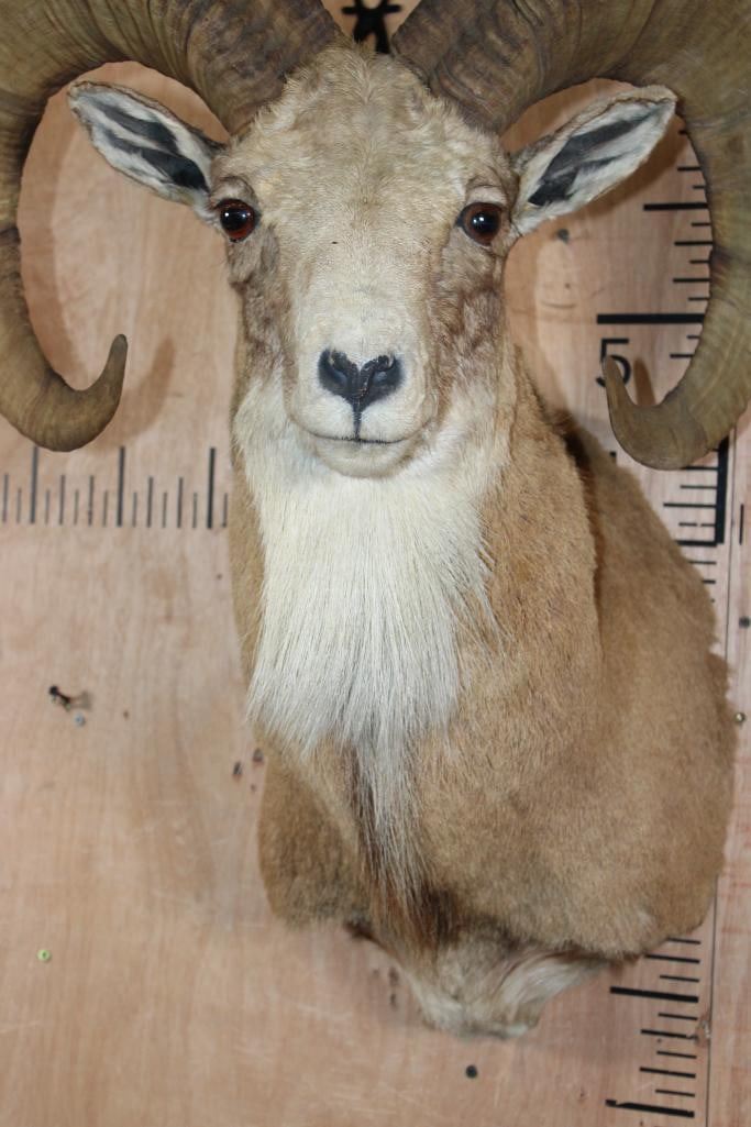 Nice TRANSCASPIAN URIAL Cross Sheep Ram Shoulder Mount. The Left Horn measures 31 3/8" Long and 10.25" around the Horn Base. The Right Horn measures 32" Long and 10 3/8" around the Horn Base. It was "Taken" in 2002 and is in Good Condition. TAXIDERMY