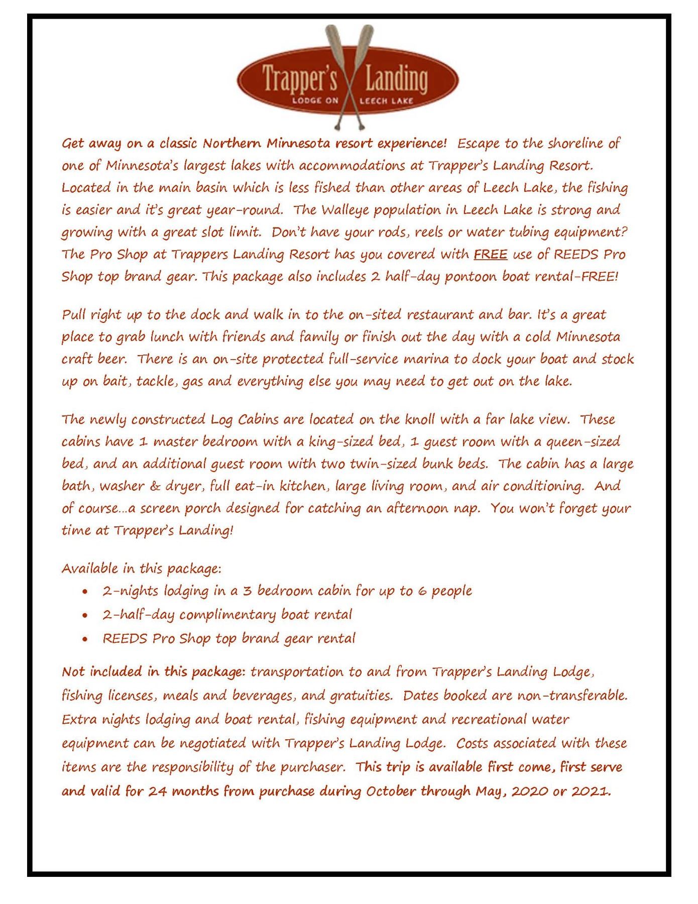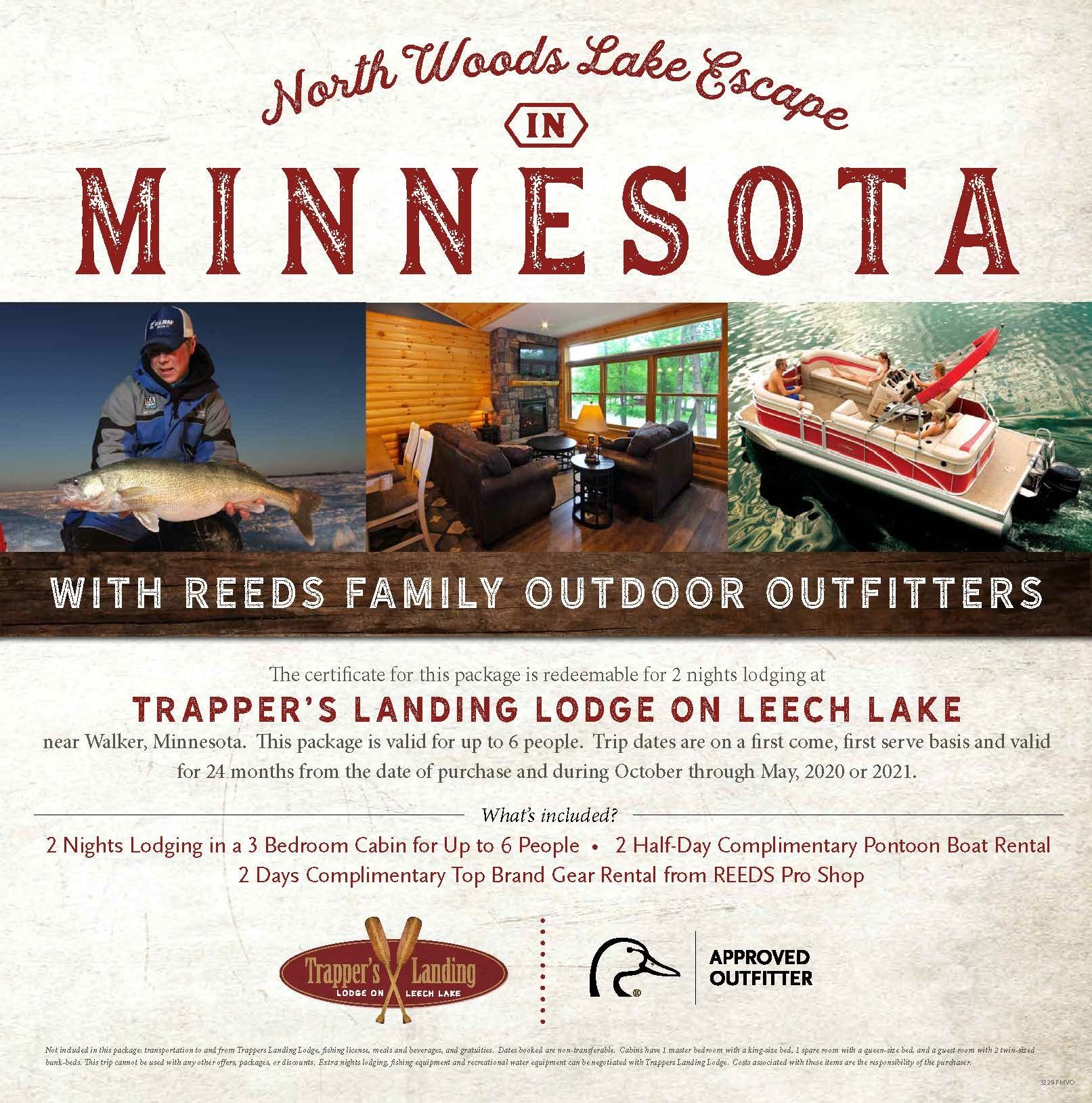 Get away on a classic Northern Minnesota resort experience! Escape to the shoreline of one of Minnesota’s largest lakes with accommodations at Trapper’s Landing Resort. Located in the main basin which is less fished than other areas of Leech Lake, the fishing is easier and it’s great year-round. The Walleye population in Leech Lake is strong and growing with a great slot limit. Don’t have your rods, reels or water tubing equipment? The Pro Shop at Trappers Landing Resort has you covered with FREE use of REEDS Pro Shop top brand gear. This package also includes 1-full day pontoon, fishing boat, or day ice house rental-FREE! Pull right up to the dock and walk in to the on-sited restaurant and bar. It’s a great place to grab lunch with friends and family or finish out the day with a cold Minnesota craft beer. There is an on-site protected full-service marina to dock your boat and stock up on bait, tackle, gas and everything else you may need to get out on the lake. The newly constructed Log Cabins are located on the knoll with a far lake view. These cabins have 1 master bedroom with a king-sized bed, 1 guest room with a queen-sized bed, and an additional guest room with two twin-sized bunk beds. The cabin has a large bath, washer & dryer, full eat-in kitchen, large living room, and air conditioning. And of course…a screen porch designed for catching an afternoon nap. You won’t forget your time at Trapper’s Landing! Available in this package: 2-nights lodging in a 3 bedroom Timberlane cabin for up to 6 people, 1-full day complimentary pontoon, fishing boat, or day ice house rental. REEDS Pro Shop top brand gear rental. Not included in this package: transportation to and from Trapper’s Landing Lodge, fishing licenses, meals and beverages, and gratuities. Dates booked are non-transferable. Extra nights lodging and boat rental, fishing equipment and recreational water equipment can be negotiated with Trapper’s Landing Lodge. Costs associated with these items are the responsibility of the purchaser. This trip is available first come, first serve and valid for 24 months from purchase during October through May.
