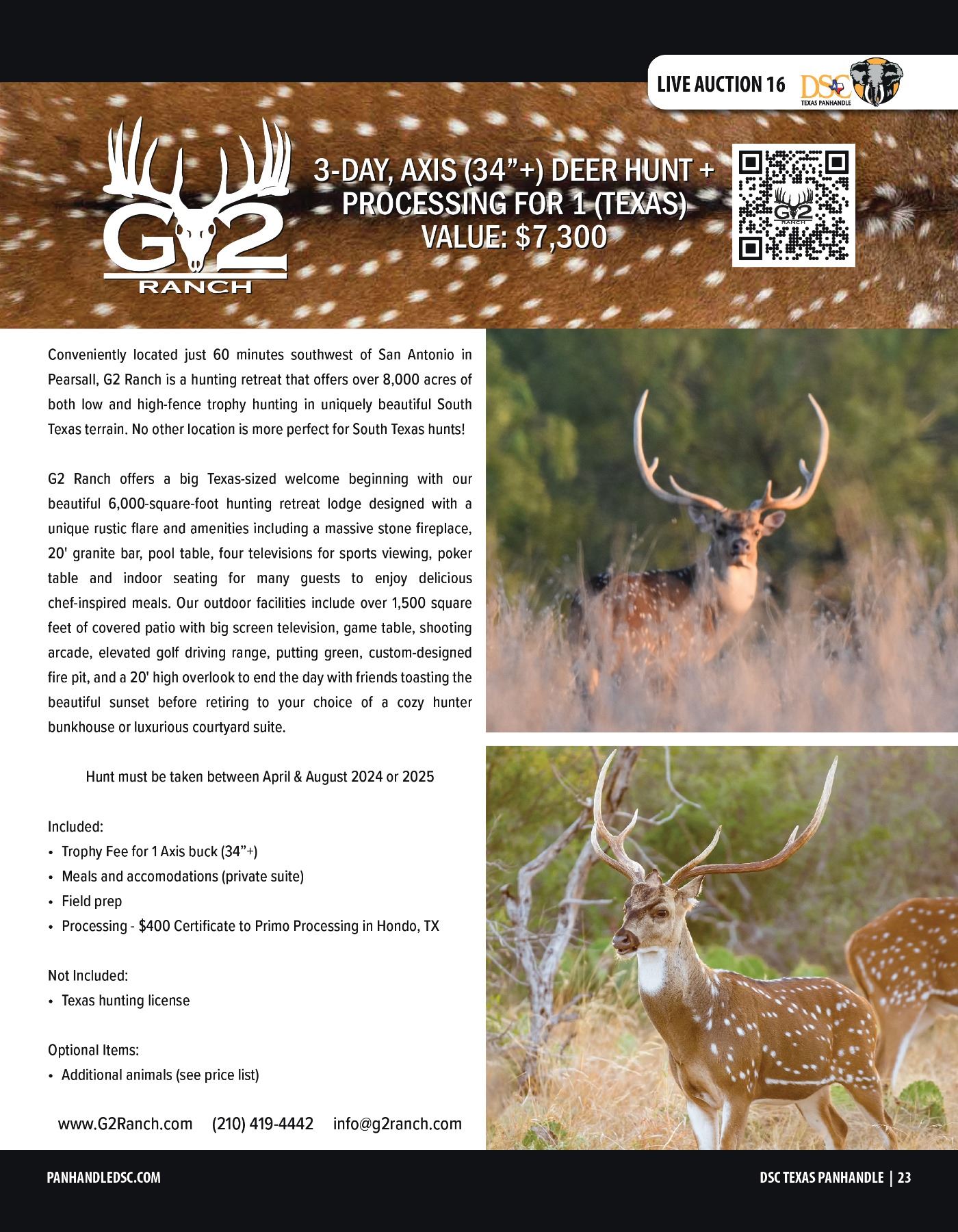 8. All items sold through DSC Texas Panhandle Chapter are received from third party vendors. GOODS: All goods in the live auctions, silent auctions and raffles have been acquired or obtained from third parties. The high bidder acknowledges that the goods have not been inspected by DSC Texas Panhandle Chapter, and is advised, in the case of firearms, knives, bullets or other weapons to secure a competent inspection and test of the goods before use. The goods in the live auctions are sold “as is” with all faults and defects, and without any express or implied warranty on the part of DSC Texas Panhandle Chapter. DSC Texas Panhandle Chapter makes no warranties of fitness or merchantability, and expressly disclaims the same. DSC Texas Panhandle Chapter does not accept any responsibility or liability for any product, design or use. Any written warranties with respect to the goods delivered to the purchaser are those solely of the manufacturer or their agents, and shall be the sole liability and responsibility of the manufacturer. All firearms obtained for this event will be transferred in accordance with federal, state and local regulations. SERVICES: All services, hunts or otherwise, in the live auctions, silent auctions and raffles have been acquired for and are to be furnished by third parties and contain the same reservation set forth under “GOODS” above. The services in the live auctions are sold “as is” with all faults and defects, and without any express or implied warranty on the part of DSC Texas Panhandle Chapter. DSC Texas Panhandle Chapter makes no warranties of fitness or merchantability, and expressly disclaims the same. No services in the live auctions are to be or will be performed by DSC Texas Panhandle Chapter. DSC Texas Panhandle Chapter shall bear no responsibilities for the delivery or quality of any of the services or for any loss or damages arising from or related to or connected with the performance or non-performance of such services. The high bidder further acknowledges that in the event services are purchased, DSC Texas Panhandle Chapter cannot be responsible for or liable for any political unrest or instability that may occur outside the confines of the United States, nor can DSC Texas Panhandle Chapter be accountable for any injuries or damages that may arise there from. The high bidder further acknowledges that his/her purchase is final and non-refundable under any and all circumstances, and that should legal action be required to collect for the services or merchandise acquired by the high bidder at the auction, DSC Texas Panhandle Chapter shall be entitled to all reasonable attorney’s fees, cost of court and interest as provided by law.