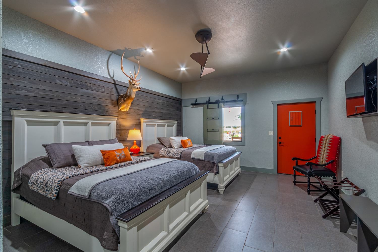 G2 Ranch offers a big Texas-sized welcome beginning with our beautiful 6,000-square-foot hunting retreat lodge designed with a unique rustic flare and amenities including a massive stone fireplace, 20' granite bar, pool table, four televisions for sports viewing, poker table and indoor seating for many guests to enjoy delicious chef-inspired meals. Our outdoor facilities include over 1,500 square feet of covered patio with big screen television, game table, shooting arcade, elevated golf driving range, putting green, custom-designed fire pit, and a 20' high overlook to end the day with friends toasting the beautiful sunset before retiring to your choice of a cozy hunter bunkhouse or luxurious courtyard suite.