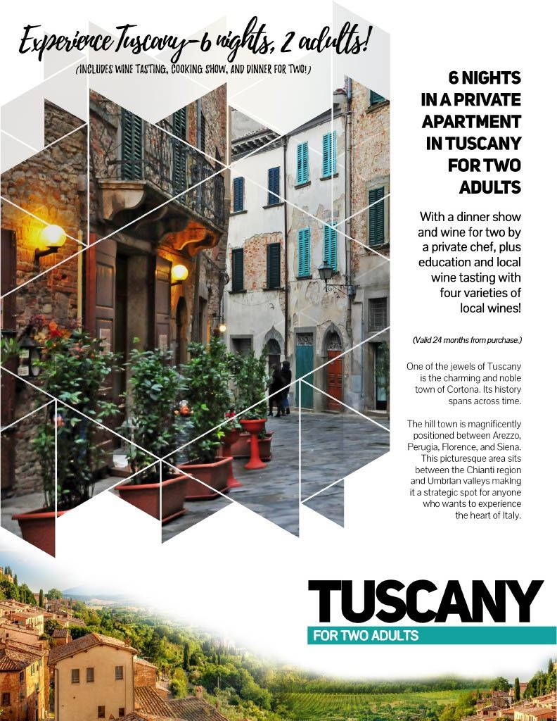Private apartment in Cortona, Italy; One bedroom/ One bath. Dinner show and wine for two by a private chef.Ê Wine education and local wine tasting with four varietals of local wines.Ê This certificate provides six nightsÕ accommodations in Cortona, Italy for two adults. Expiration of this certificate is 24 months from purchase date. Airfare and Transportation not included. Accommodations are subject to availability. This package includes cooking show with dinner for two. Wine is included. This package includes a wine tasting of local varietals for two. Your personal travel concierge can arrange excursions and transportation upon request.Ê Donation value $4000, Reserve $1,995