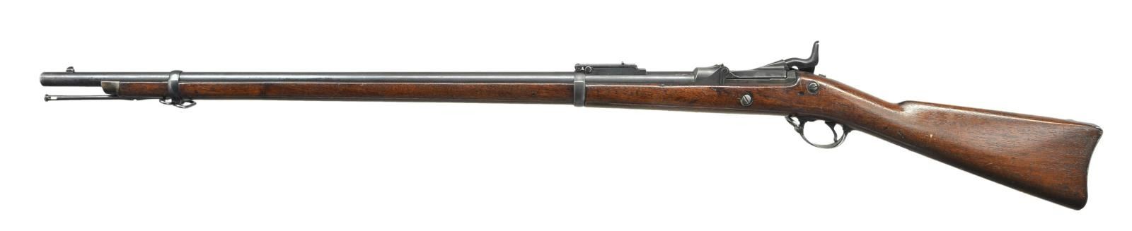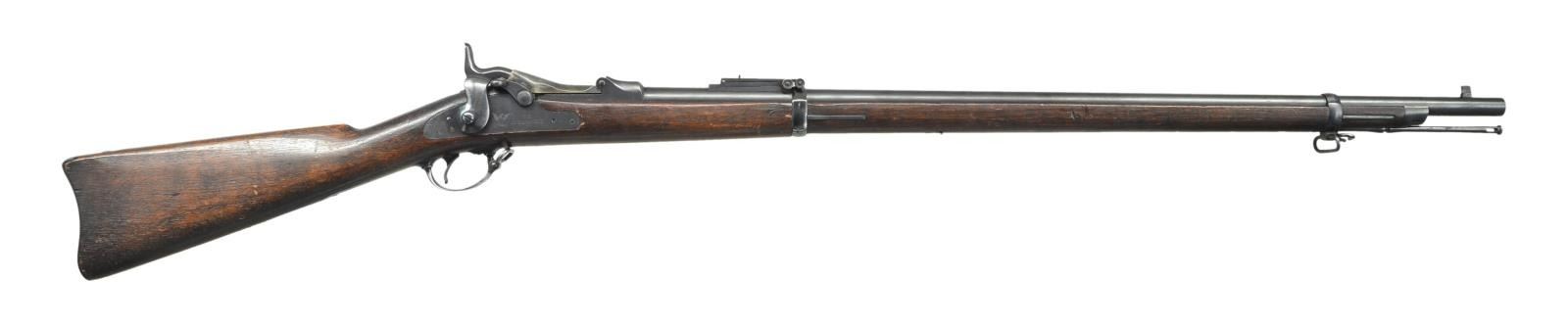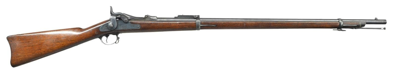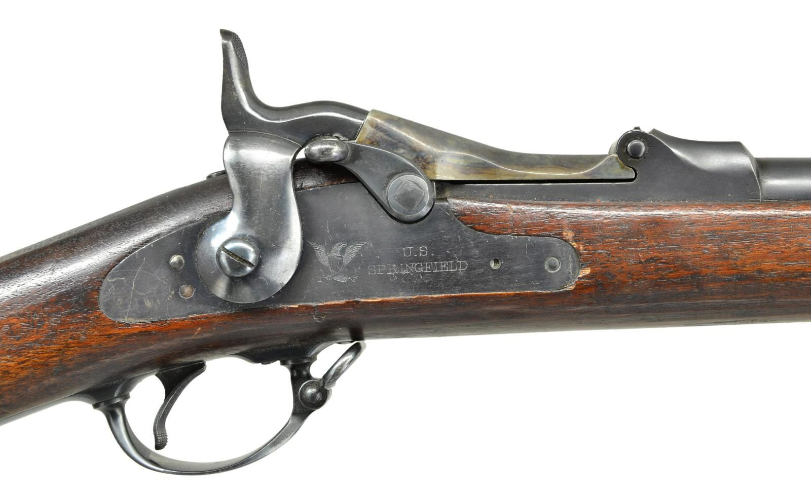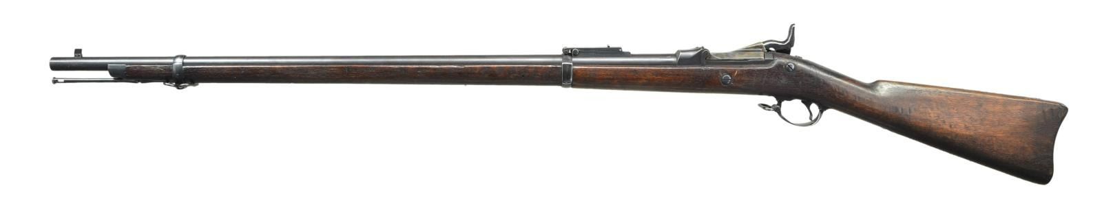 RIFLES. 2 U.S. Indian War Era: 1) Cal. 45-70. S# 424979. Bbl. 32". Buffington ladder rear sight marked "R" on top of ladder graduated to 1400 yards. Blade front sight. Flat lockplate marked "US SPRINGFIELD". Low arched breechblock is marked "US MODEL 1878". Bbl. is marked over chamber w/ "VP" "eagle" acceptance stamp "P" "A". Late type hammer. Walnut stock secured by 2 bands. Late type ramrod. Buttplate tang is marked "US". CONDITION: stock has been given an arsenal rework type finish w/ added finish rendering markings obscure. Metal has 75% arsenal rework type blue finish w/ thinning & light wear. Bore has sharp lands w/ scattered pitting throughout. 2) Cal. 45-70. S# 136832. Bbl. 32" w/ Buffington ladder rear sight graduated to 1400 yards. Marked "R" on top of ladder. Blade front sight. Original sight blade replaced w/ taller blade. Flat lock plate marked "U.S. SPRINGFIELD" "eagle". Late type hammer. Late type ramrod. Case colored breech block marked "U.S. MODEL 1873". Bbl. is marked on top left over chamber "VP" "eagle" head acceptance mark "P" & marked over chamber w/ tiny "R". Long comb walnut stock. Buttplate is marked "US". CONDITION: stock set has been given a hobbyist gunsmith type refinish. Stock has been heavily scrape to remove old finish which renders markings illegible. Metal retains 75% arsenal rework blued finish except replacement breech block shows large degree of original case colors. Very good shiny bore. PROVENANCE: From the Lifelong Collection of Glen E. Mattox. (01-22496/RW). ANTIQUE. $800-1,000.