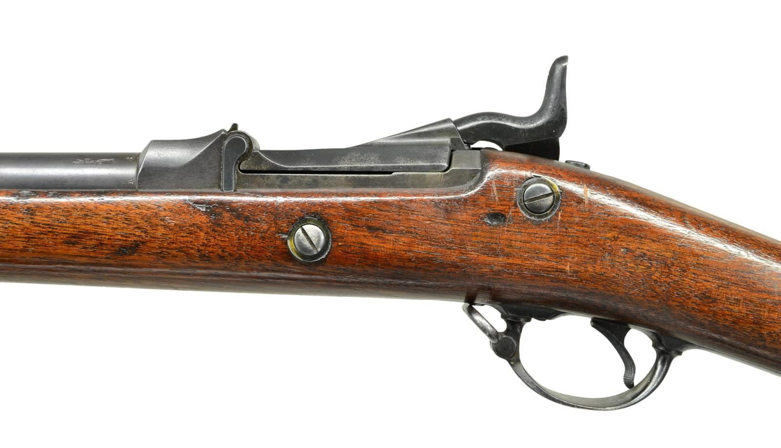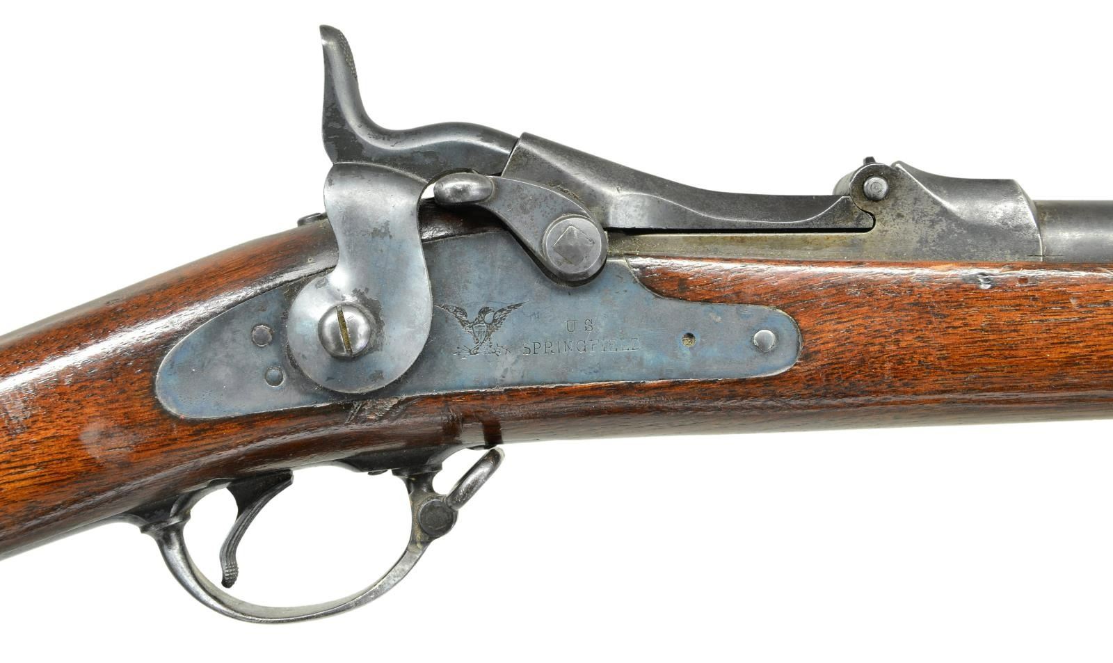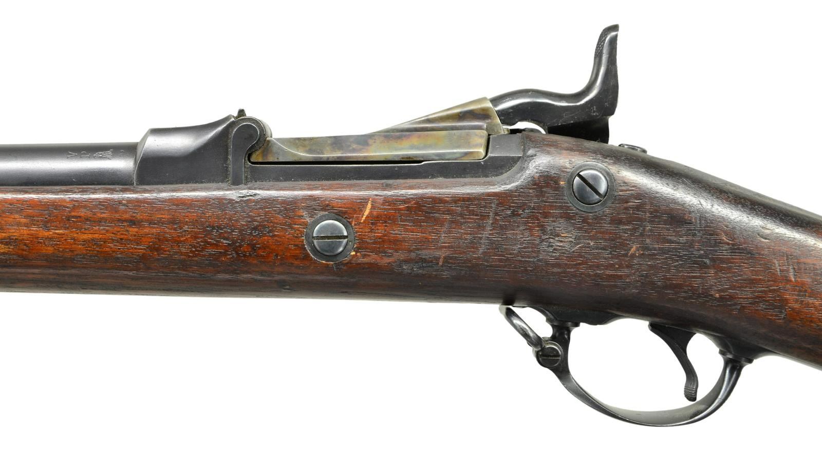 RIFLES. 2 U.S. Indian War Era: 1) Cal. 45-70. S# 424979. Bbl. 32". Buffington ladder rear sight marked "R" on top of ladder graduated to 1400 yards. Blade front sight. Flat lockplate marked "US SPRINGFIELD". Low arched breechblock is marked "US MODEL 1878". Bbl. is marked over chamber w/ "VP" "eagle" acceptance stamp "P" "A". Late type hammer. Walnut stock secured by 2 bands. Late type ramrod. Buttplate tang is marked "US". CONDITION: stock has been given an arsenal rework type finish w/ added finish rendering markings obscure. Metal has 75% arsenal rework type blue finish w/ thinning & light wear. Bore has sharp lands w/ scattered pitting throughout. 2) Cal. 45-70. S# 136832. Bbl. 32" w/ Buffington ladder rear sight graduated to 1400 yards. Marked "R" on top of ladder. Blade front sight. Original sight blade replaced w/ taller blade. Flat lock plate marked "U.S. SPRINGFIELD" "eagle". Late type hammer. Late type ramrod. Case colored breech block marked "U.S. MODEL 1873". Bbl. is marked on top left over chamber "VP" "eagle" head acceptance mark "P" & marked over chamber w/ tiny "R". Long comb walnut stock. Buttplate is marked "US". CONDITION: stock set has been given a hobbyist gunsmith type refinish. Stock has been heavily scrape to remove old finish which renders markings illegible. Metal retains 75% arsenal rework blued finish except replacement breech block shows large degree of original case colors. Very good shiny bore. PROVENANCE: From the Lifelong Collection of Glen E. Mattox. (01-22496/RW). ANTIQUE. $800-1,000.