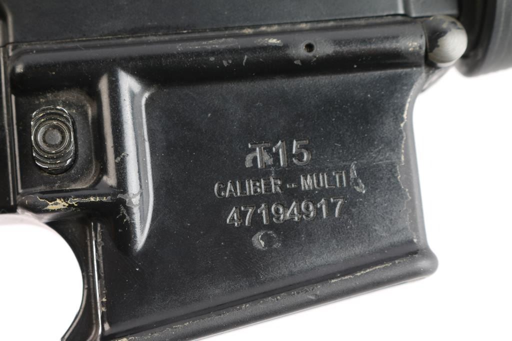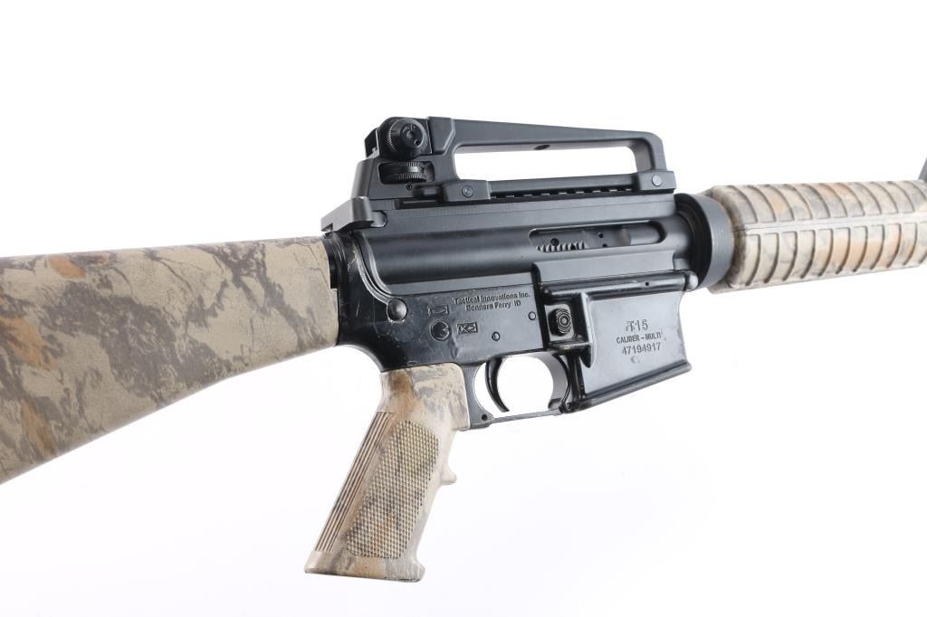 Semi-automatic AR-15 rifle chambered in 5.56 NATO. Features a black anodized upper receiver and a black painted lower, a DTI 16" pencil profile barrel with a 1/9 twist, A2 front sight post w/bayonet lug, A2 flash hider and carry handle rear sight, standard charging handle, thumb safety, bolt release button, push button magazine release and sling swivels. The flattop upper has no ejection port cover or brass deflector. Tan Woodland camo style carbine forend, A2 grip, and A2 shoulder stock w/storage compartment. Bore is very good/slightly dirty, Retains approx. 90% finish w/scrapes, scratches and edge losses. Stock and forend have no visible losses or marks. NRA condition is good to very good. ***Modern Firearm***